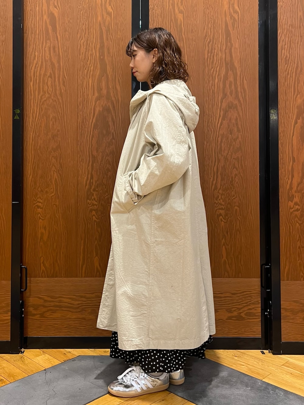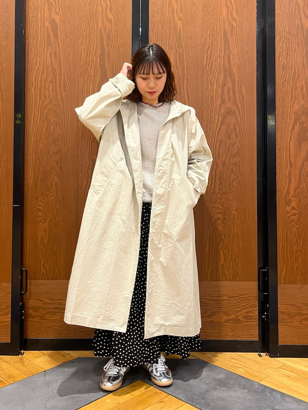ドット柄のスカートが甘めなのでカジュアルなアウターを合わせてカジュアルダウンしたスタイルに!