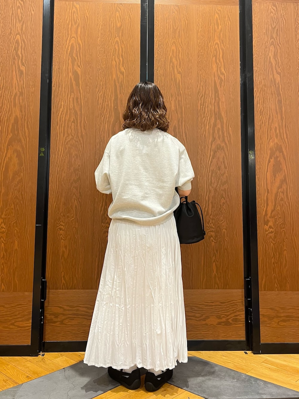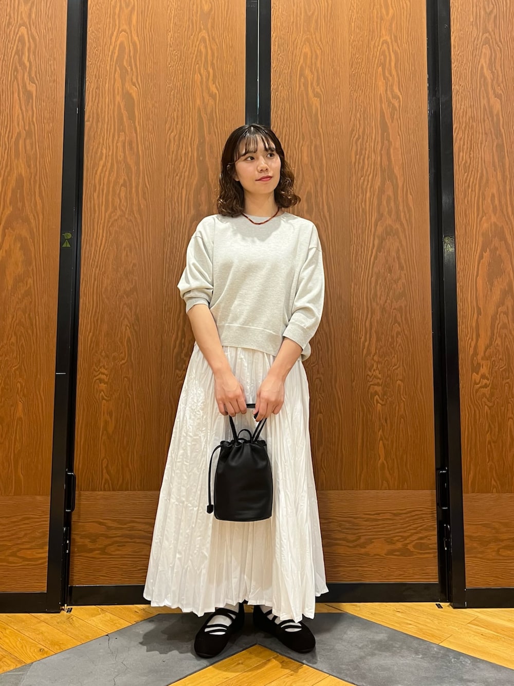ラメ感のあるスウェットライクなトップスにプリーツスカートで甘さを出した女性らしいスタイル!