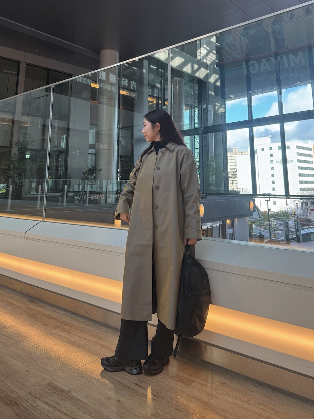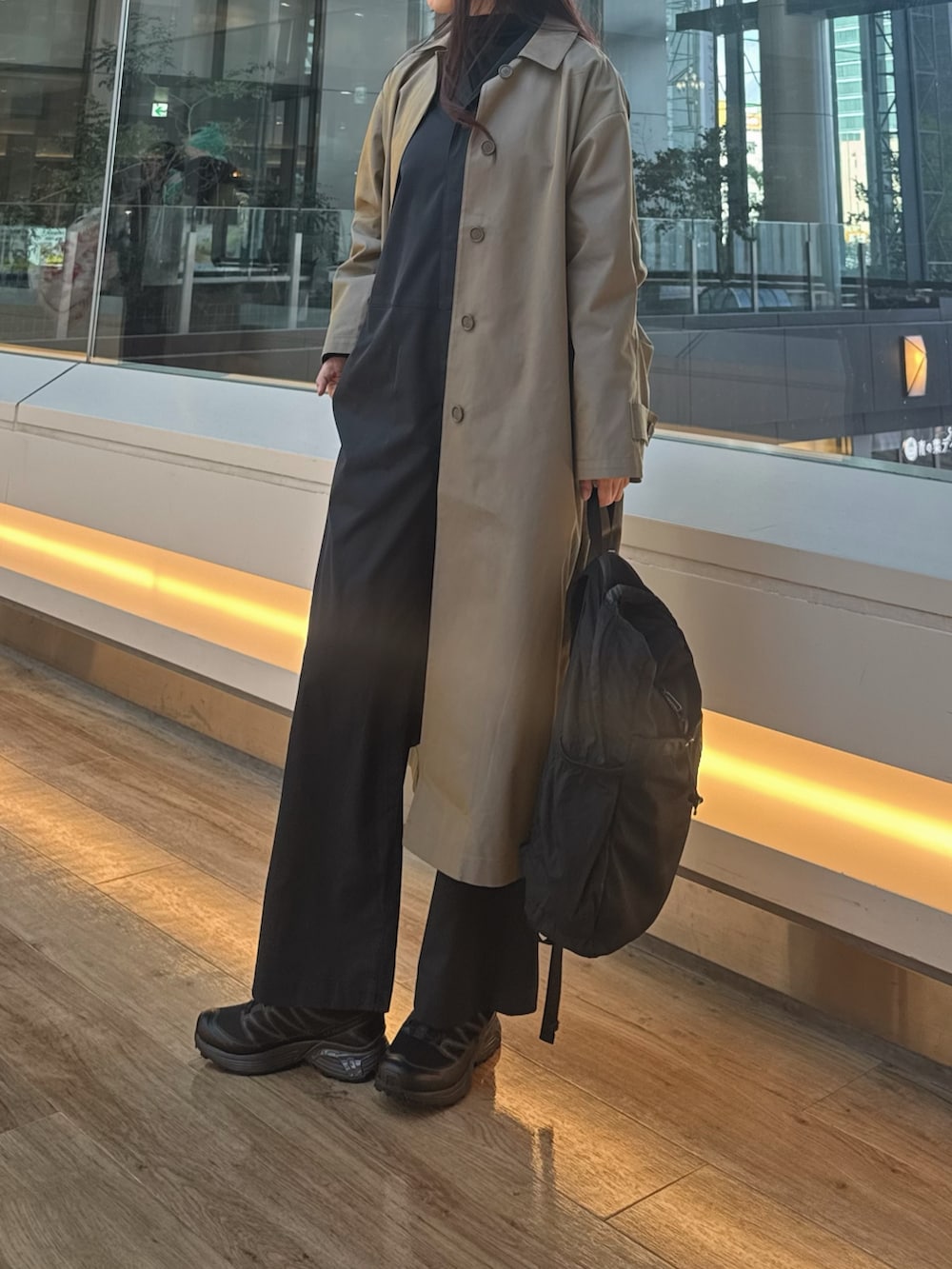 アウターもジャンプスーツと合わせてEKALを使用!光沢感あるカーキの色味は他にはない1着です✨コーデのポイントにもなります!