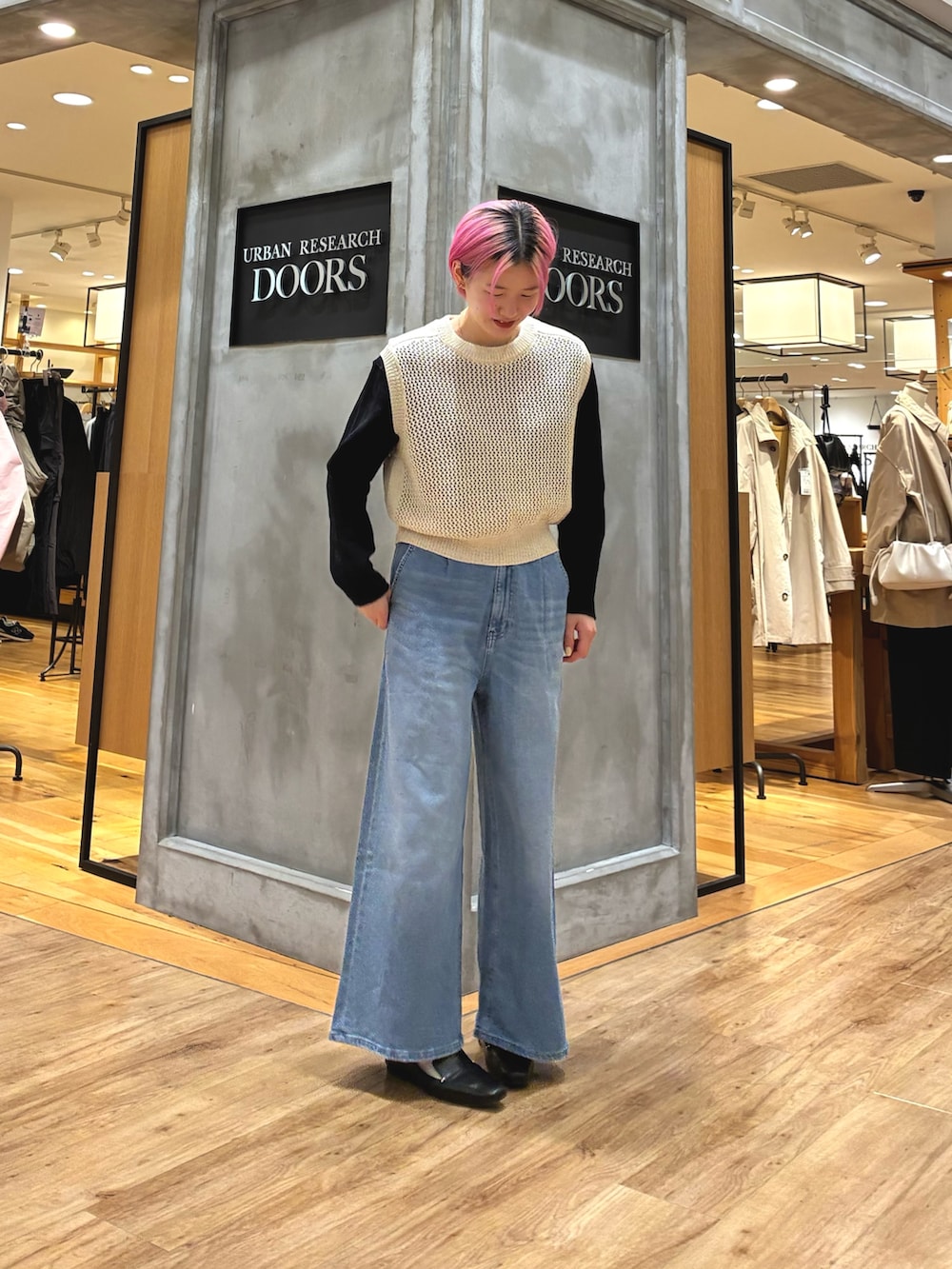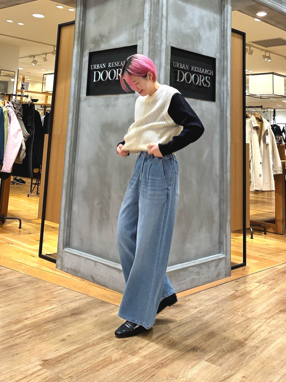メッシュベストでシンプルすぎず、タックデニムでシルエット良く!!