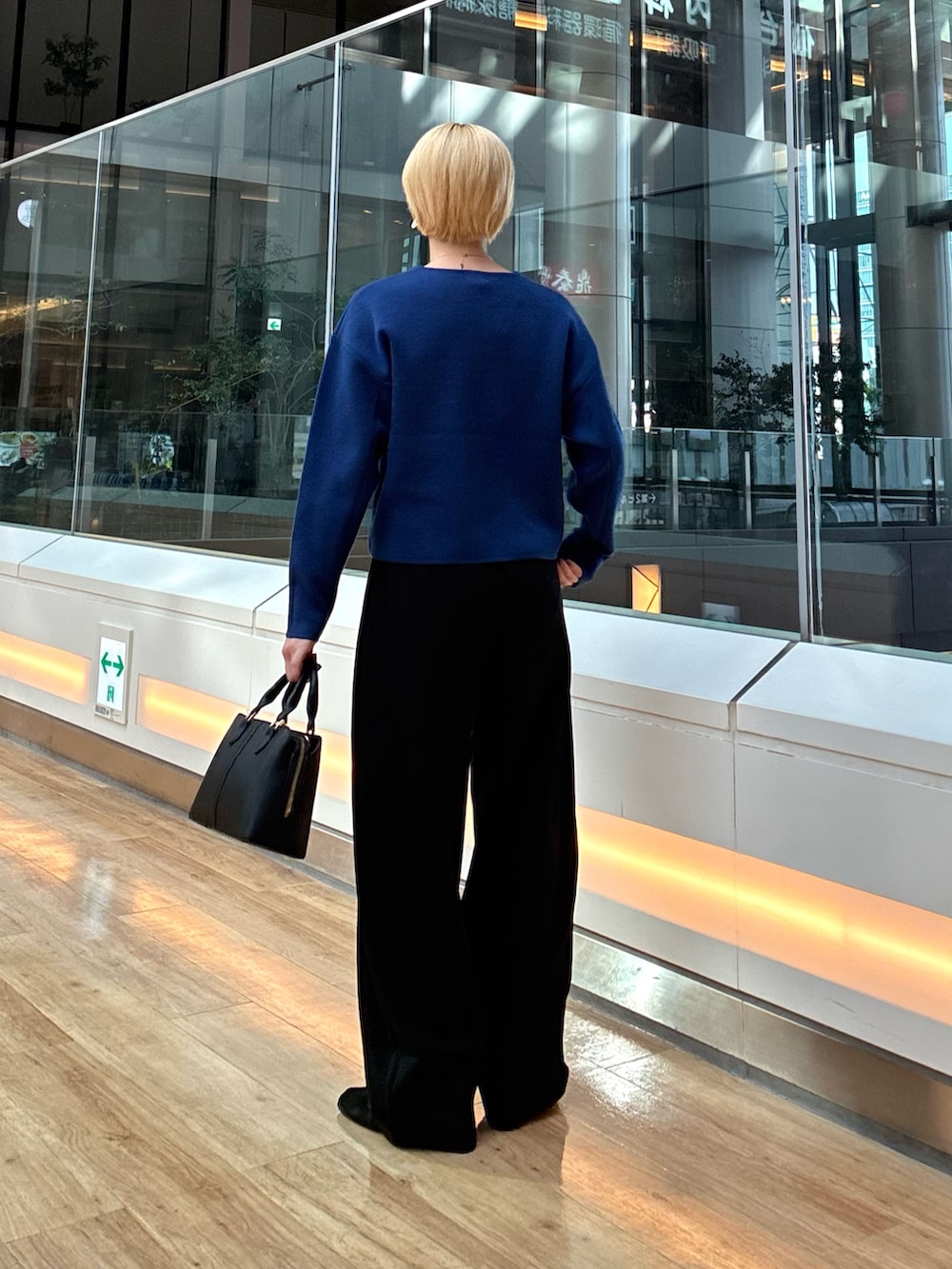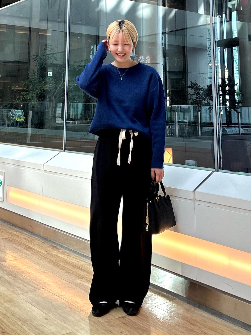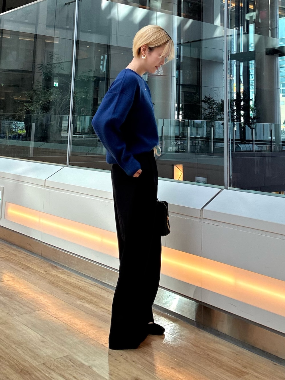 はっきりとした色味のニットでショート丈なのでスタイルアップにも繋がりますね〜