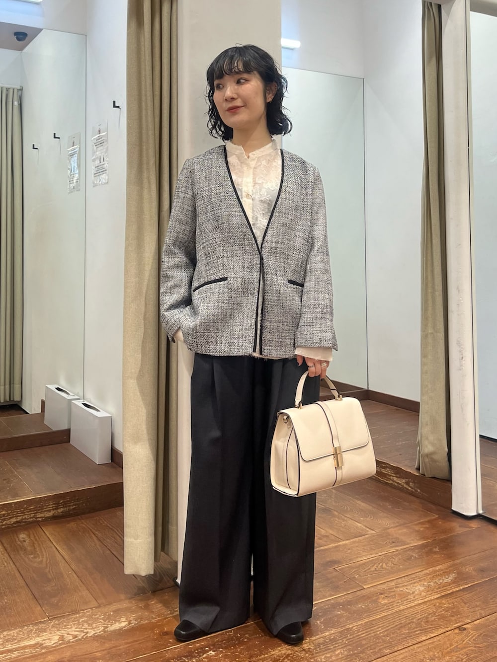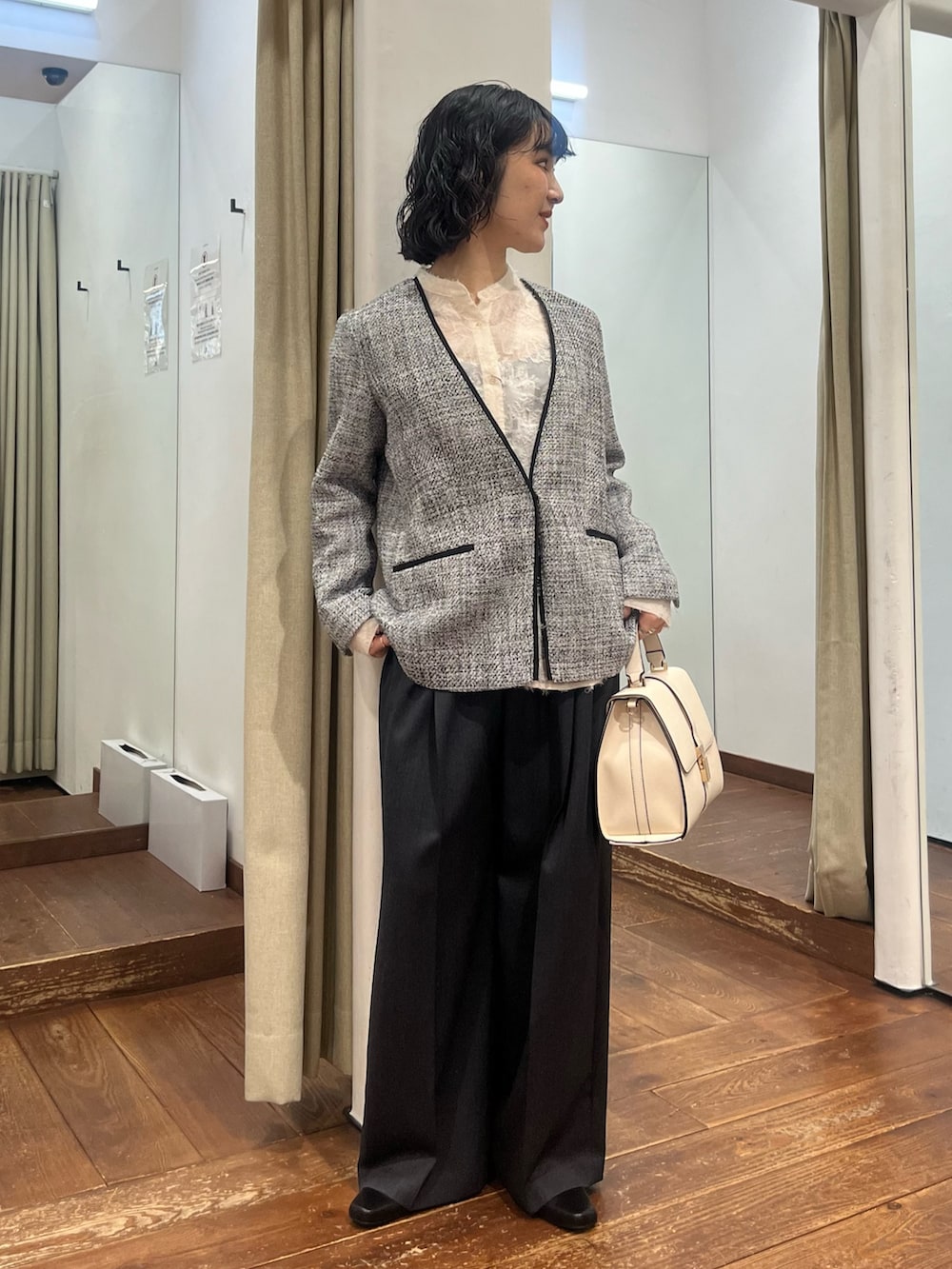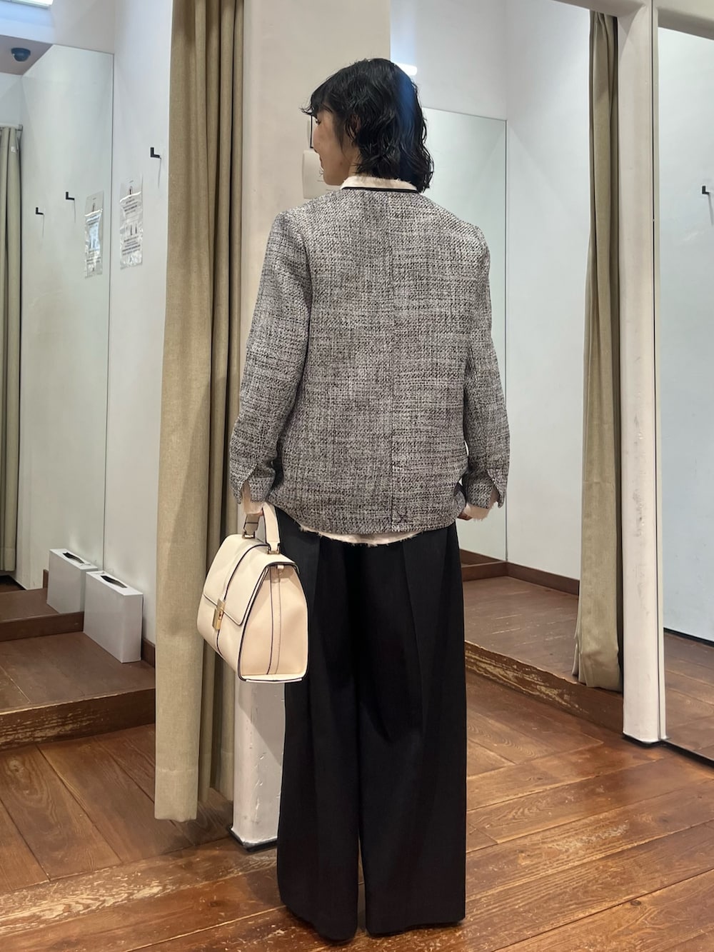 上品さが際立つツィード地のジャケット。ざっくりしたノーカラーは顔周りをスッキリ見せてくれます。パイピングのブラックもコーデを締めてくれてクールなセレモニースタイリングも叶います🎵