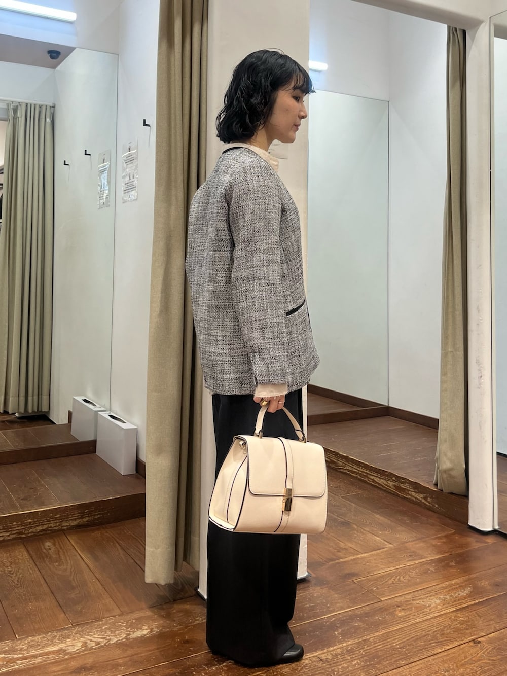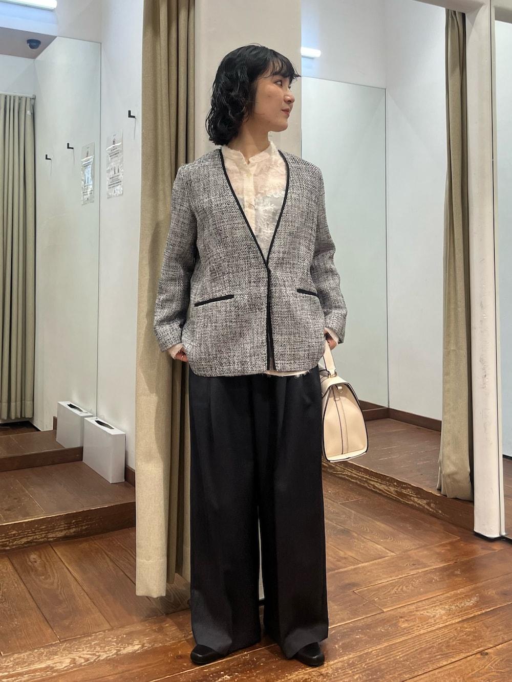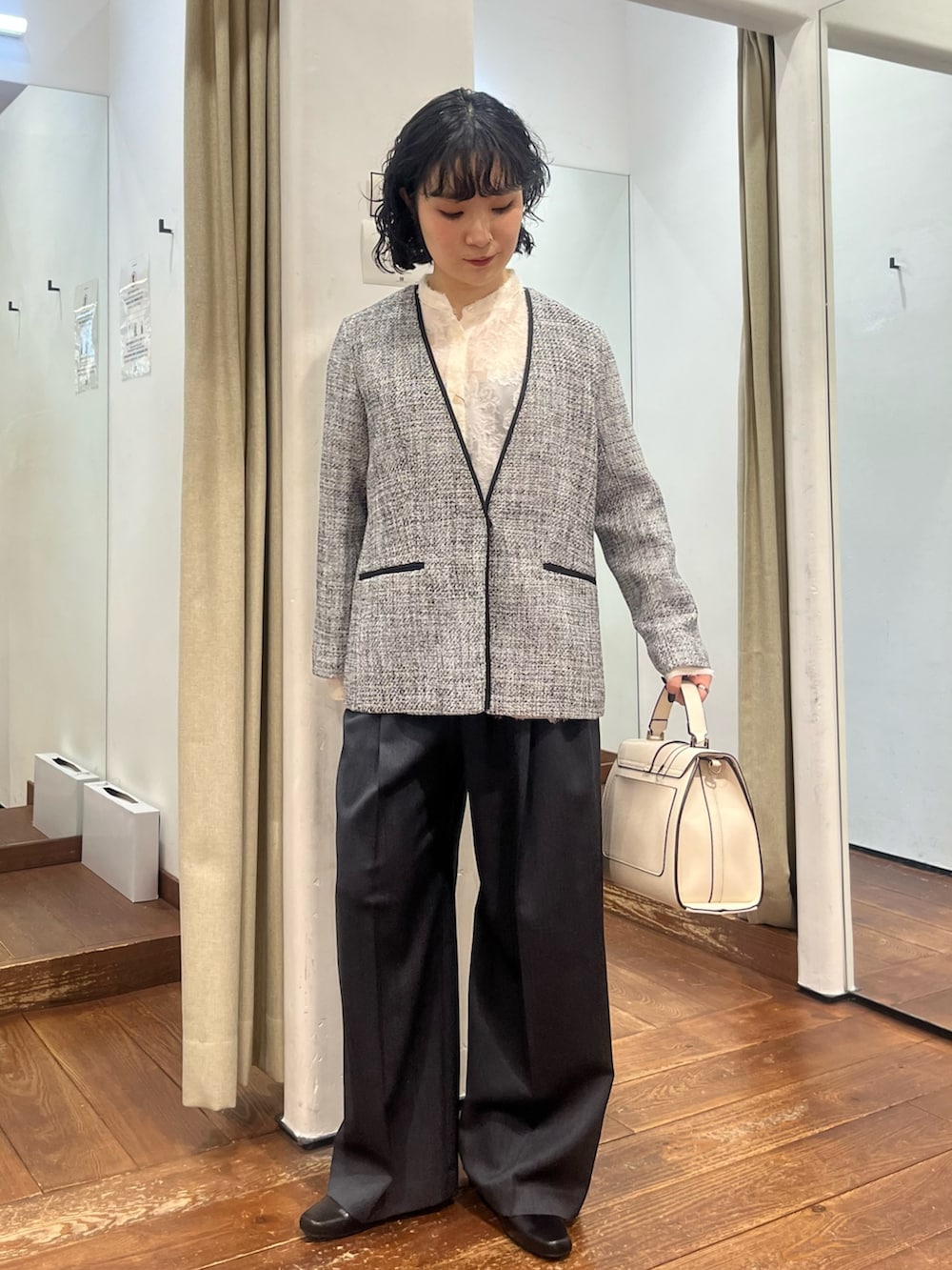 上品さが際立つツィード地のジャケット。ざっくりしたノーカラーは顔周りをスッキリ見せてくれます。パイピングのブラックもコーデを締めてくれてクールなセレモニースタイリングも叶います🎵