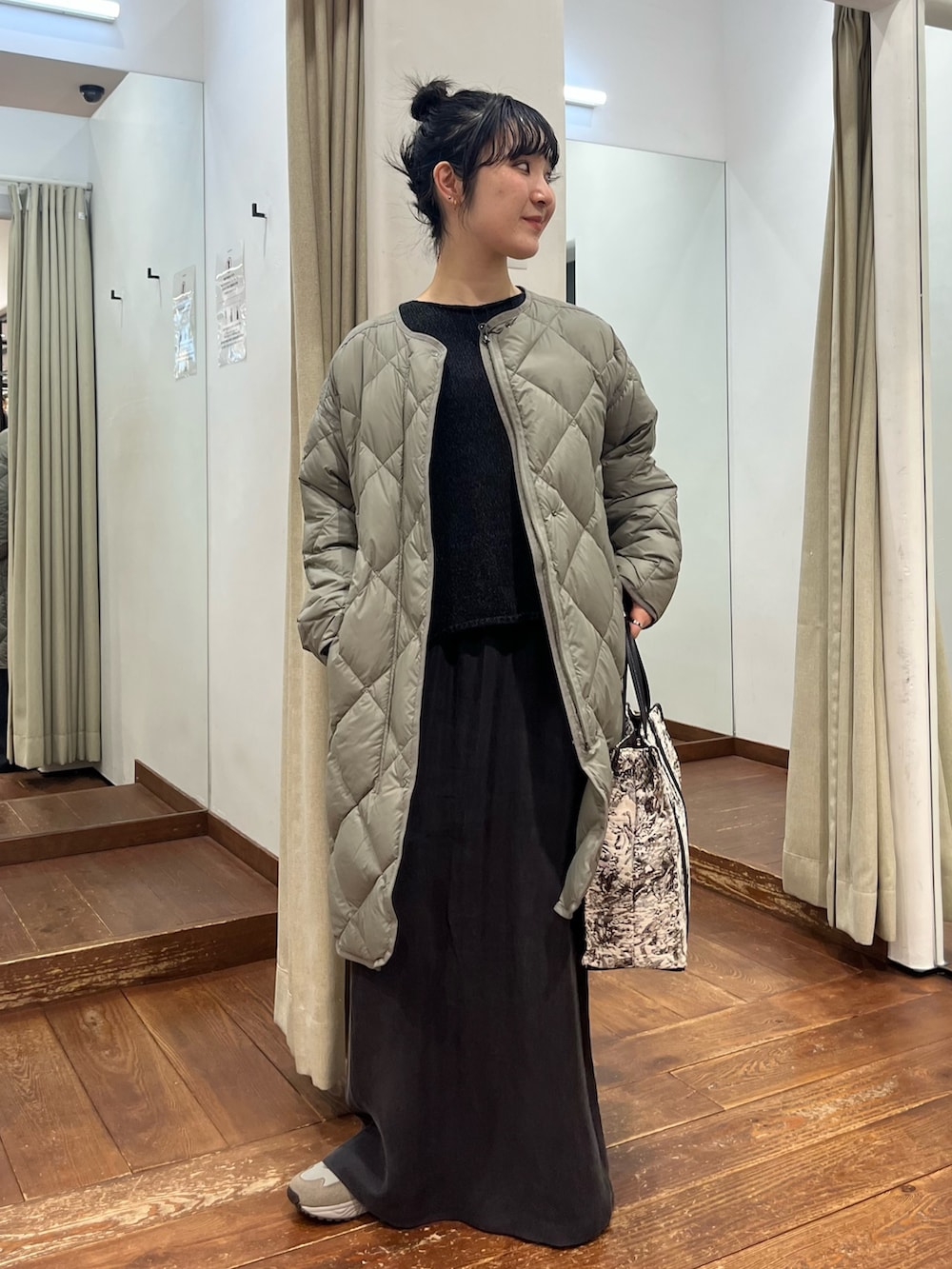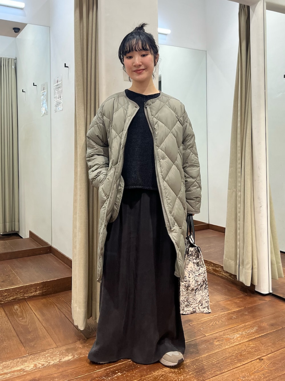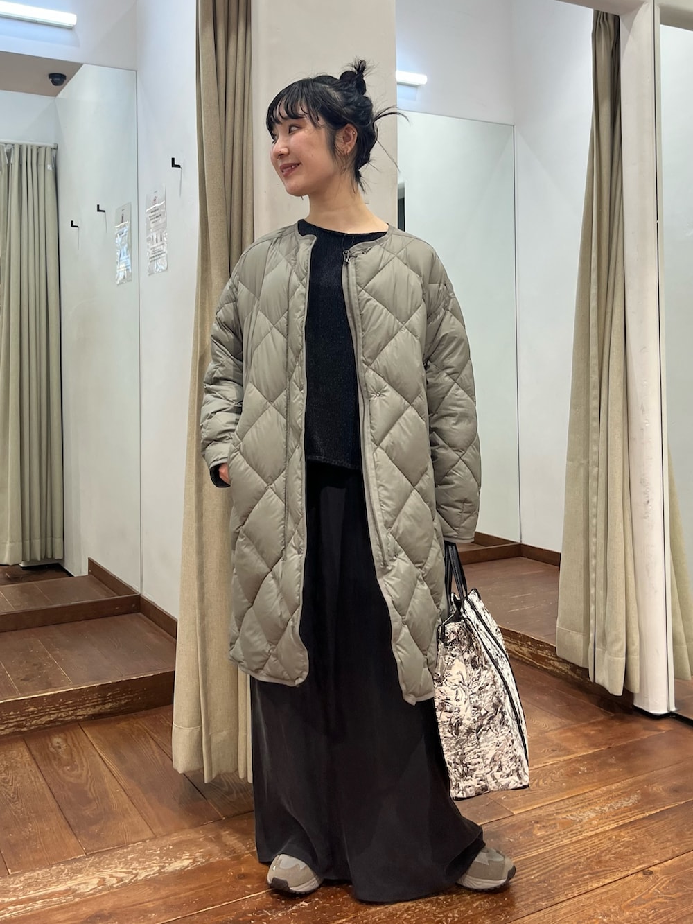 キルティングコートにスニーカーと、ラフで抜け感のあるスタイリングにまとめました。