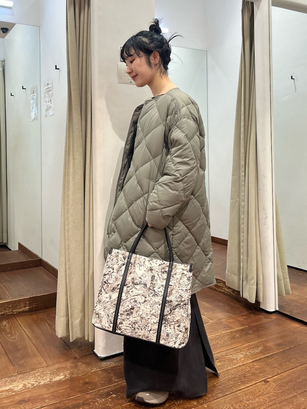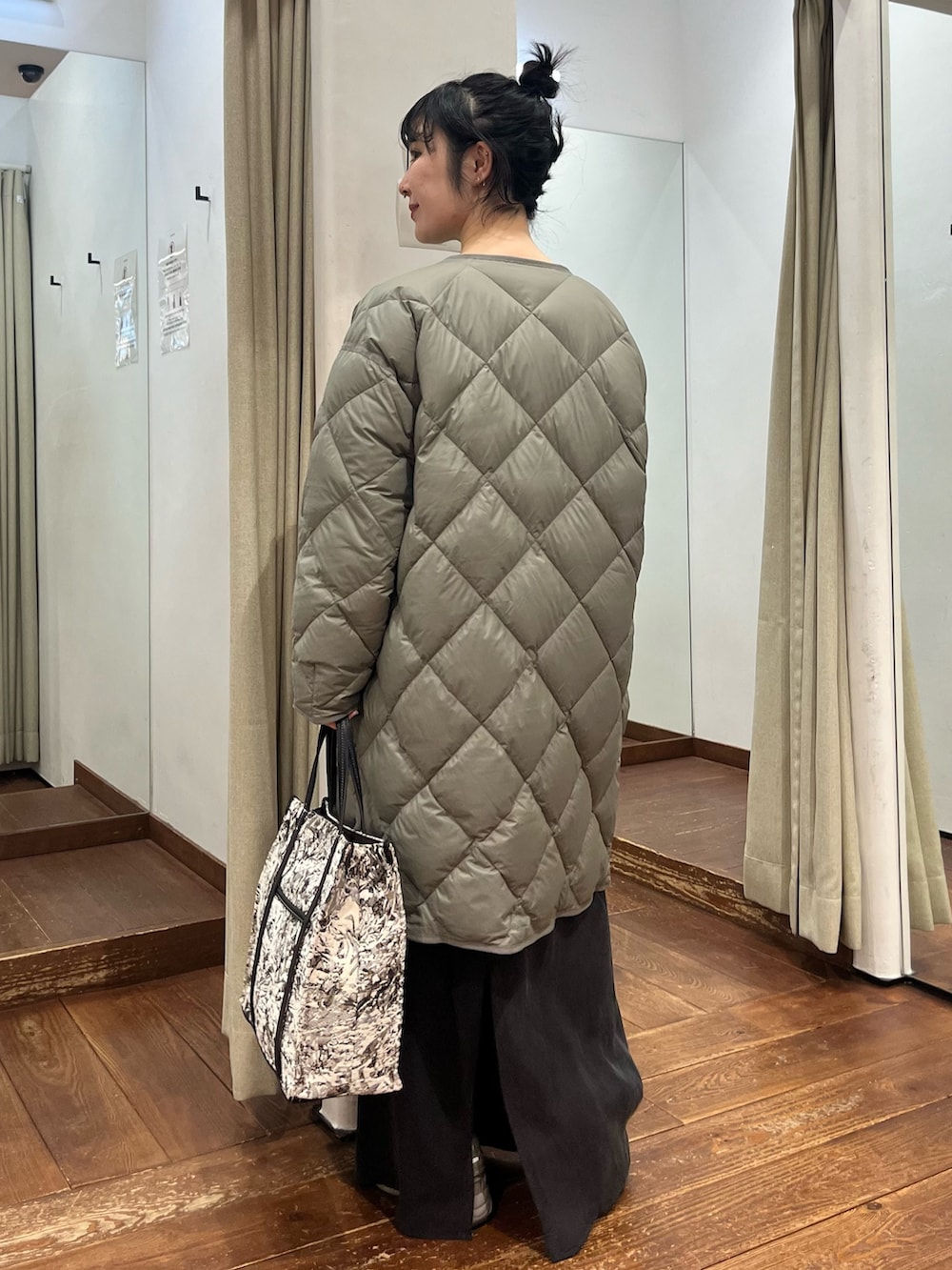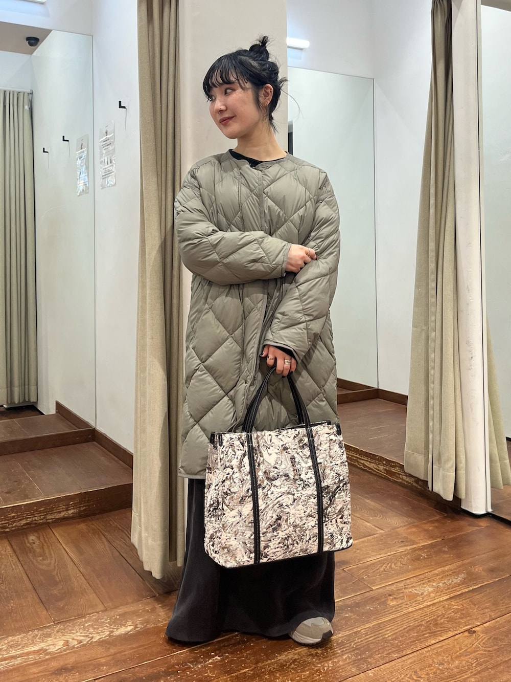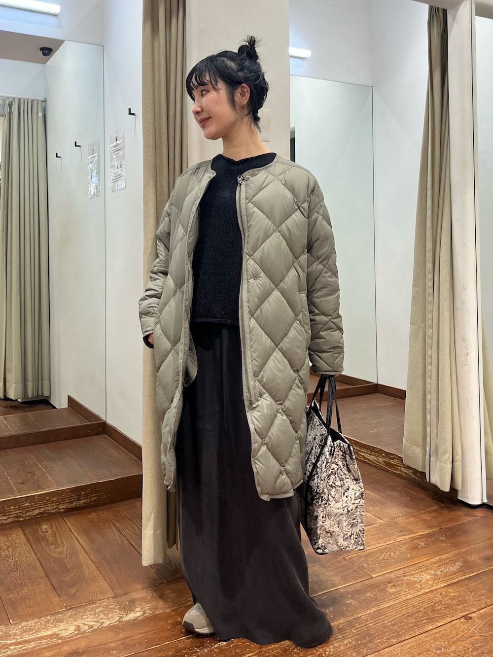 キルティングコートにスニーカーと、ラフで抜け感のあるスタイリングにまとめました。