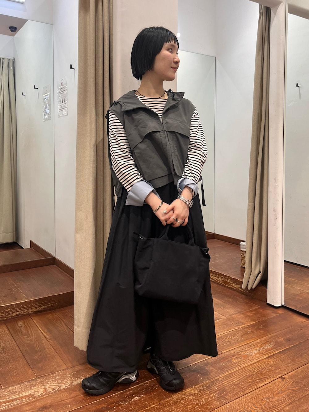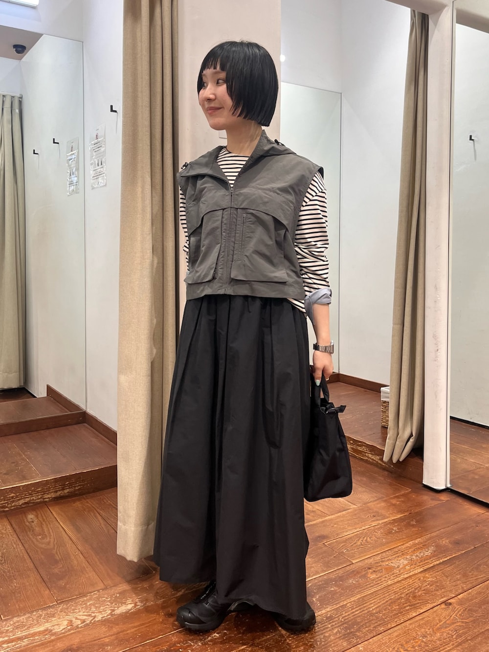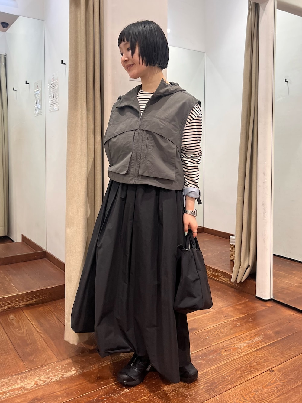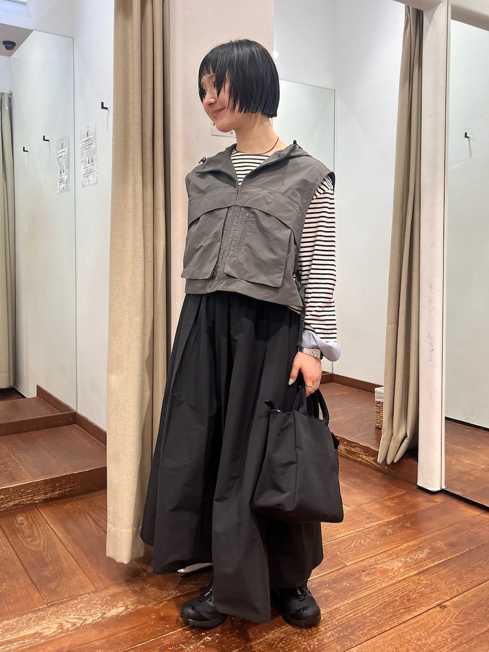 とにかく軽量で、コーデが寂しい時にちょい足しアイテム。サイドの絞りでサイズ感変えていただけますし、カットソーからニットまで何にでも重ねやすいです!