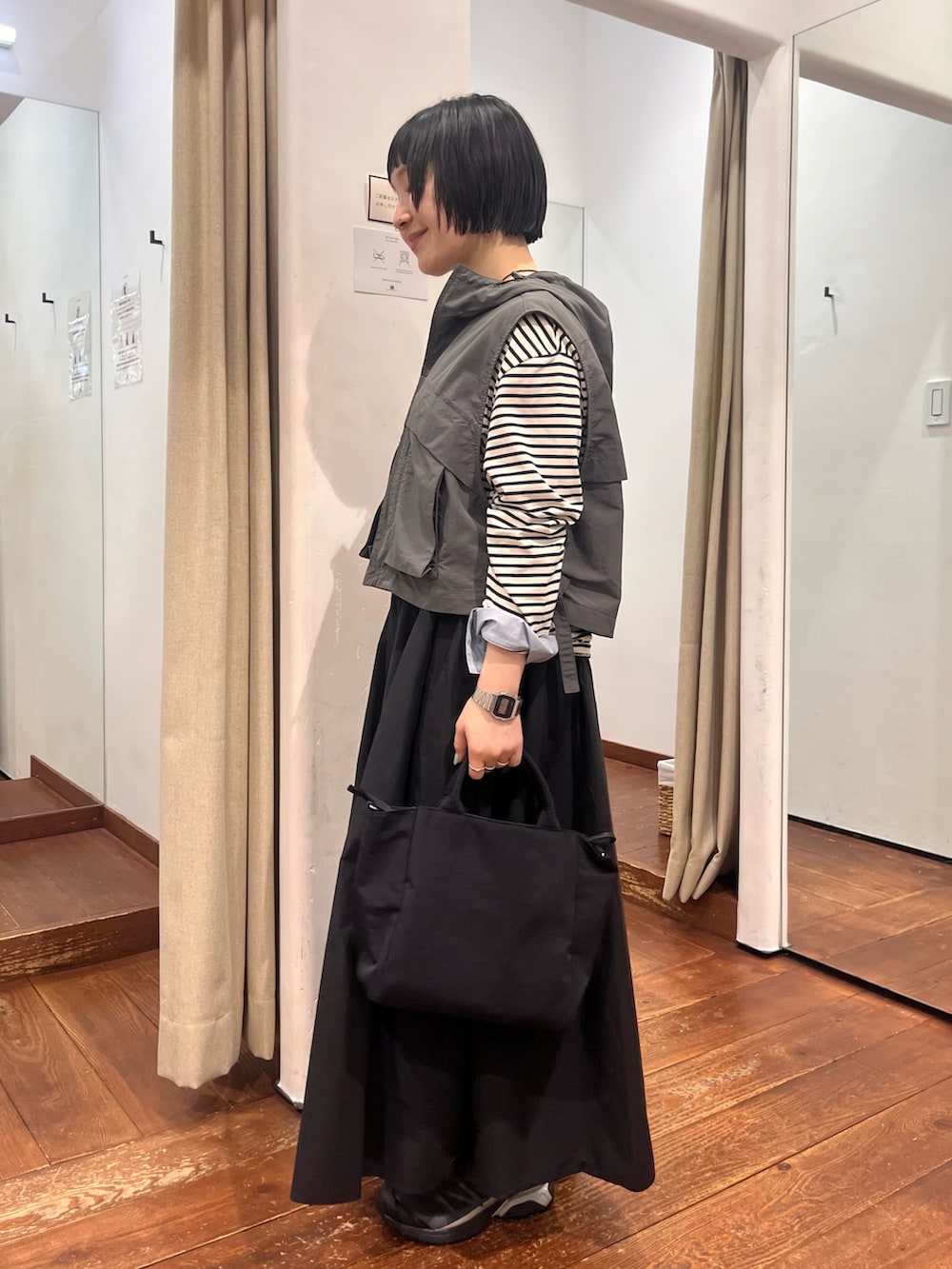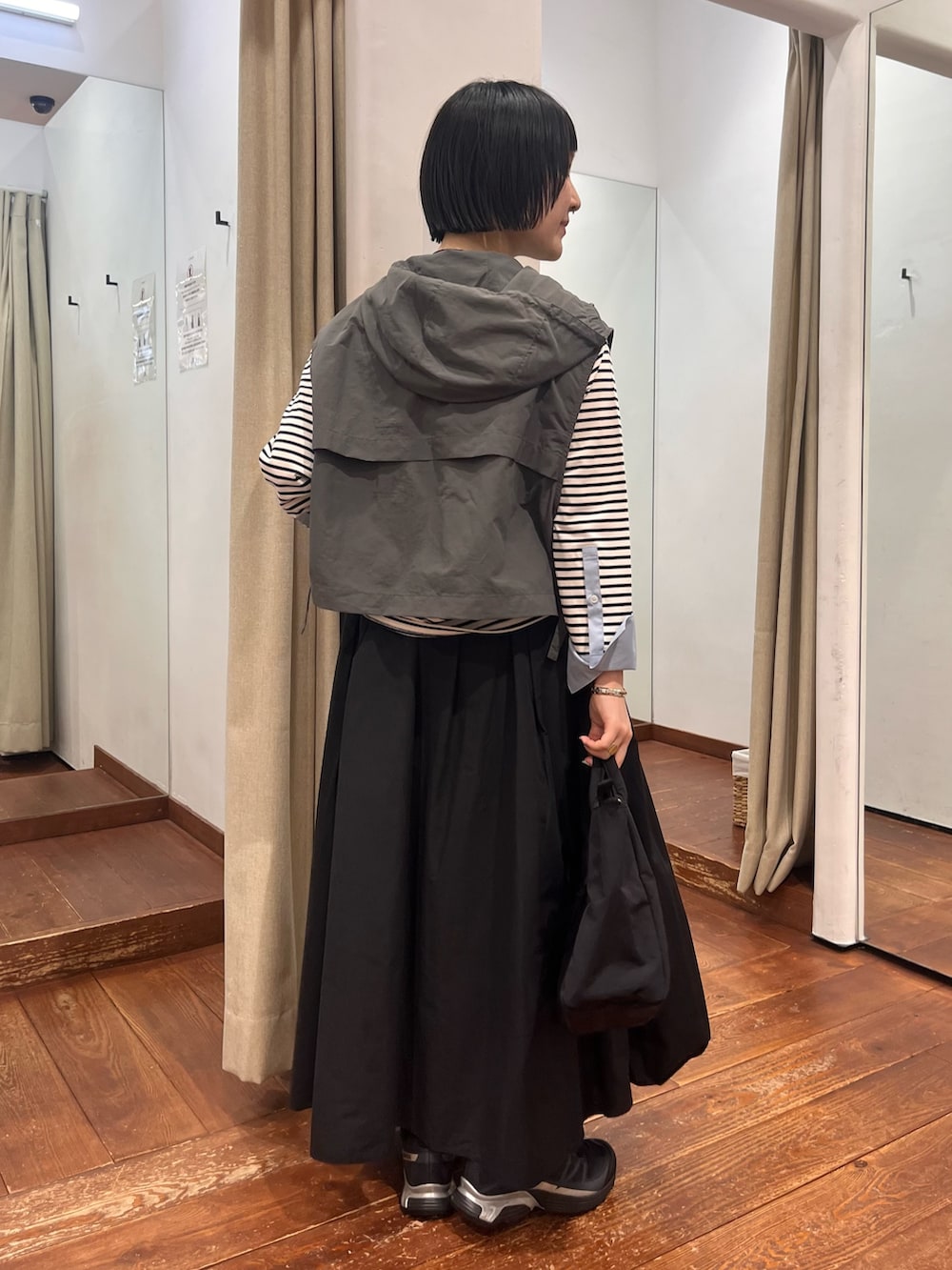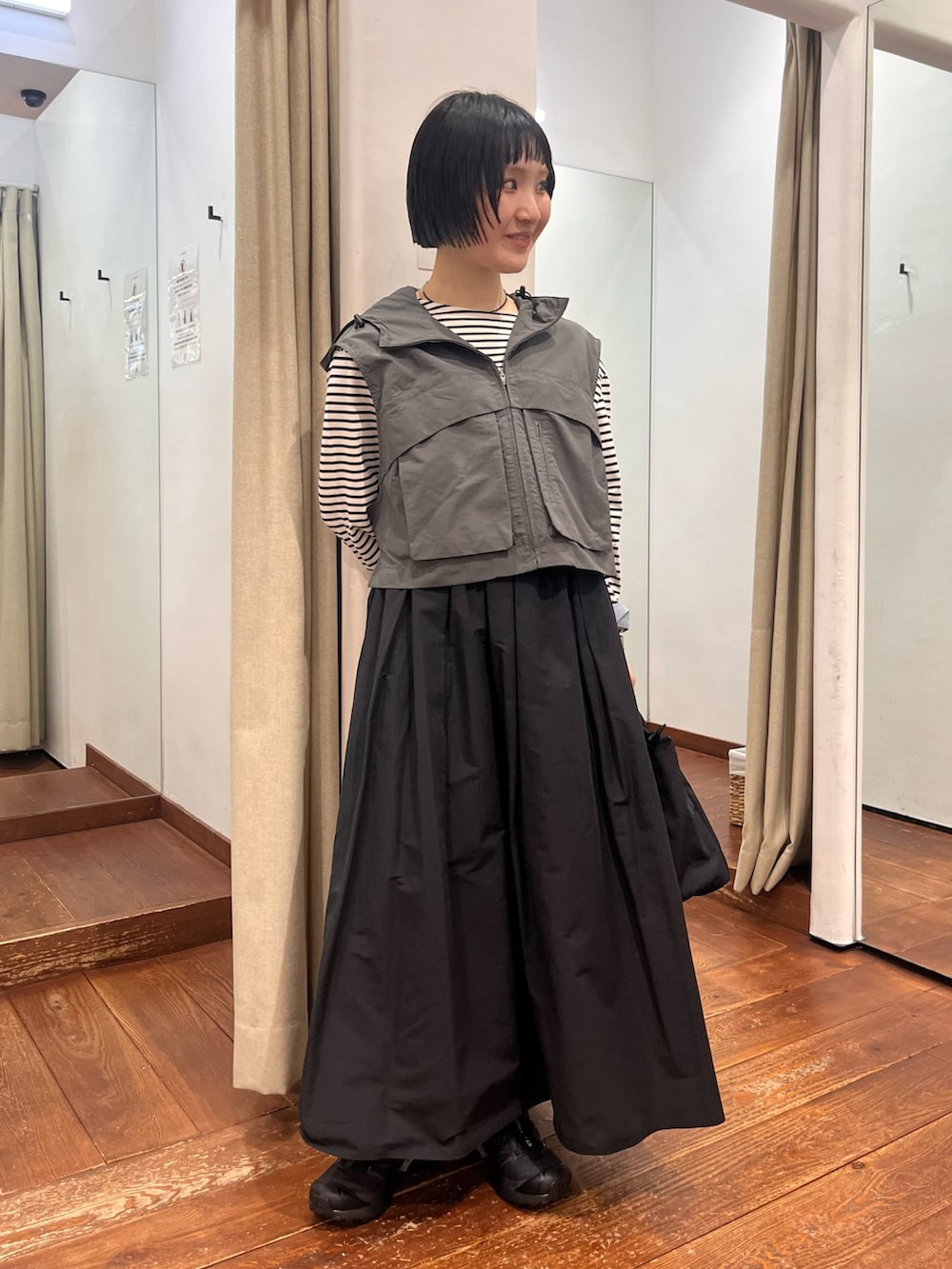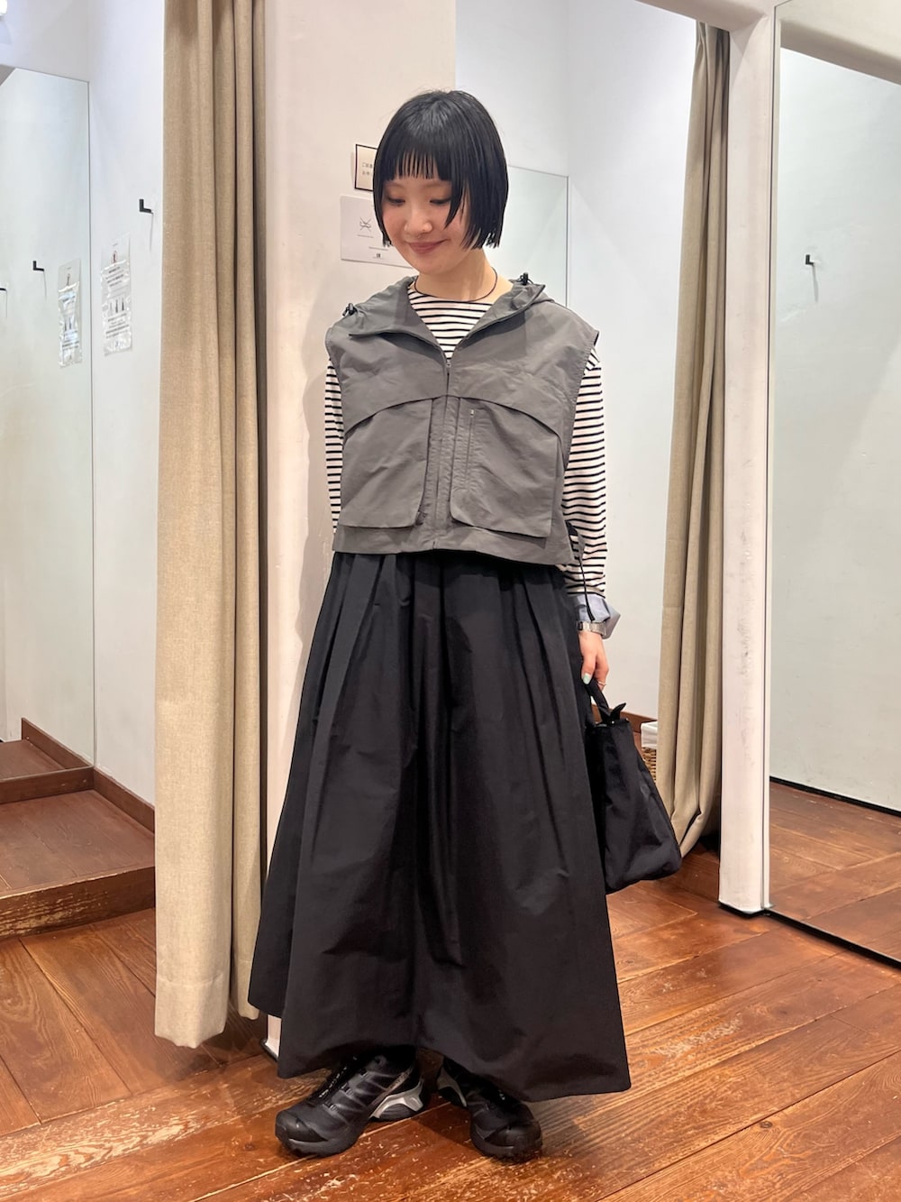 とにかく軽量で、コーデが寂しい時にちょい足しアイテム。サイドの絞りでサイズ感変えていただけますし、カットソーからニットまで何にでも重ねやすいです!