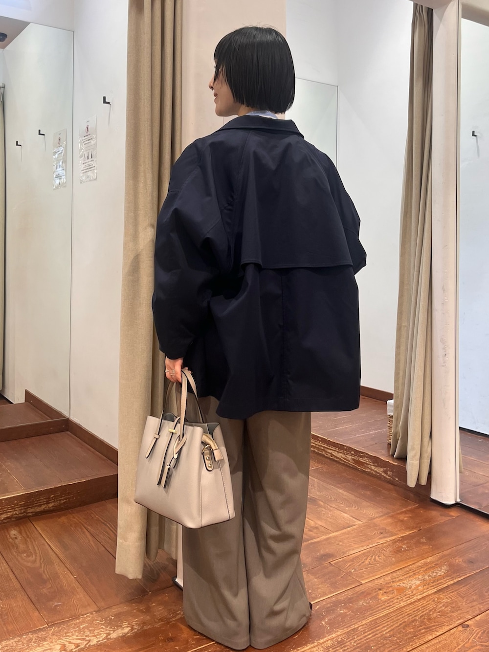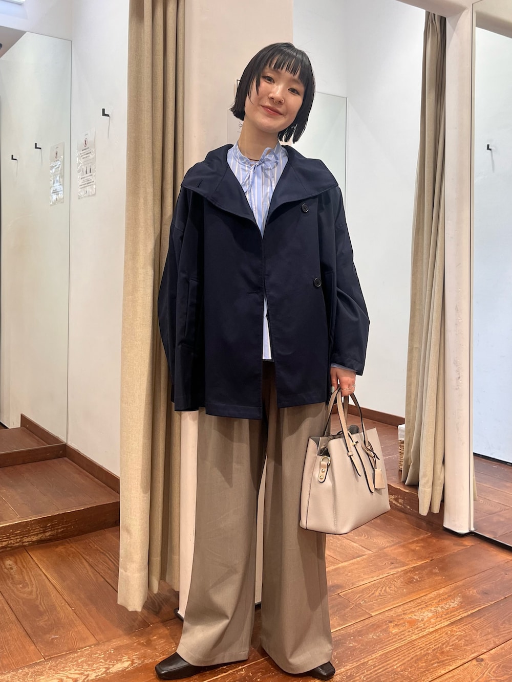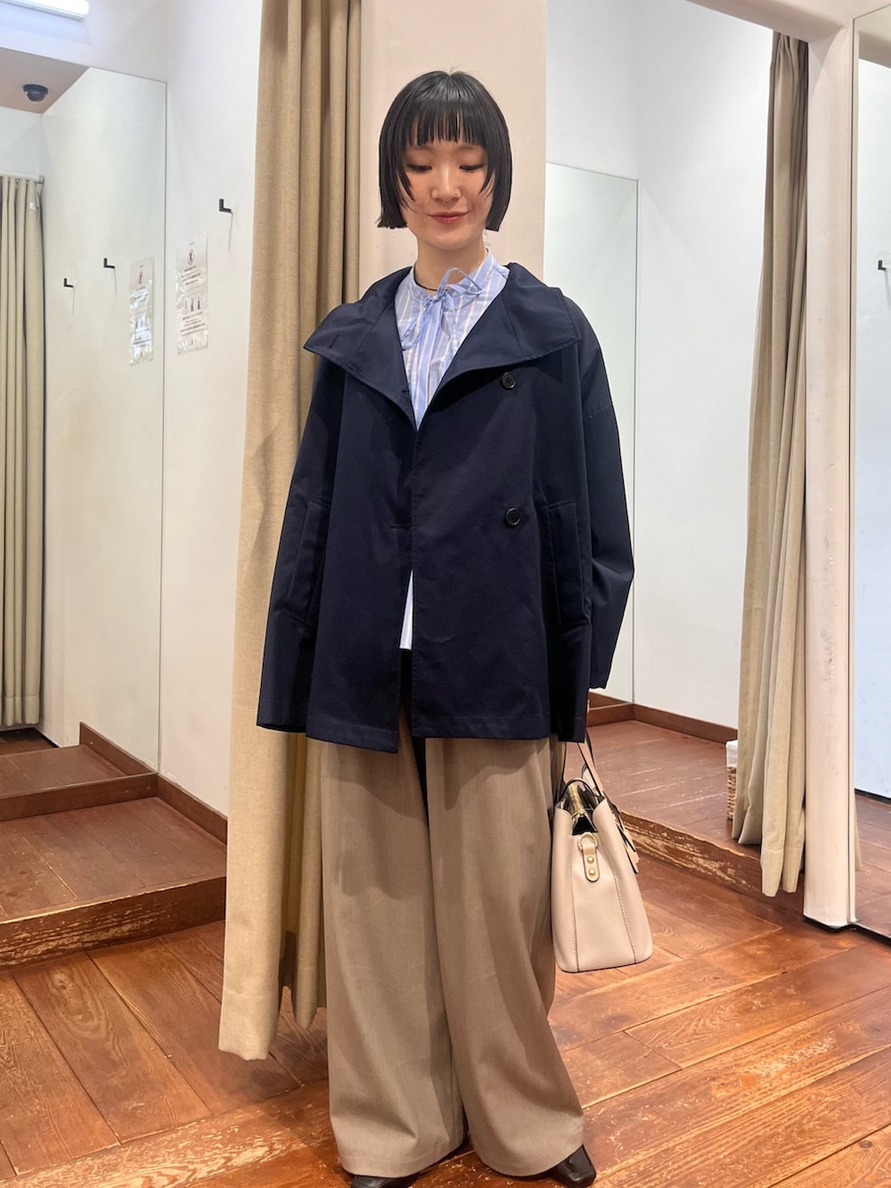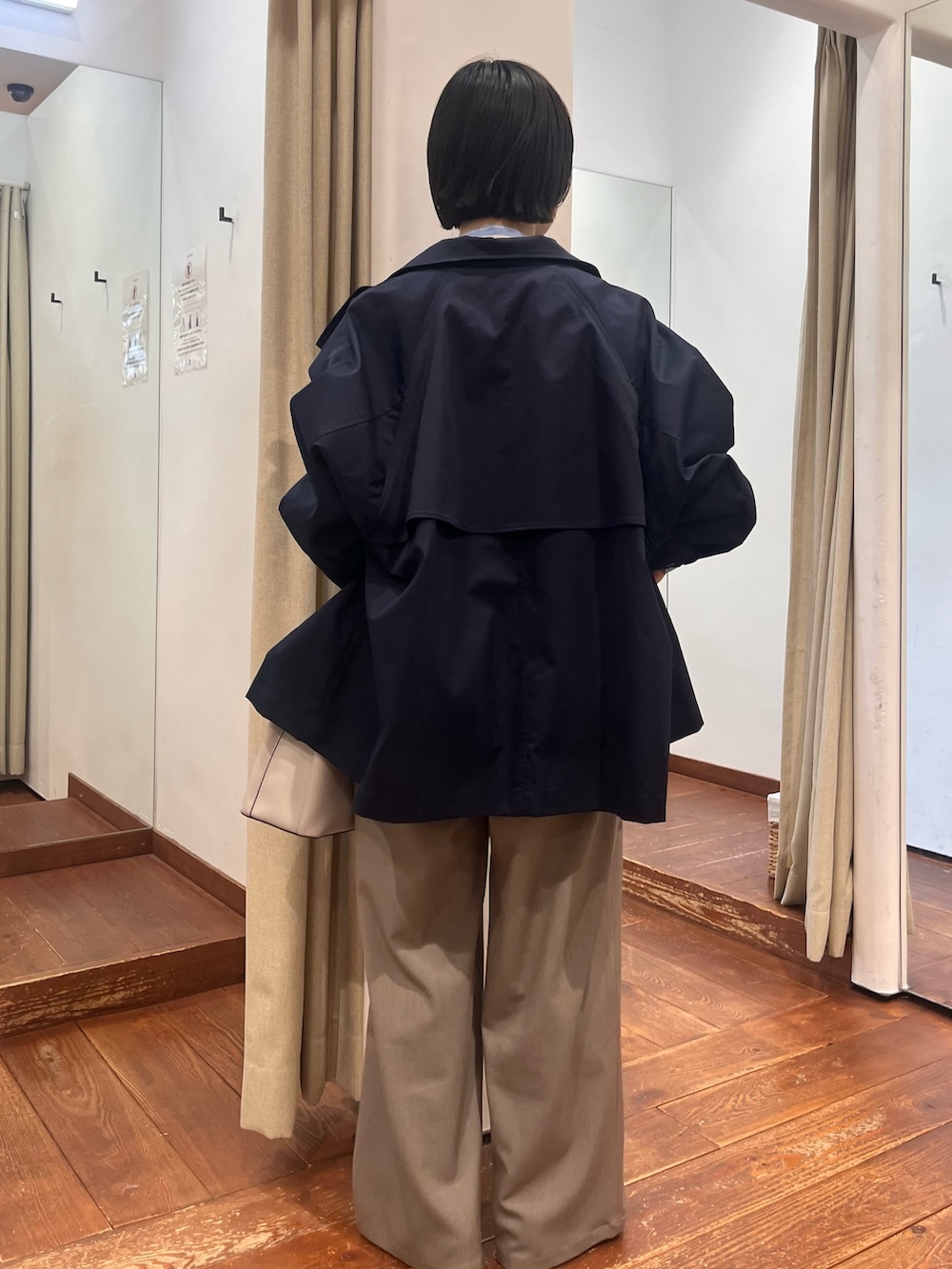 スタンドカラーにしても、開けてゆるっと羽織っても。ネイビーはセレモニーやオフィス用としても着用いただけそうです!
