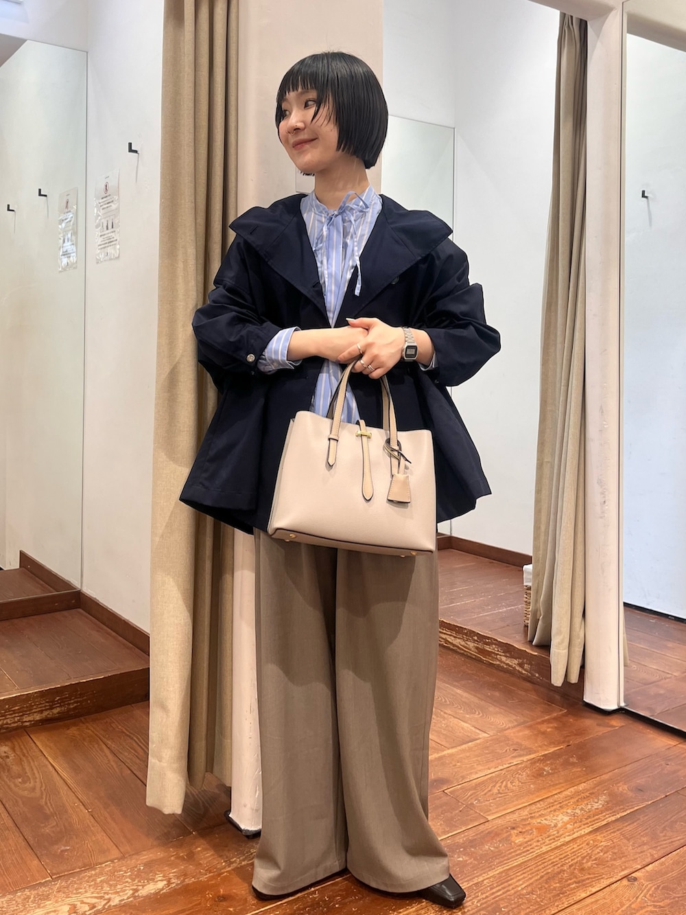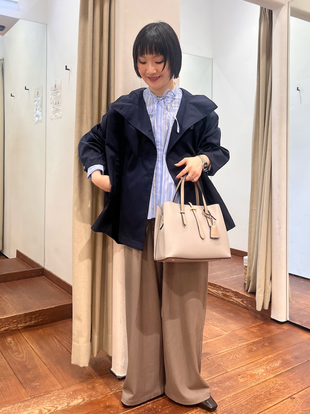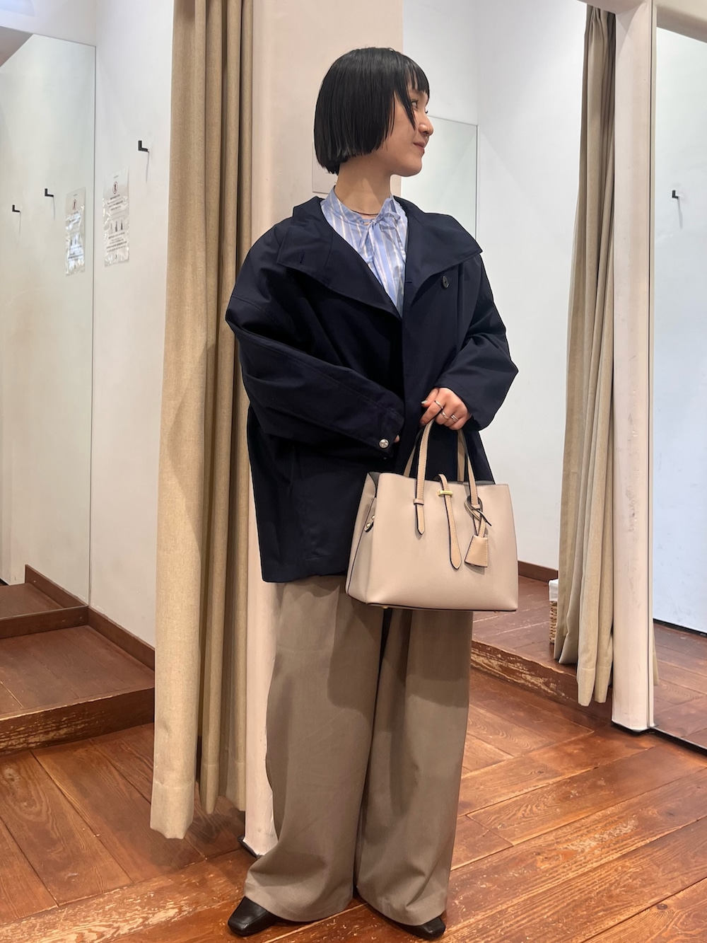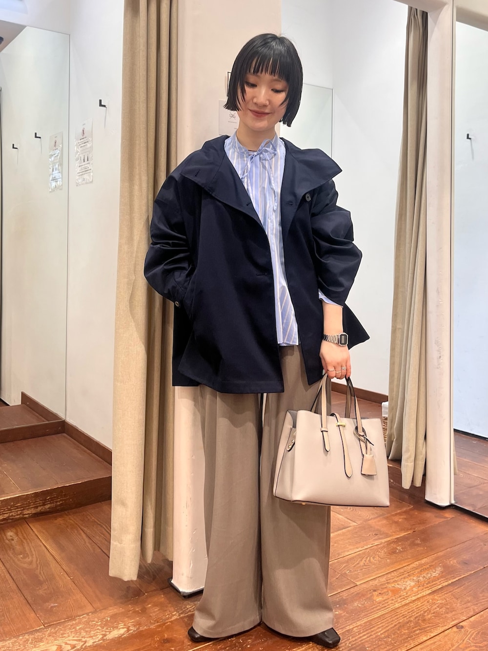 スタンドカラーにしても、開けてゆるっと羽織っても。ネイビーはセレモニーやオフィス用としても着用いただけそうです!