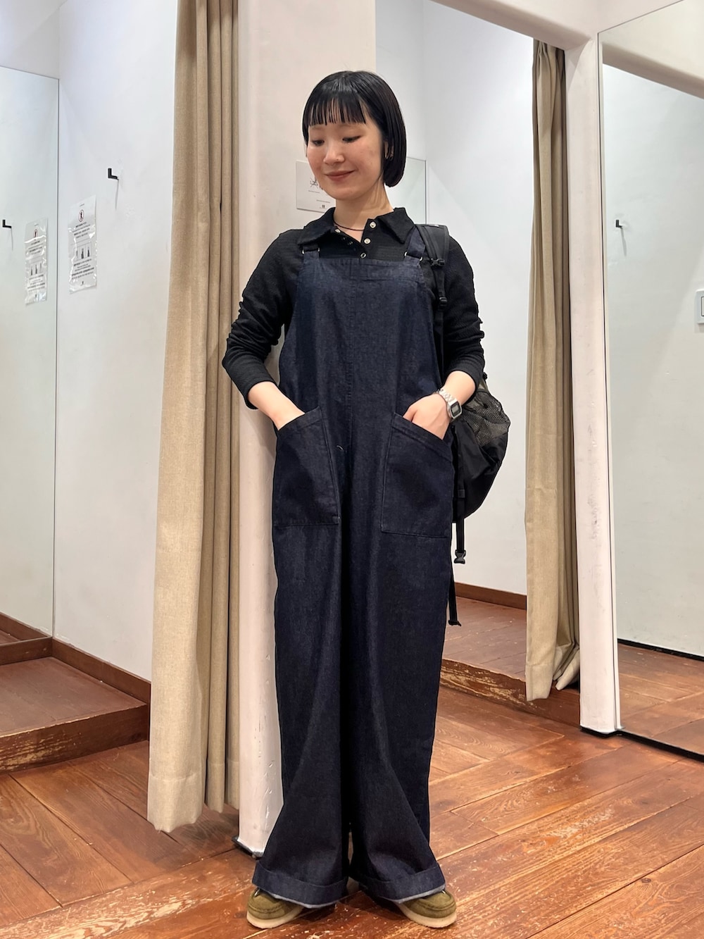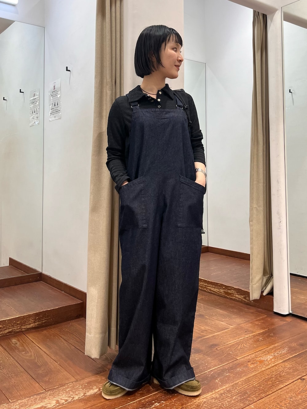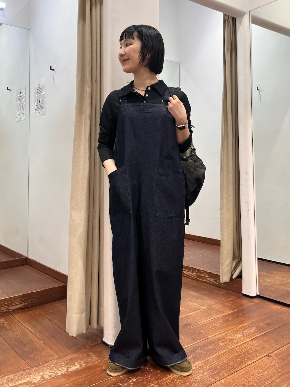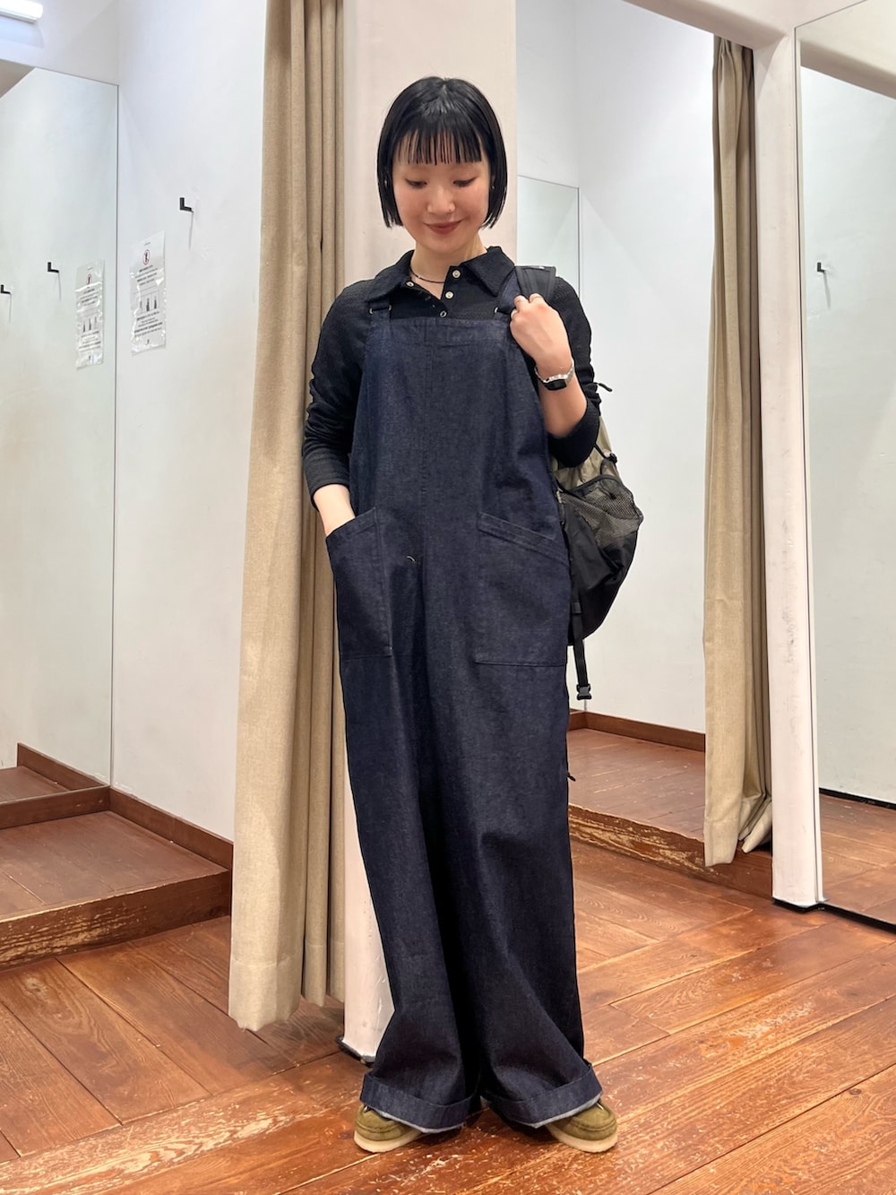 肩で長さの調整と、ウエストのサイズ調整もできます。1枚でスタイリングにインパクトを与えてくれるサロペット。