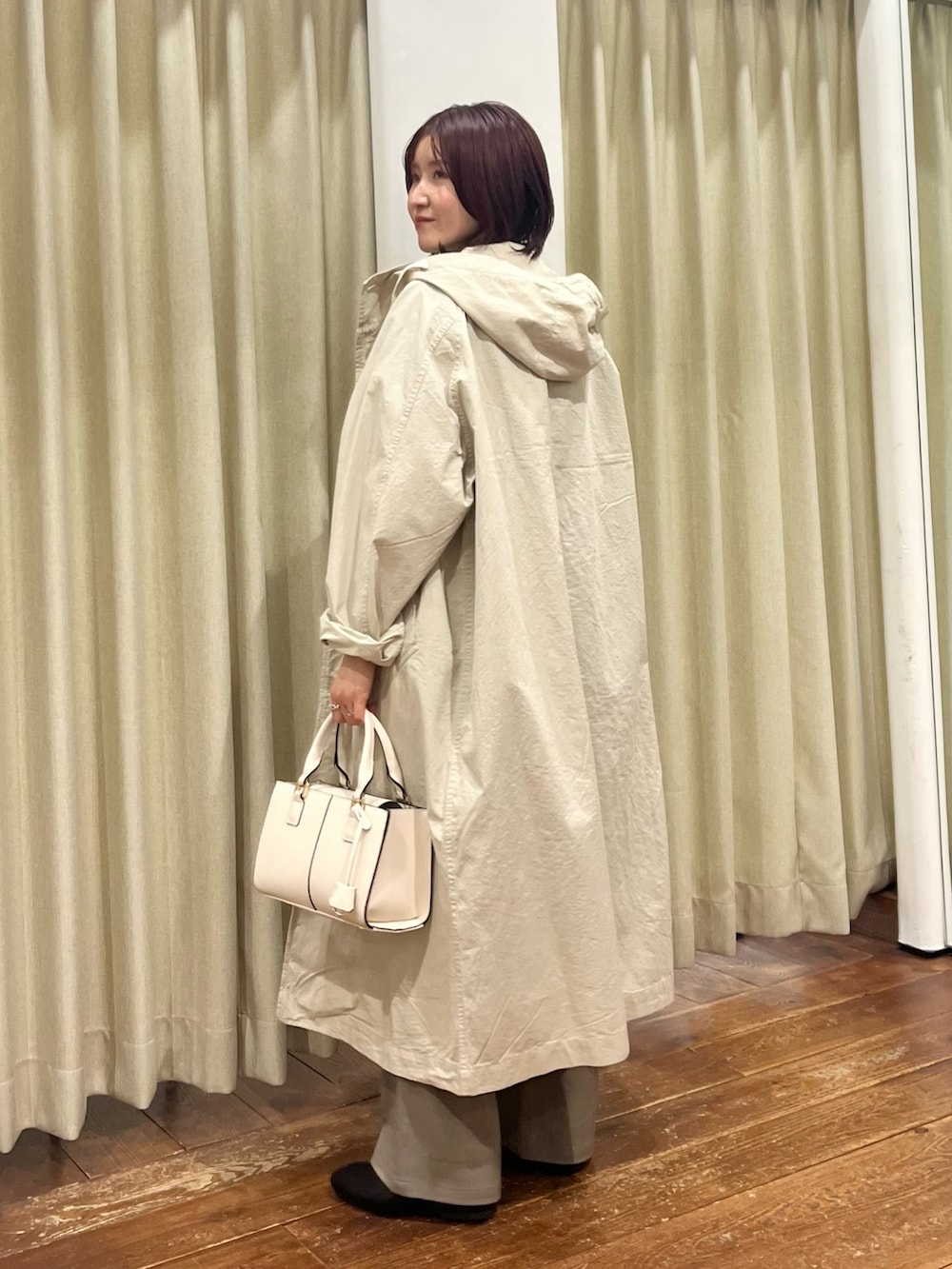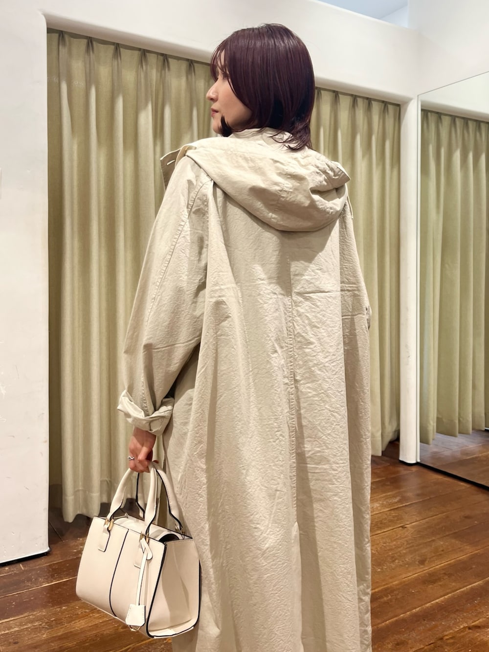 かぐれのコートはハリのある素材でしっかりと長さがあるので羽織るだけで雰囲気も出て、上品に着ていただけます。フードがあるのでカチッとなり過ぎずラフに使えます。