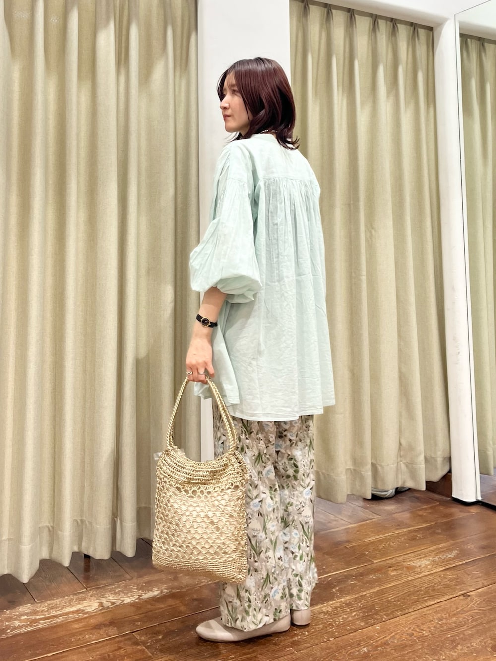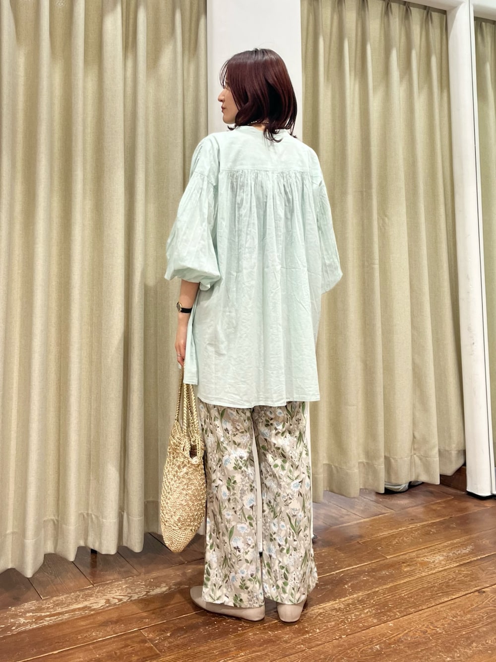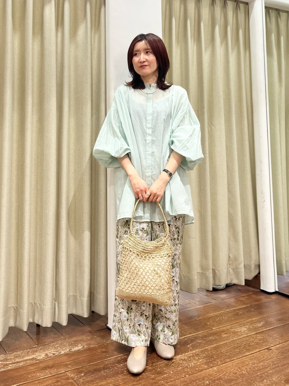 パンツは総柄ですが落ち着いたカラーがベースになっているので合わせやすく、大人っぽく着ていただけます。156㎝でSサイズを着用しています。