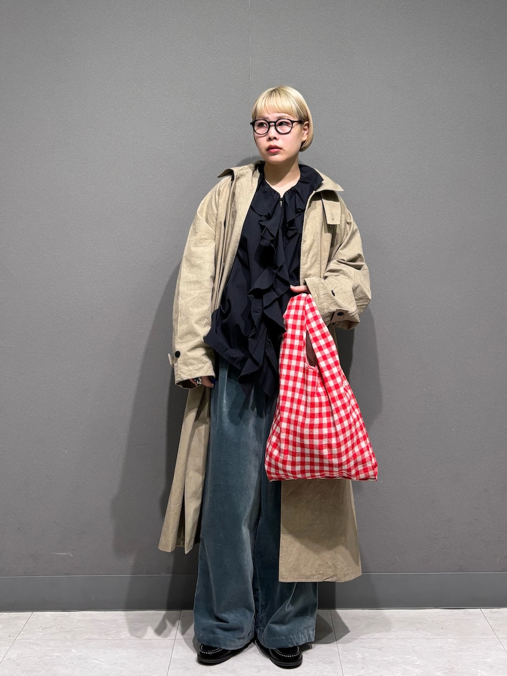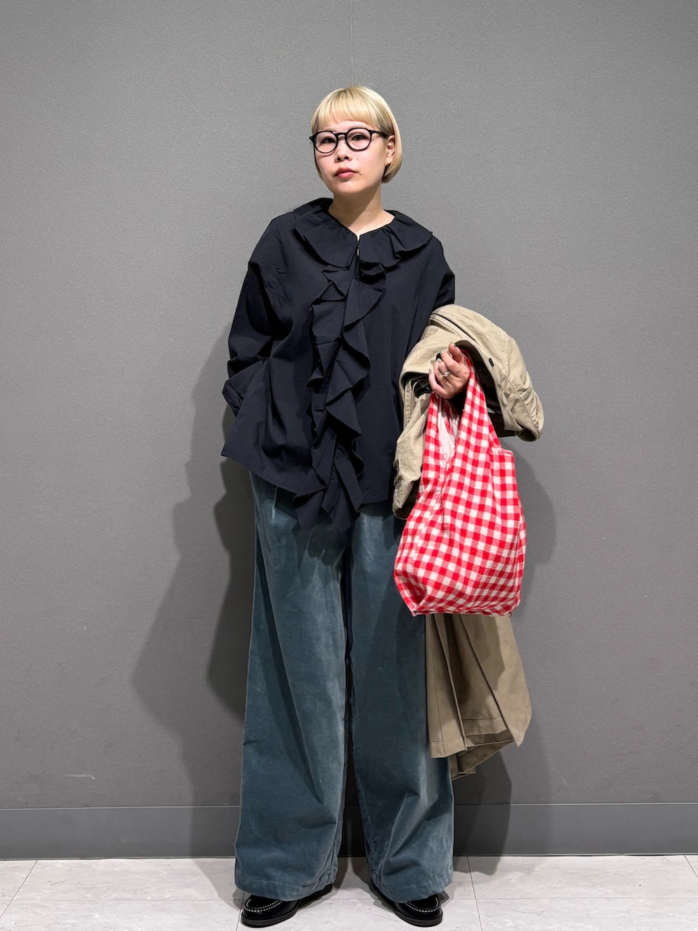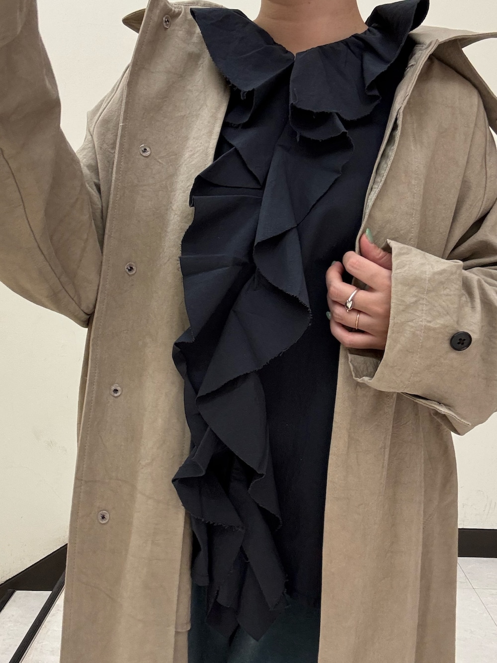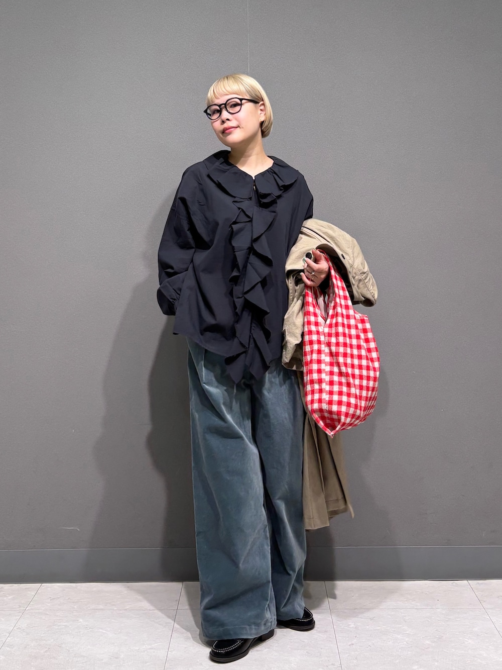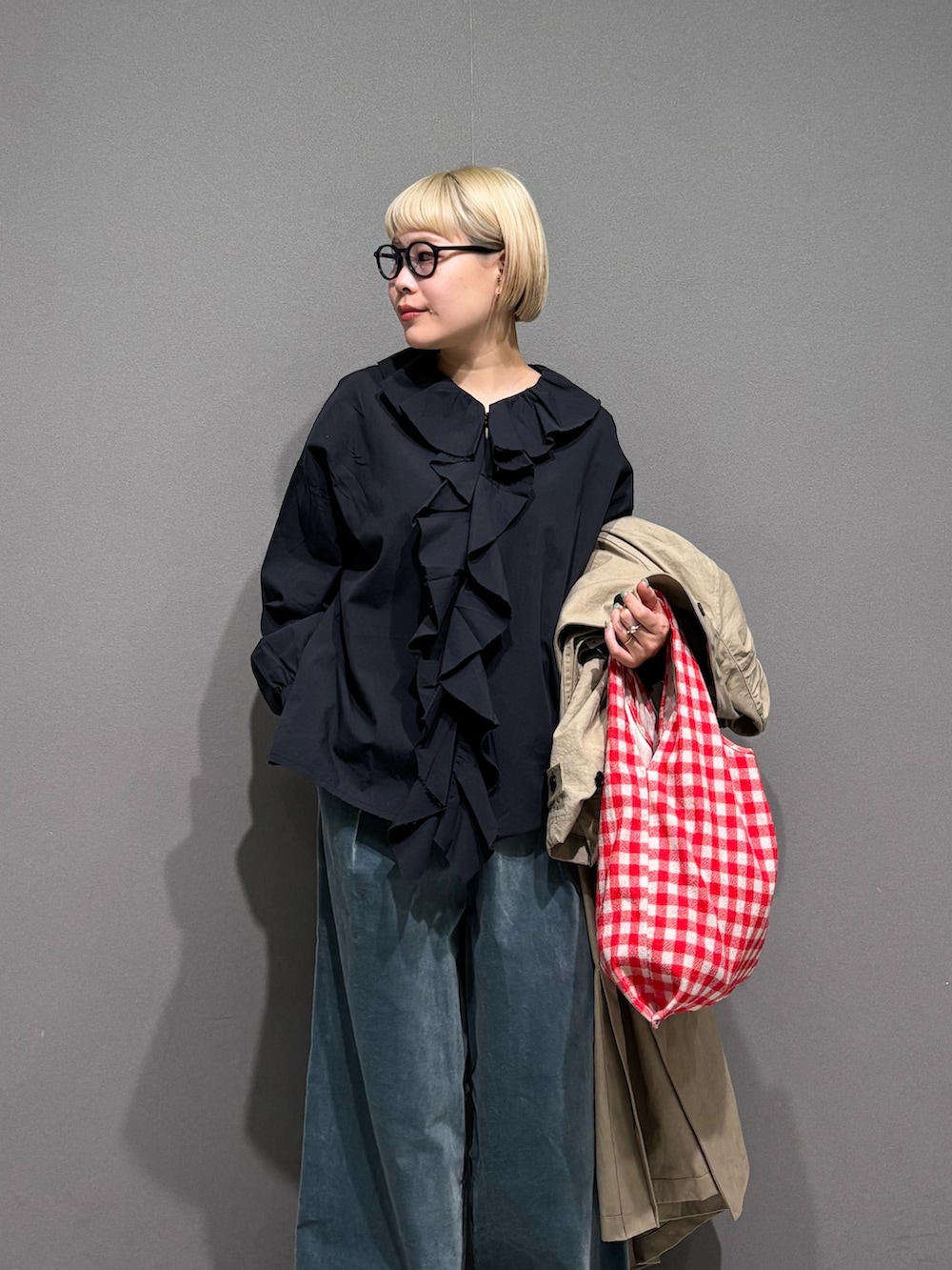 フリルブラウスもチャコールだと