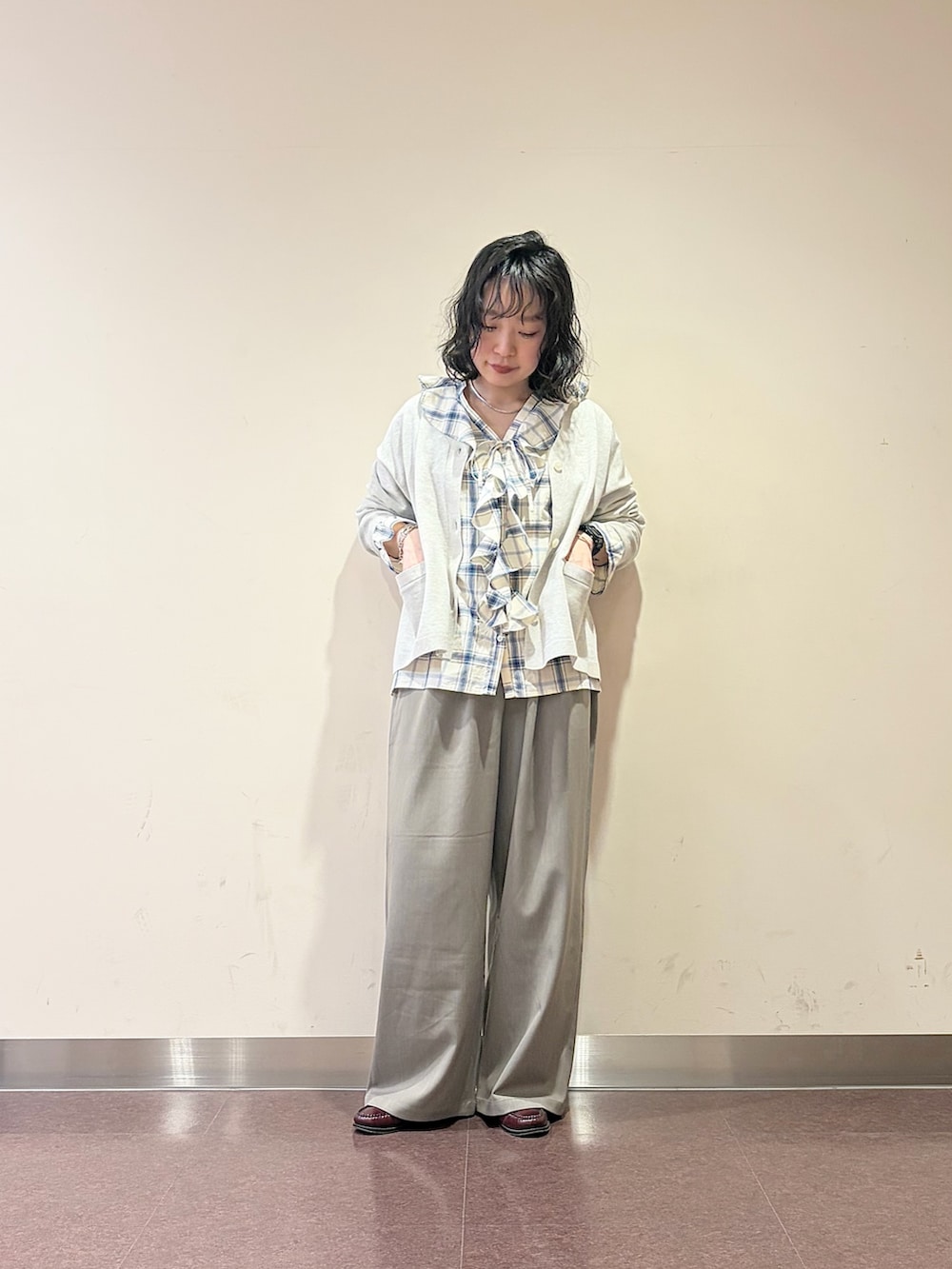 チェック柄のフリルがアクセントのブラウス