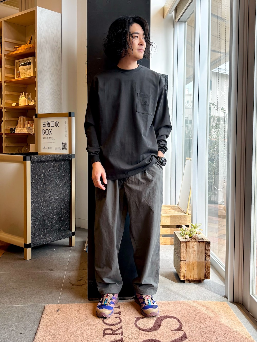 今の過ごしやすい時期にピッタリの羽織りと軽さやゆったりとしたシルエットの着やすいパンツで組んでみました。