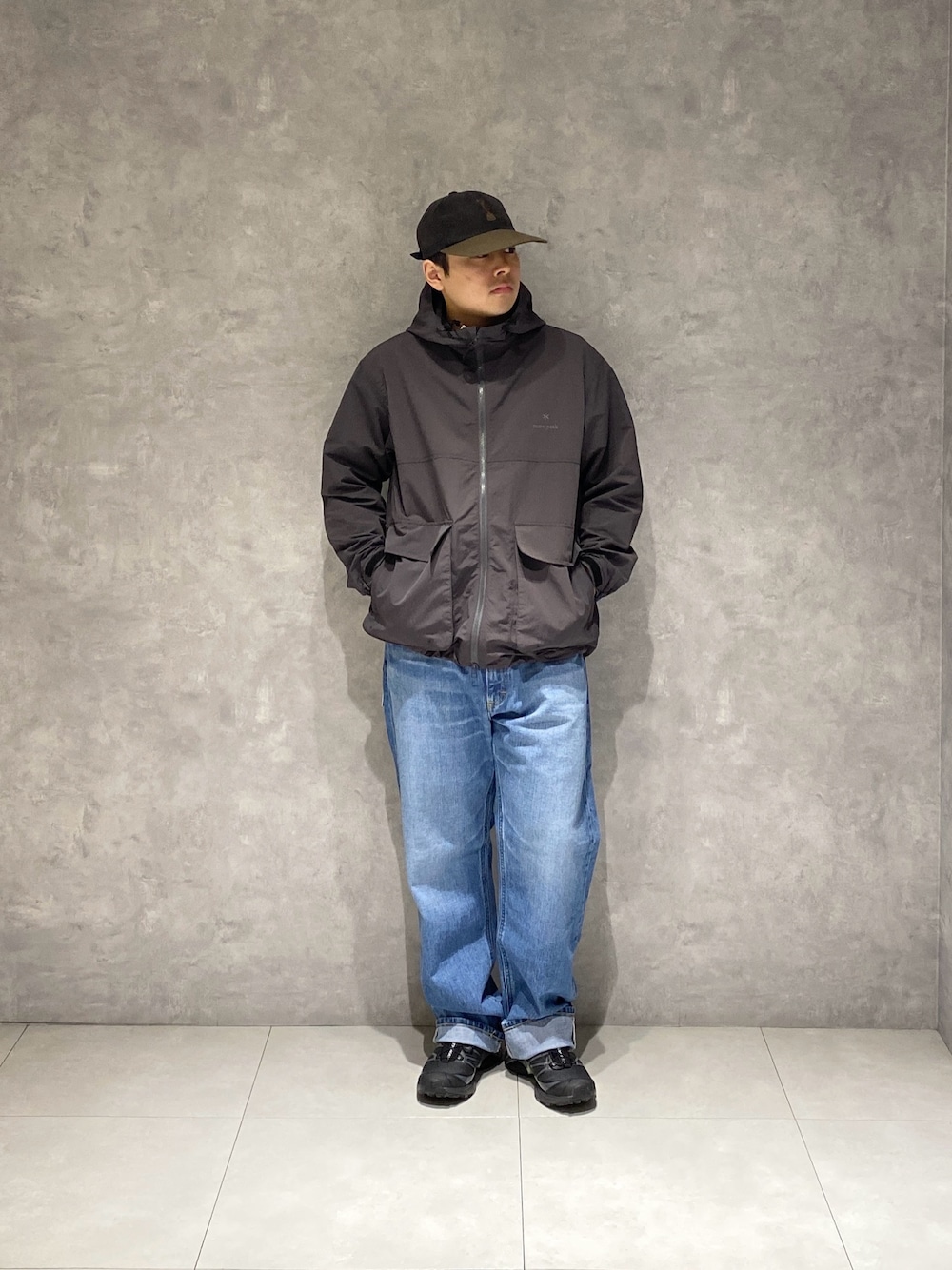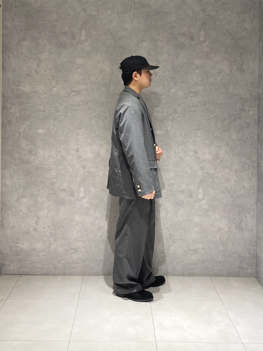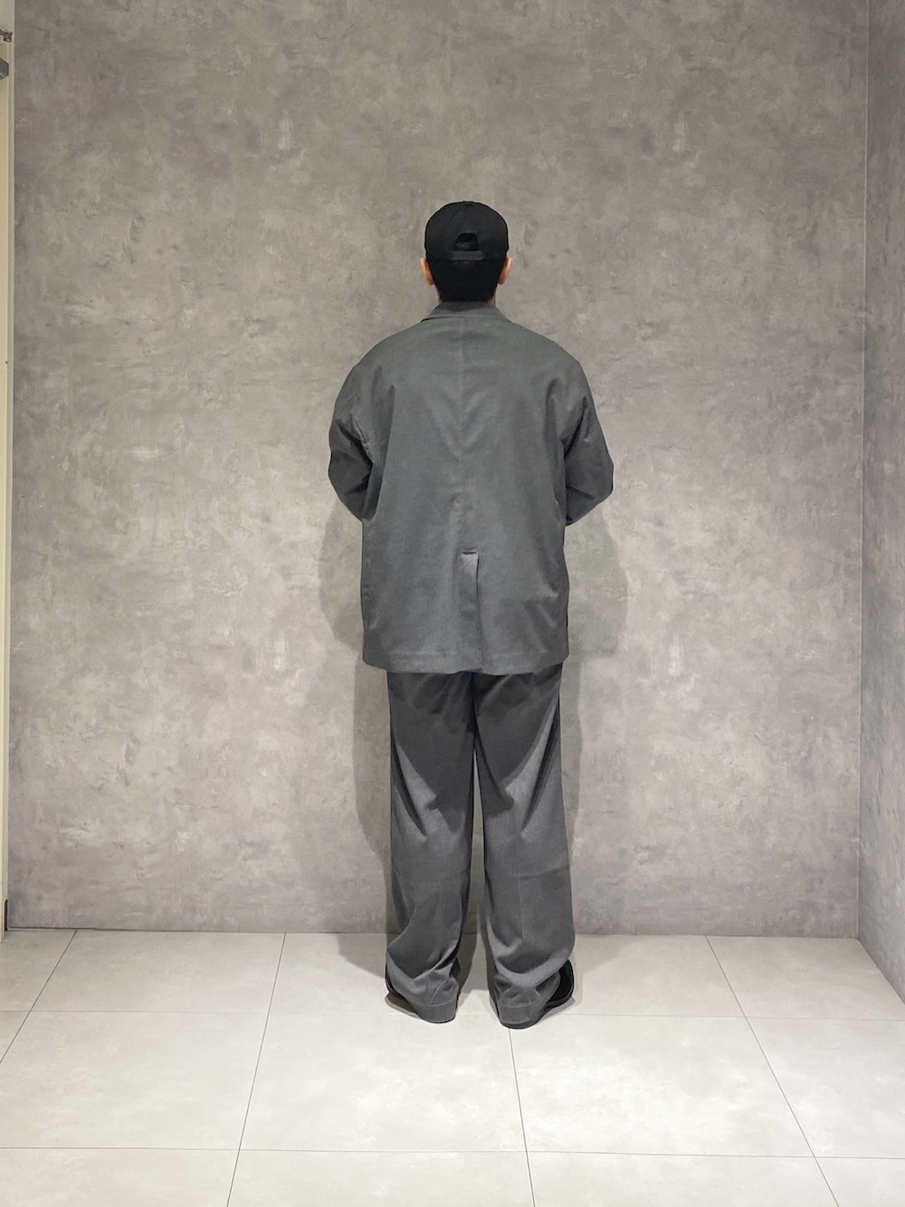 グレーのセットアップにインナー黒を差し込むとかなり大人っぽい形になります。