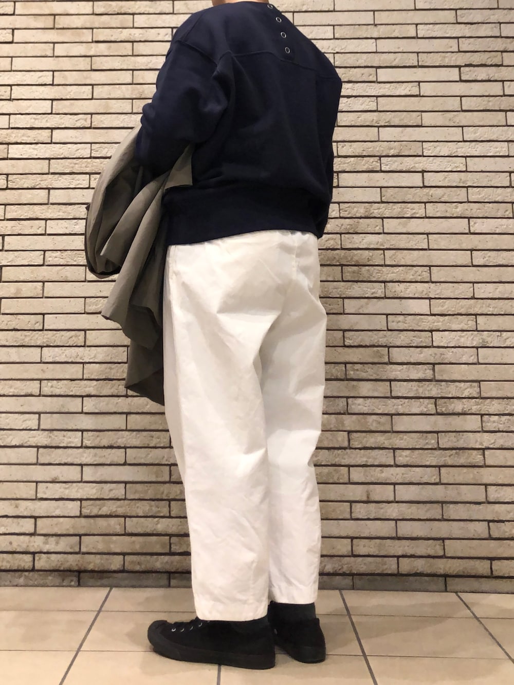 今回はスウェットに白のボトムですっきり大人カジュアルです。スウェットはバックボタンがアクセントとなりかわいいです。