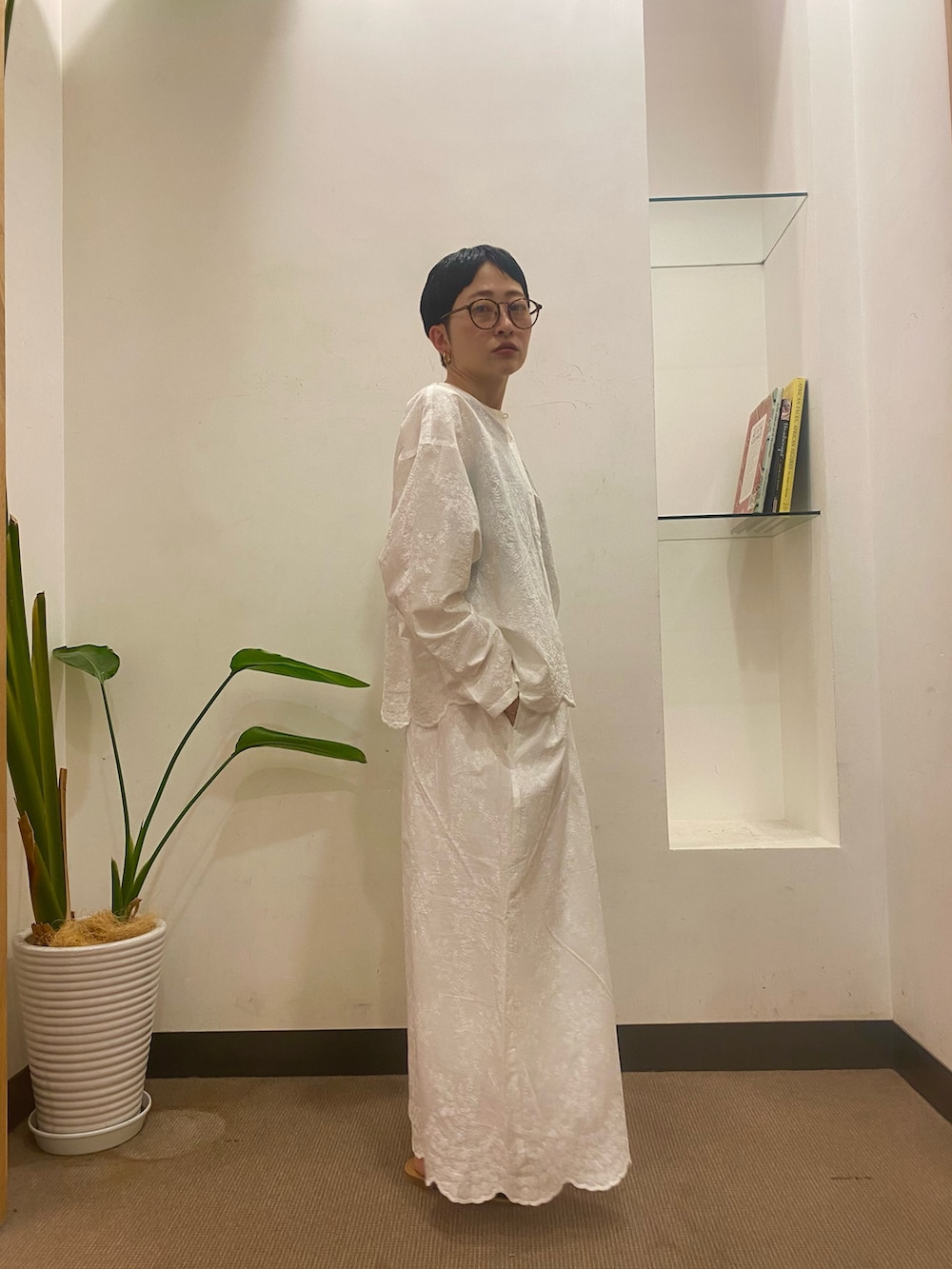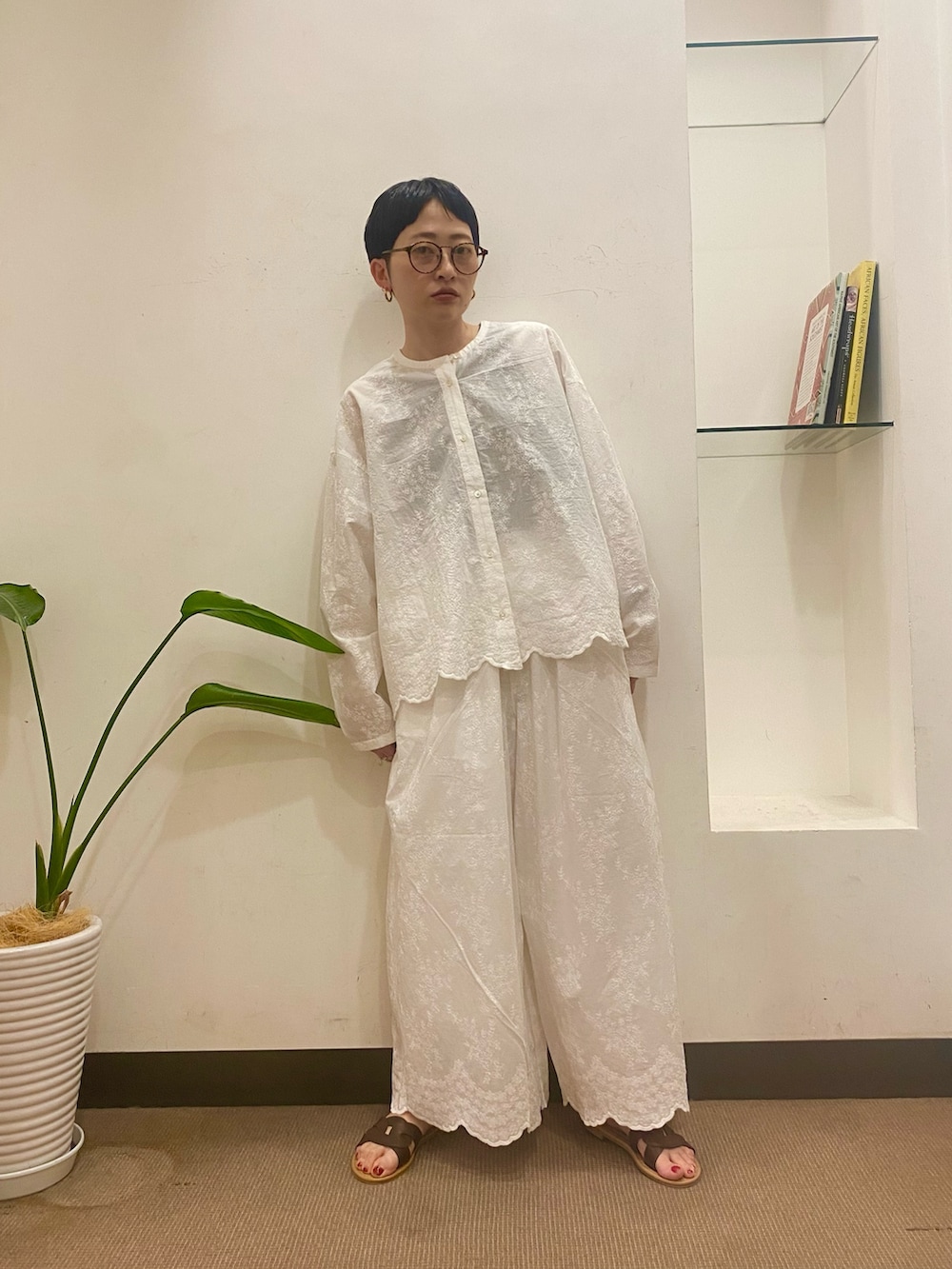 かぐれの刺繍は繊細な花柄で上品さがあります。裾がトップスとボトムスどちらもスカラップになっているので、セパレートで手持ちのアイテムと合わせても華やかさが抜群に出ますよ◎