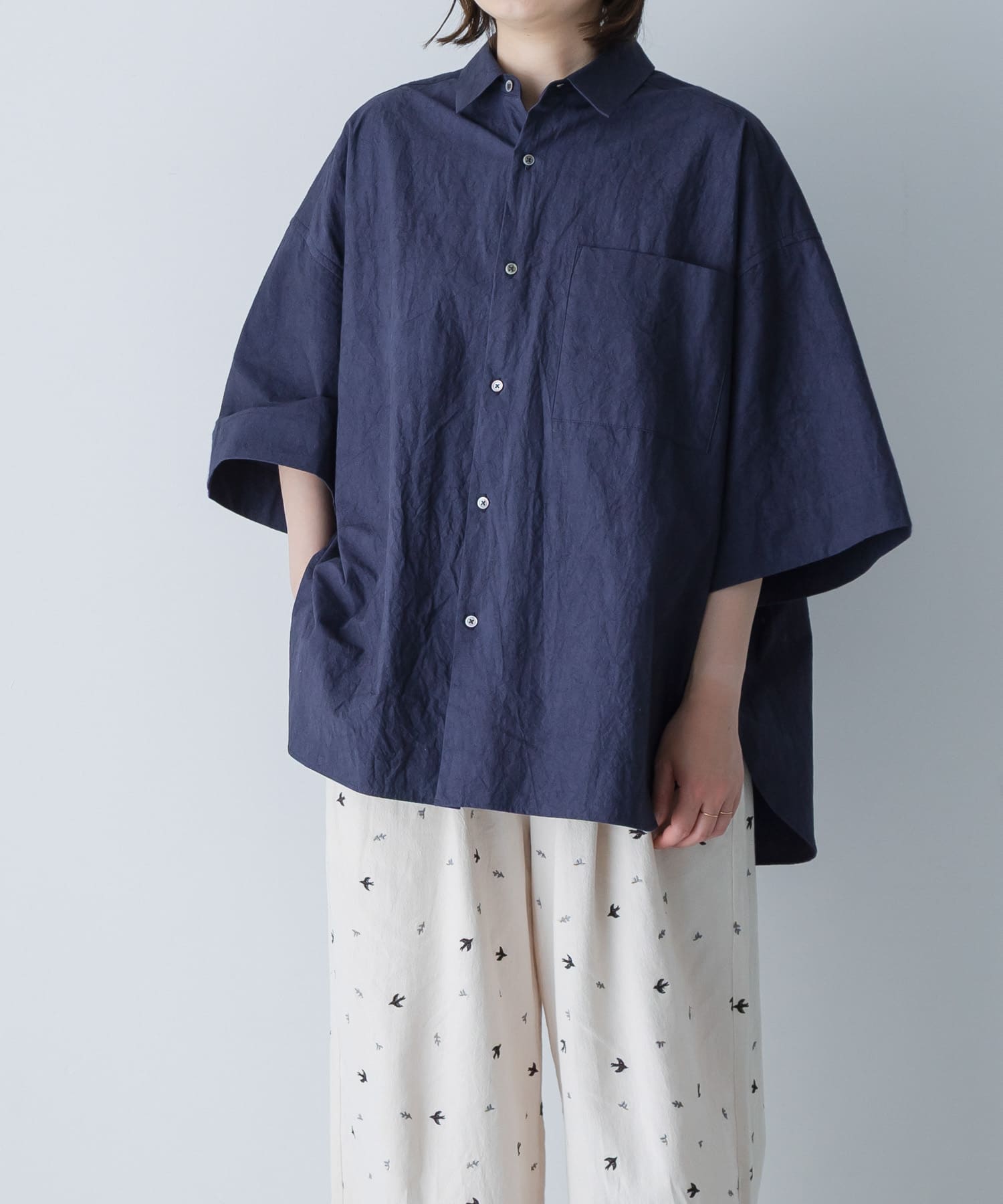 ネイビーカラーが新鮮な半袖シャツは袖の長さやオーバーサイズがお気に入りです♪