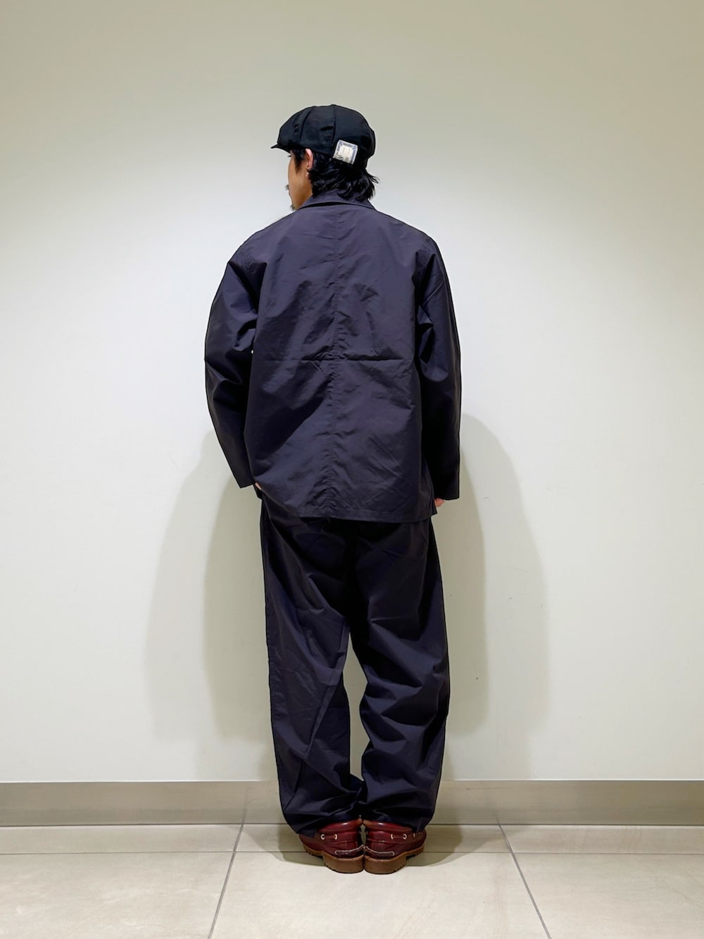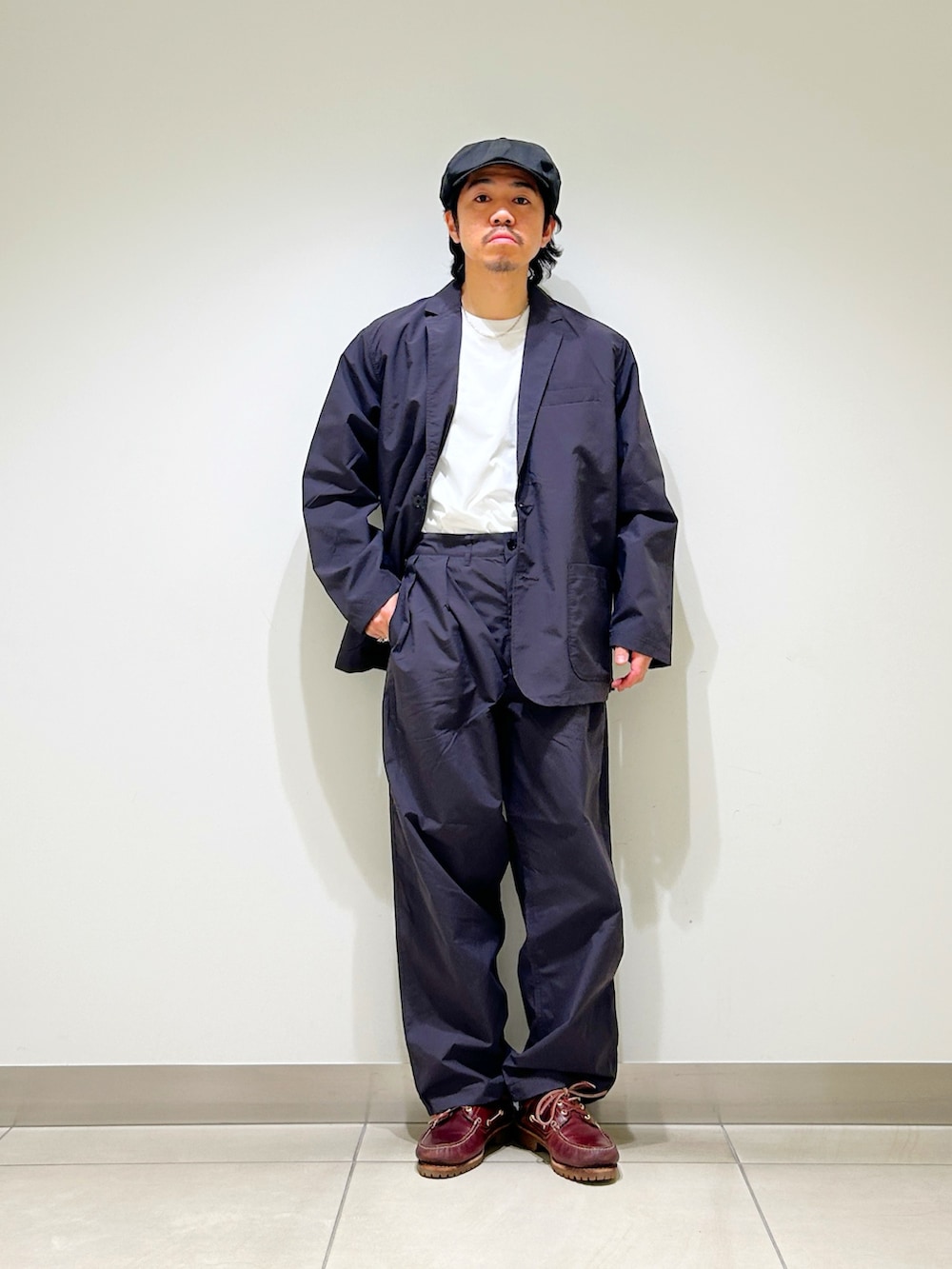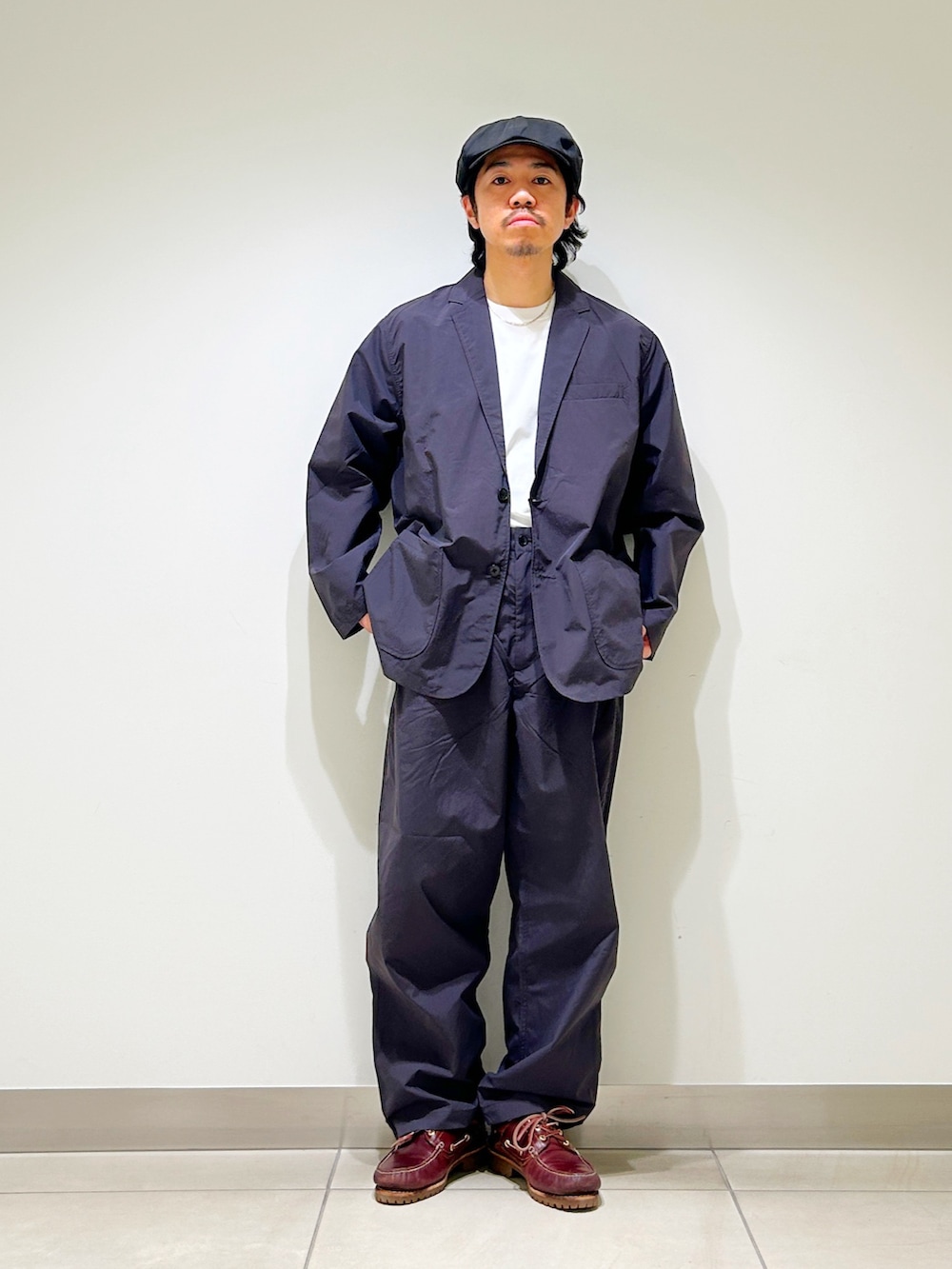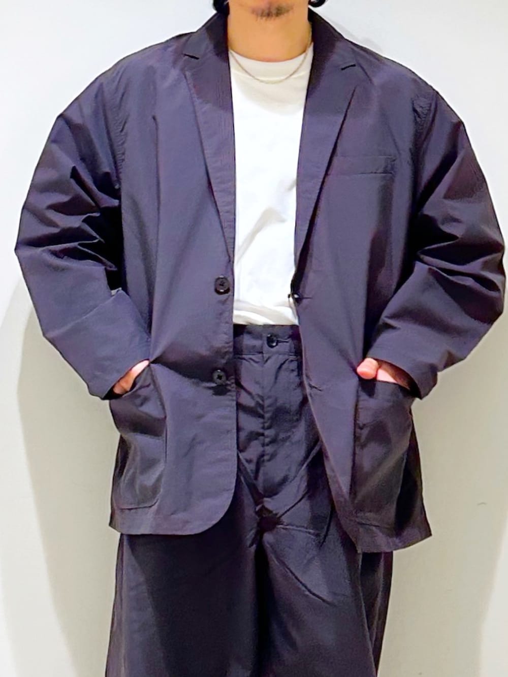 ジャケットもディテールはテーラードそのものですが、ざっくり羽織れるサイズ感。