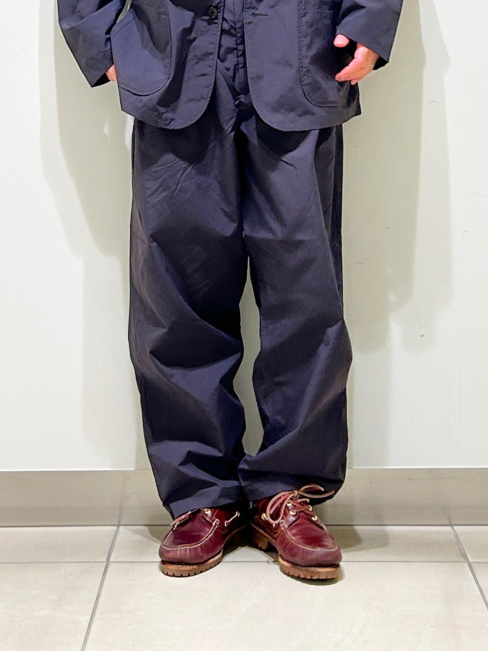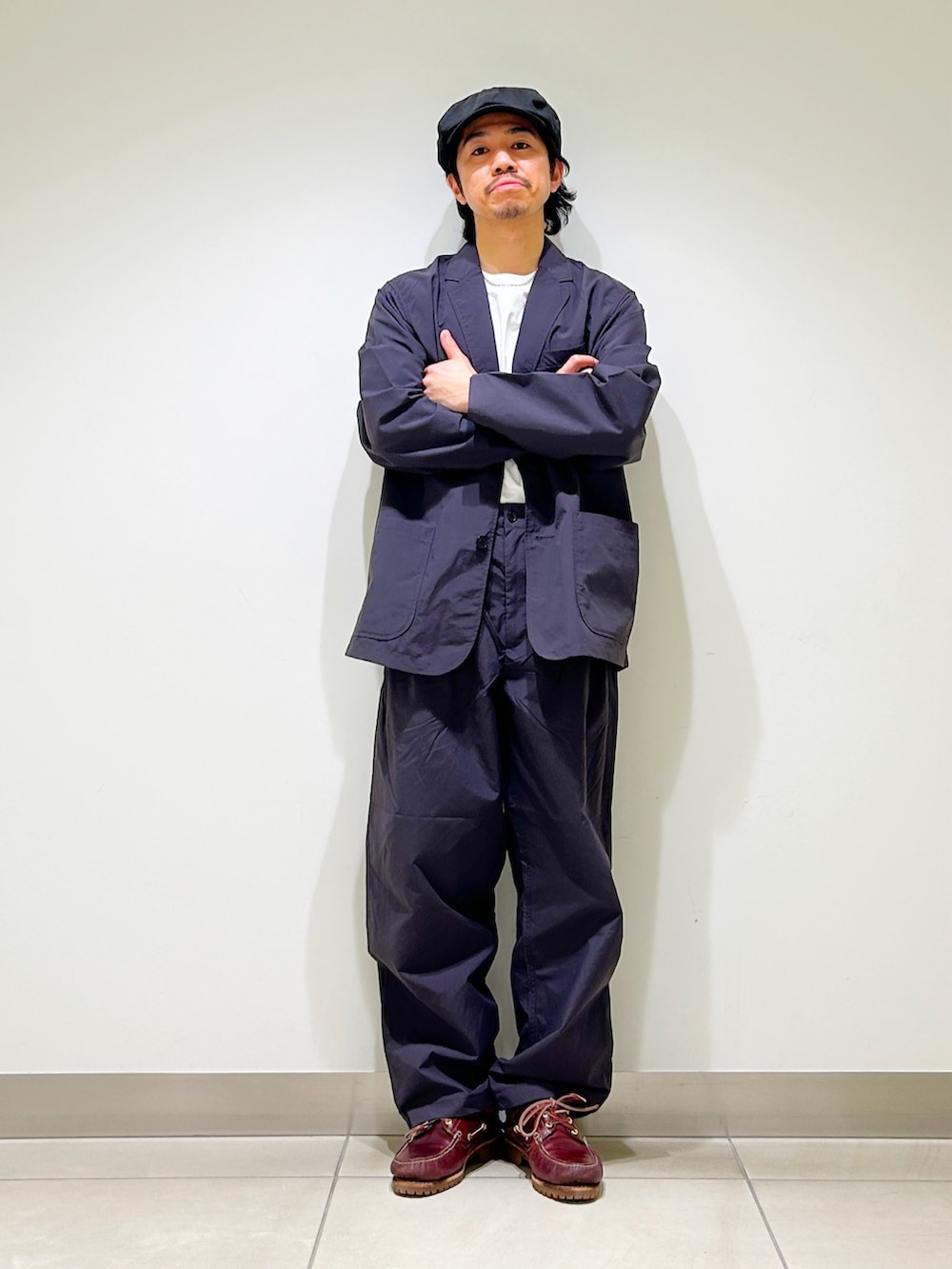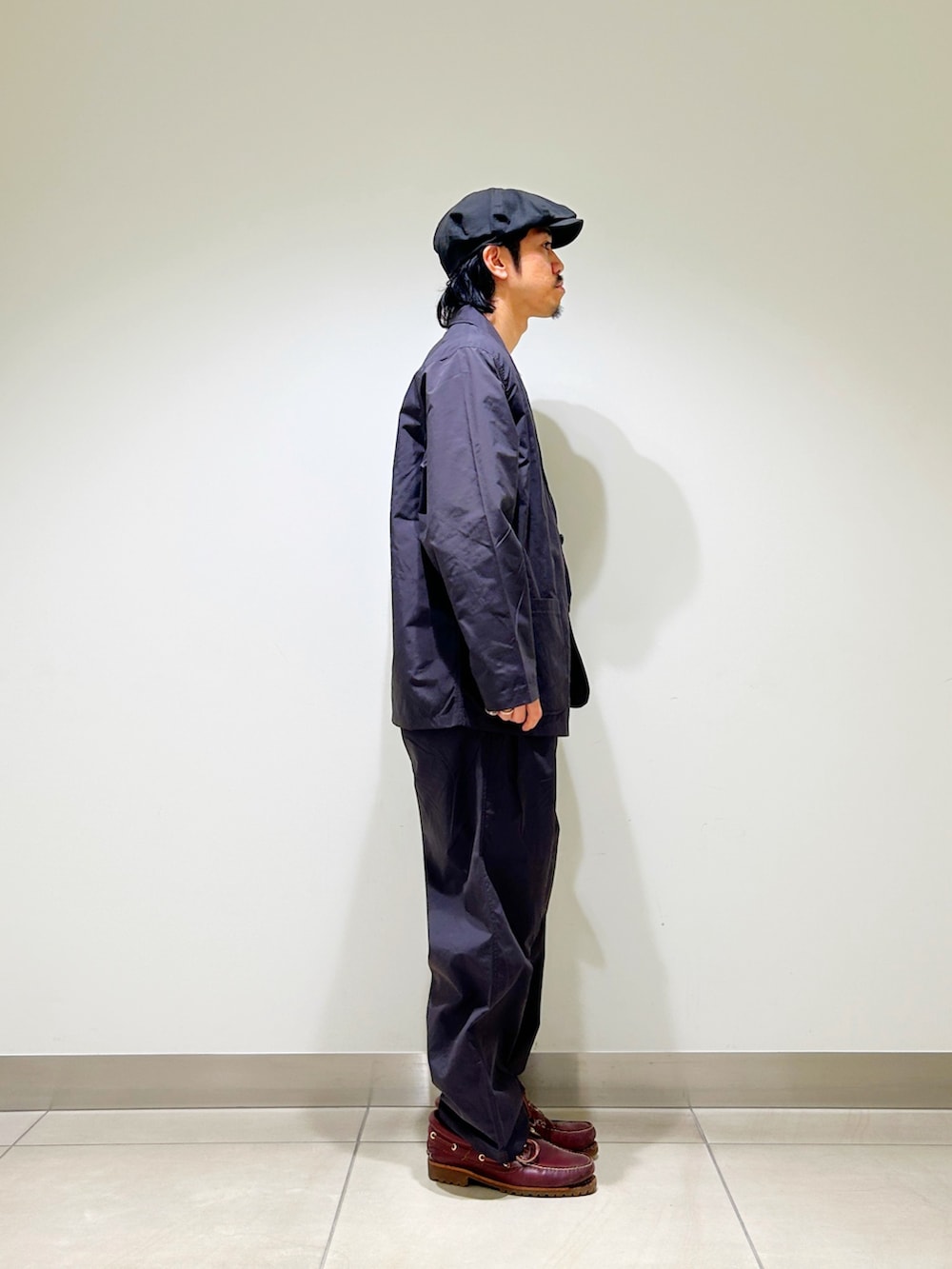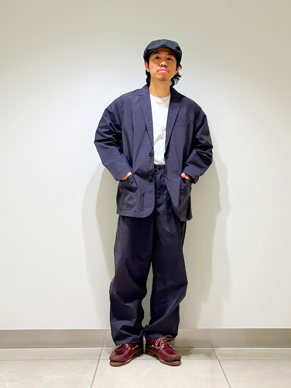 ジャケットもディテールはテーラードそのものですが、ざっくり羽織れるサイズ感。