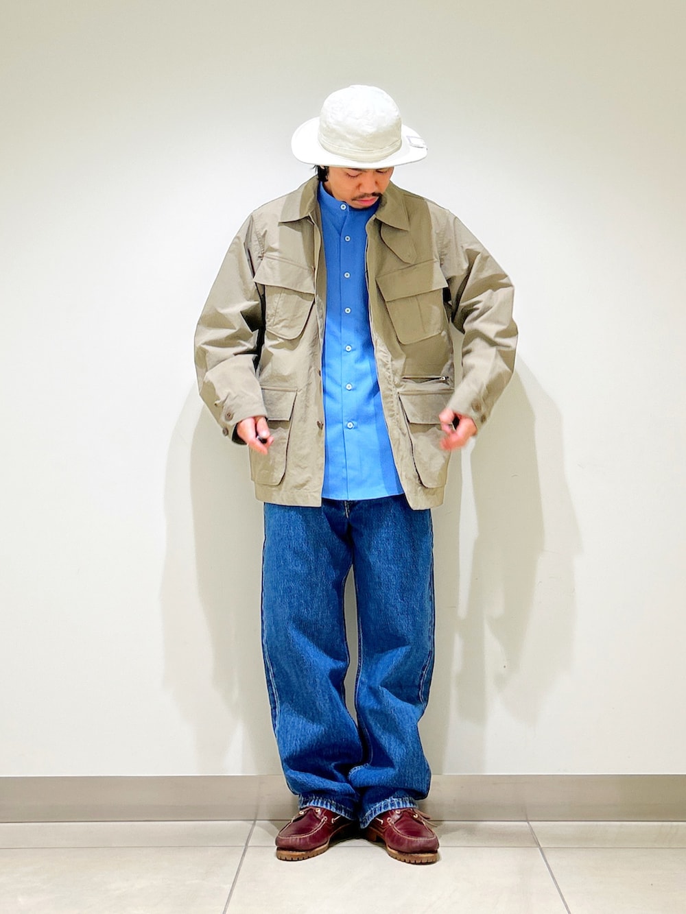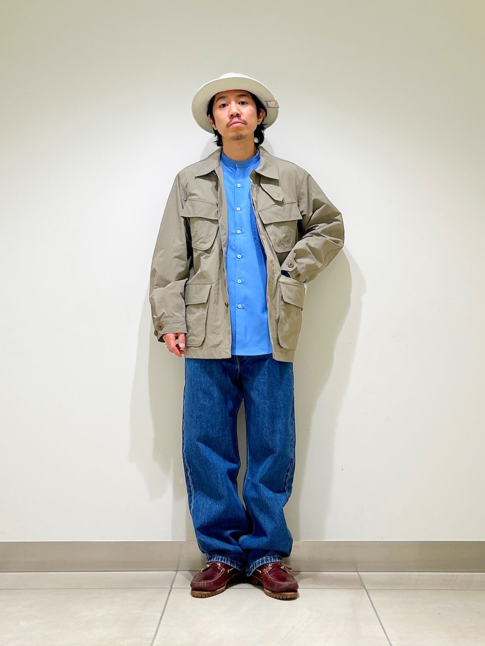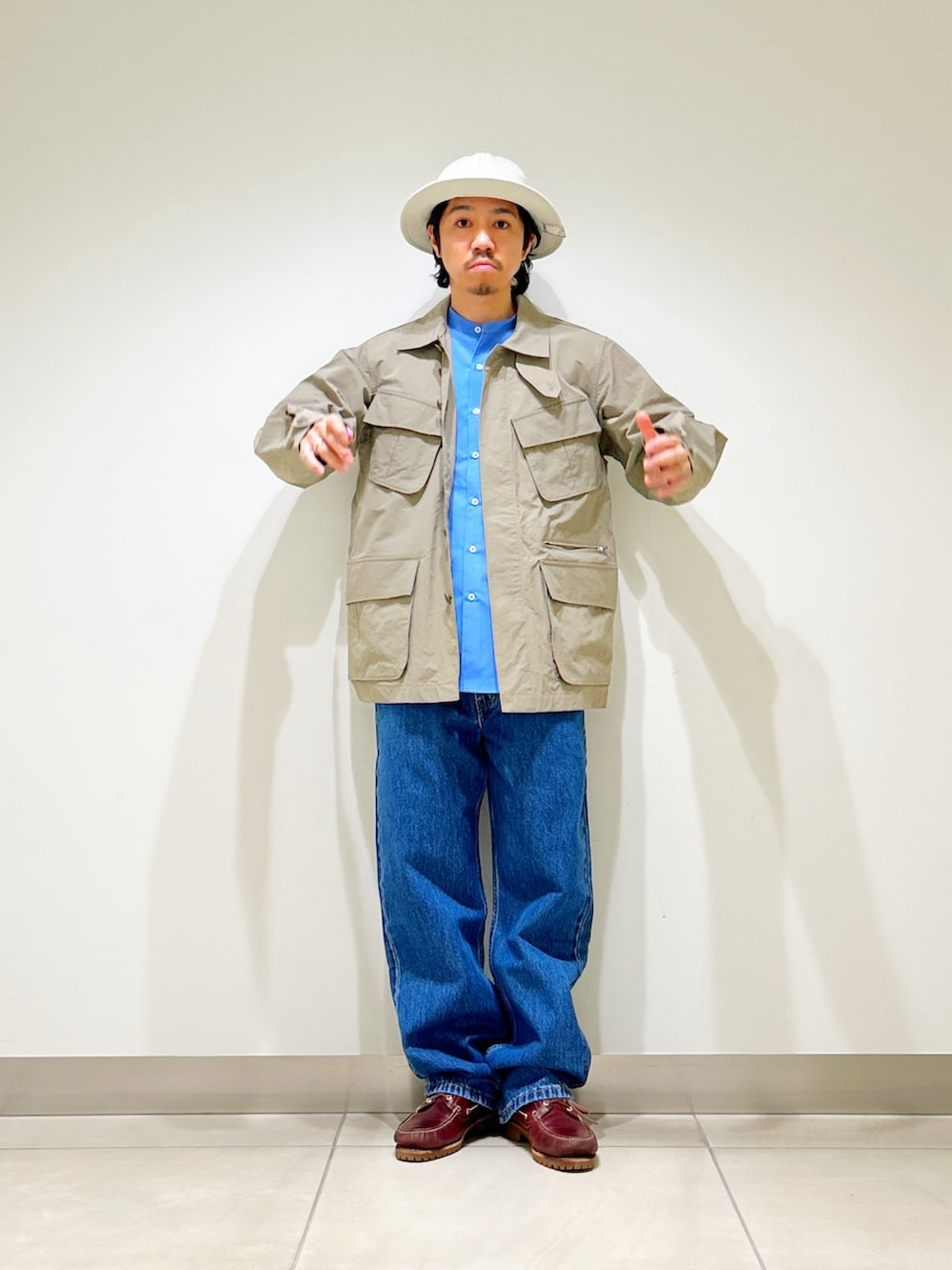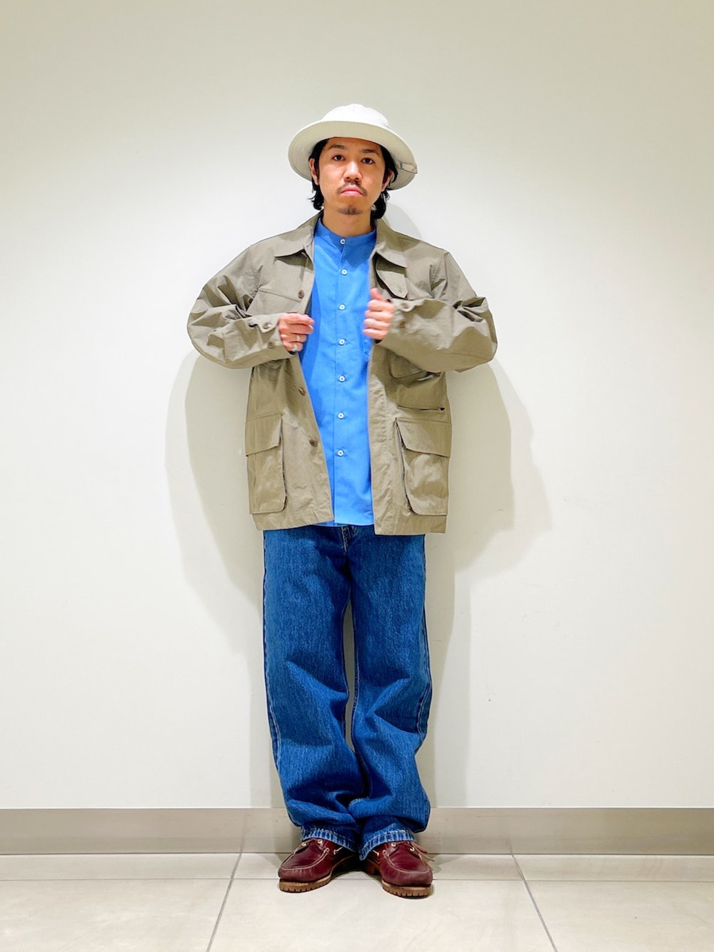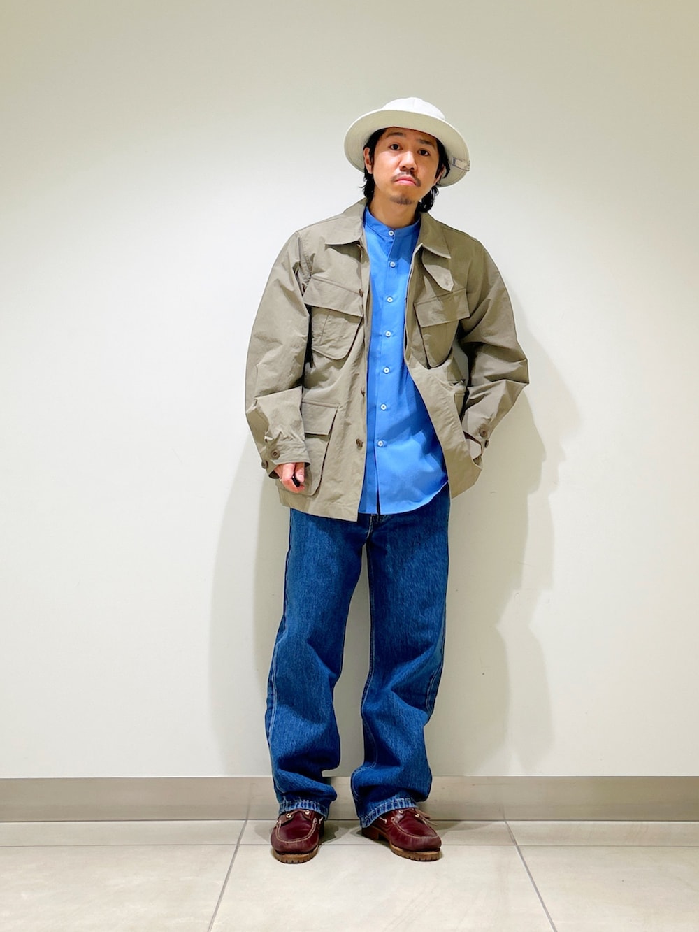 王道のデニム合わせと、異素材シャツの組み合わせが現代らしいアメカジスタイルに。