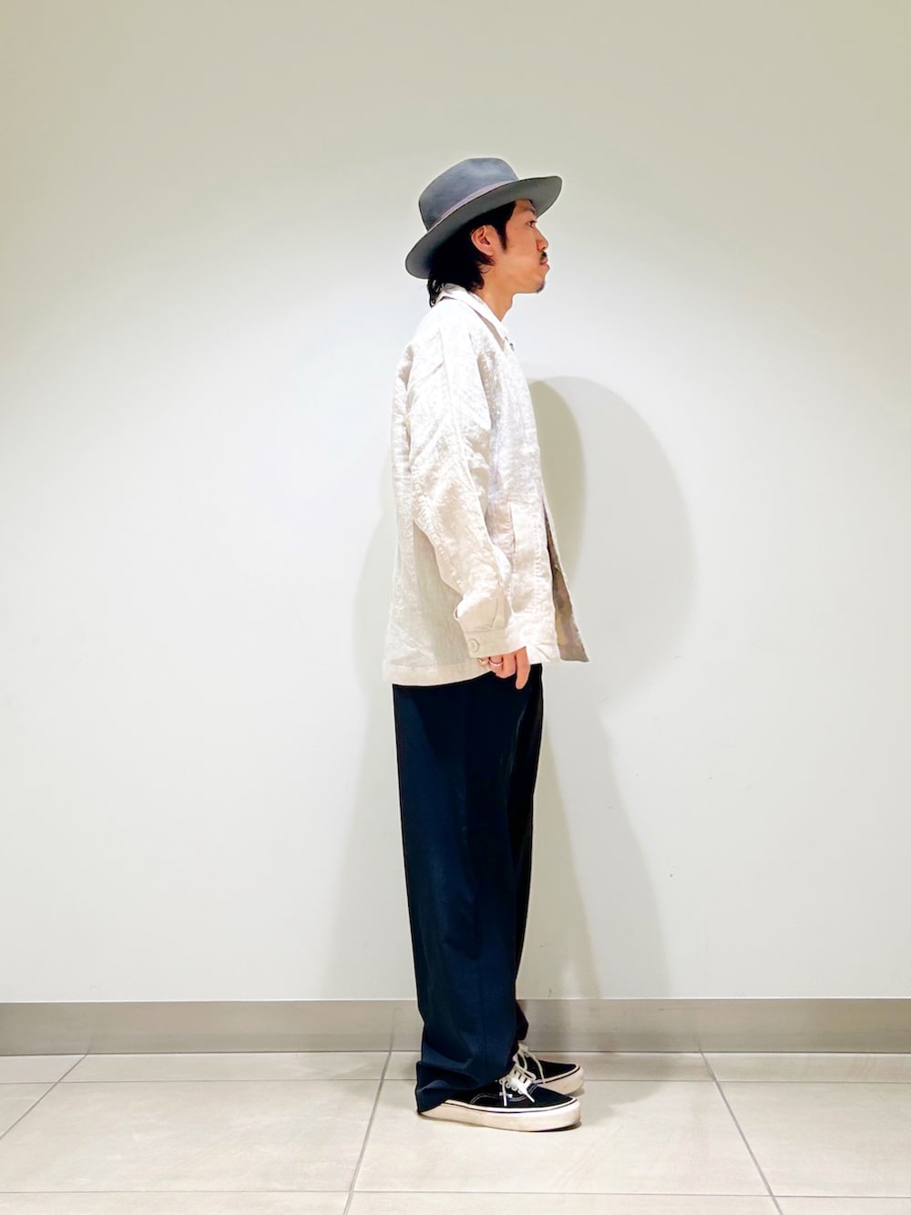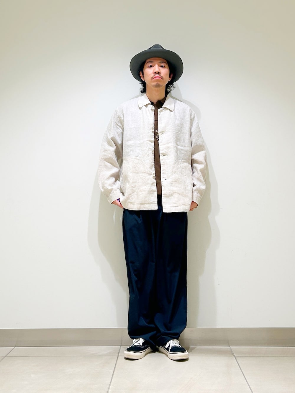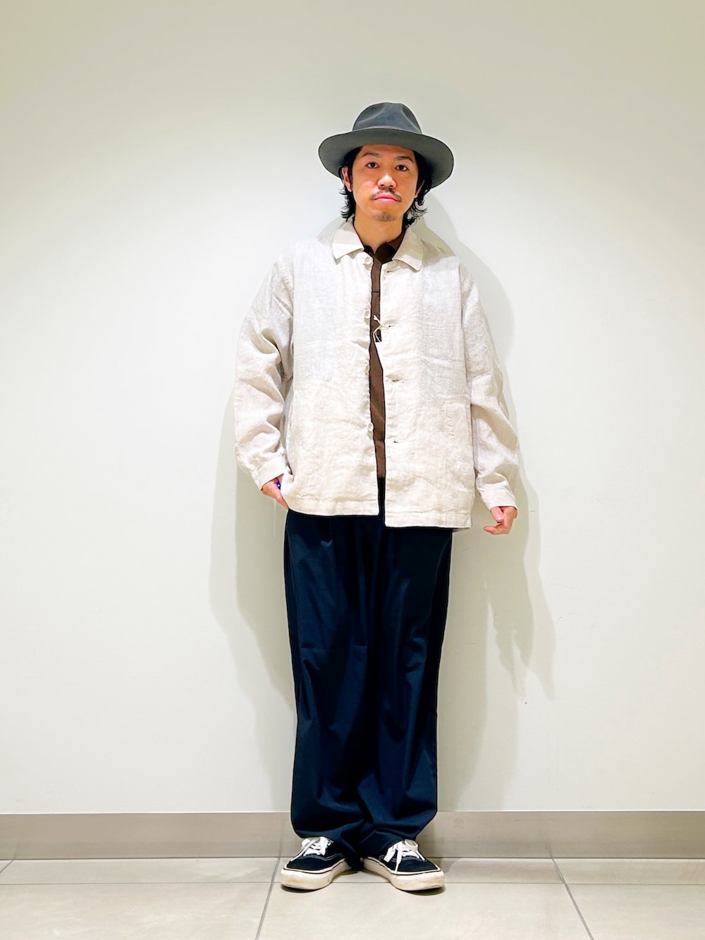 リネン素材のカバーオールシャツを合わせ、異素材同士のいい塩梅を楽しめます!