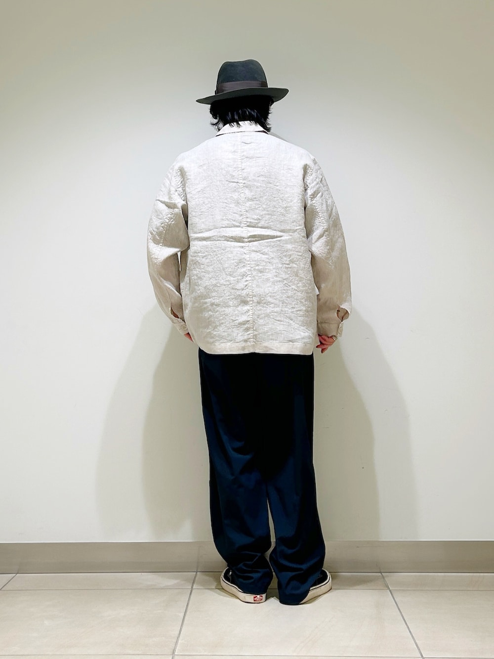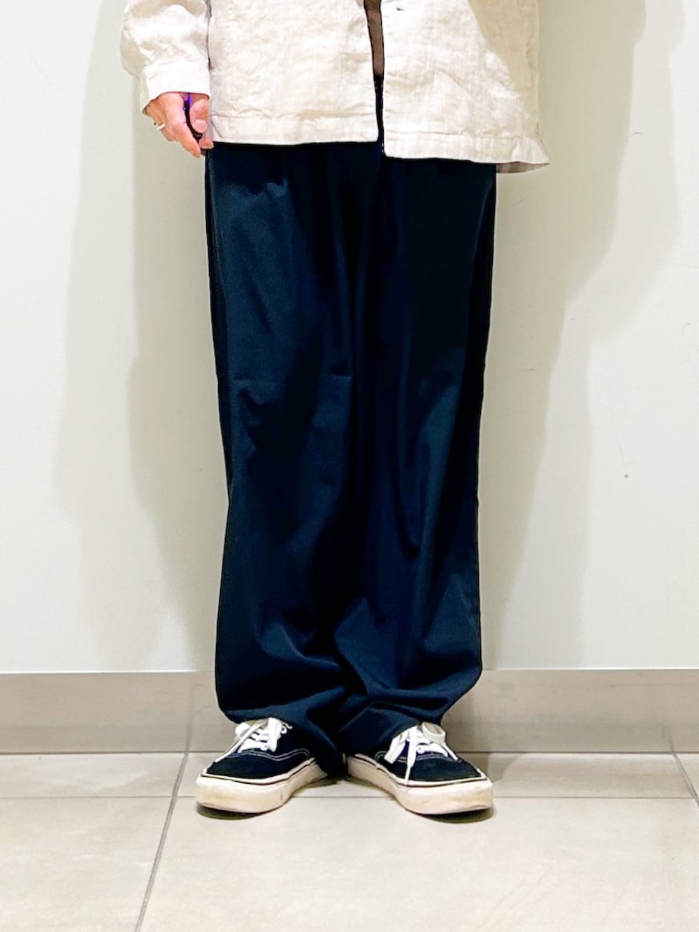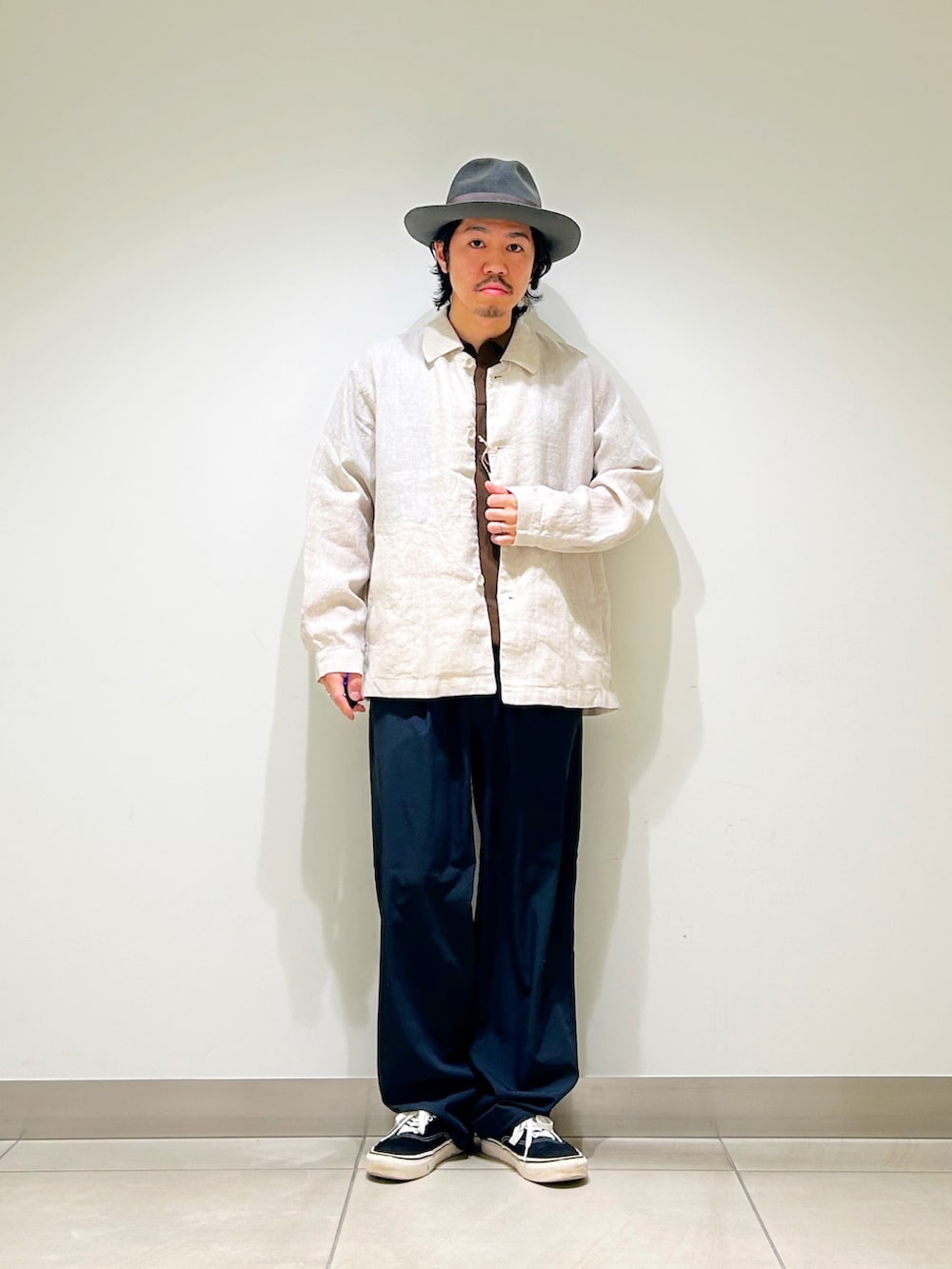 リネン素材のカバーオールシャツを合わせ、異素材同士のいい塩梅を楽しめます!