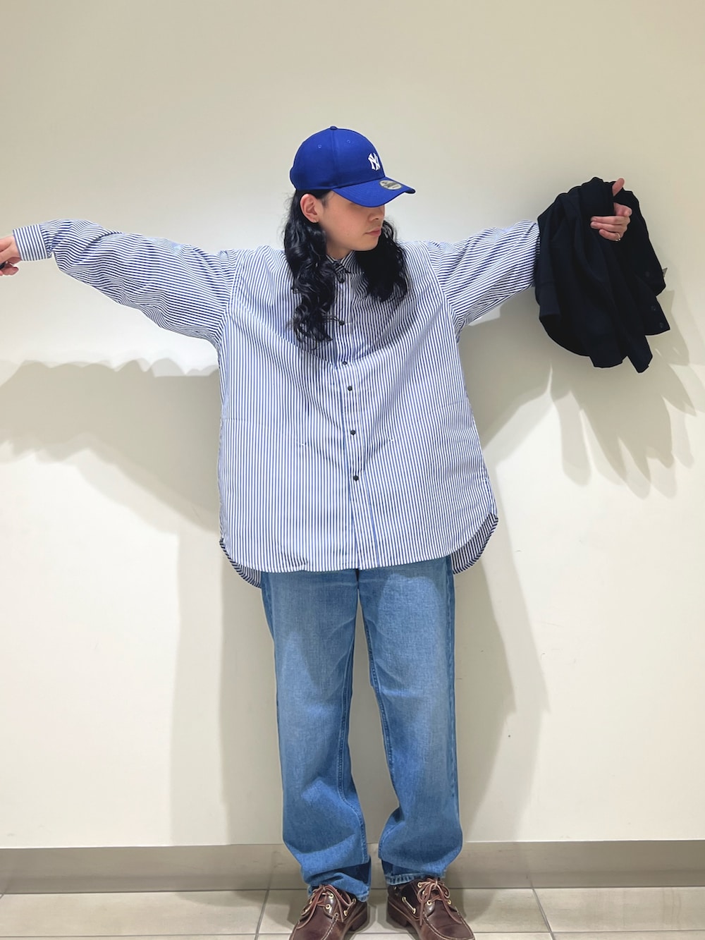 ストライプシャツの上からスウェットカーディガンを羽織ってシャツをチラ見せ。