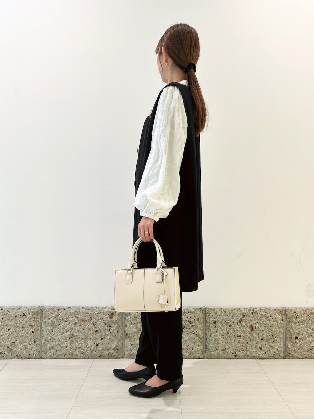 ベストはシンプルながらもロング丈で上品さのある一着。