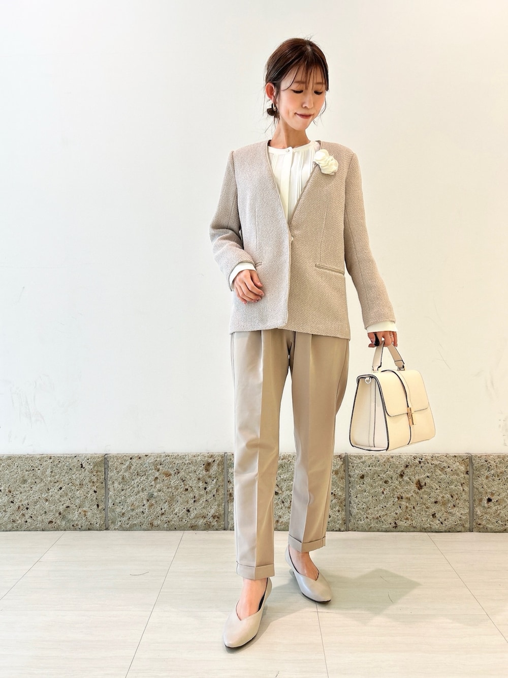華やかさ、春らしさを感じられるベージュでまとめたスタイリングです🌸
