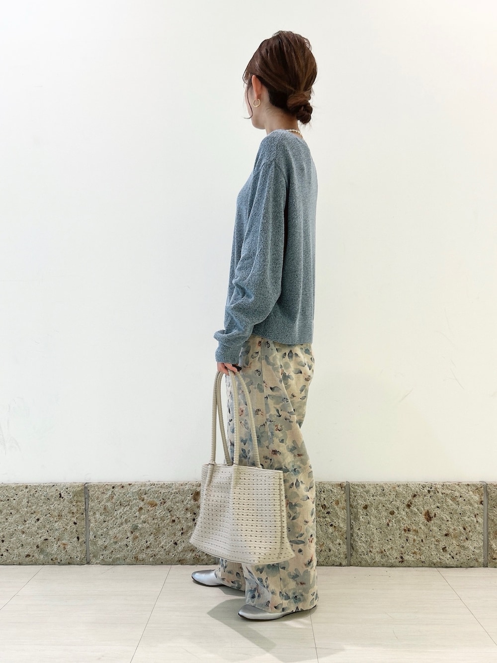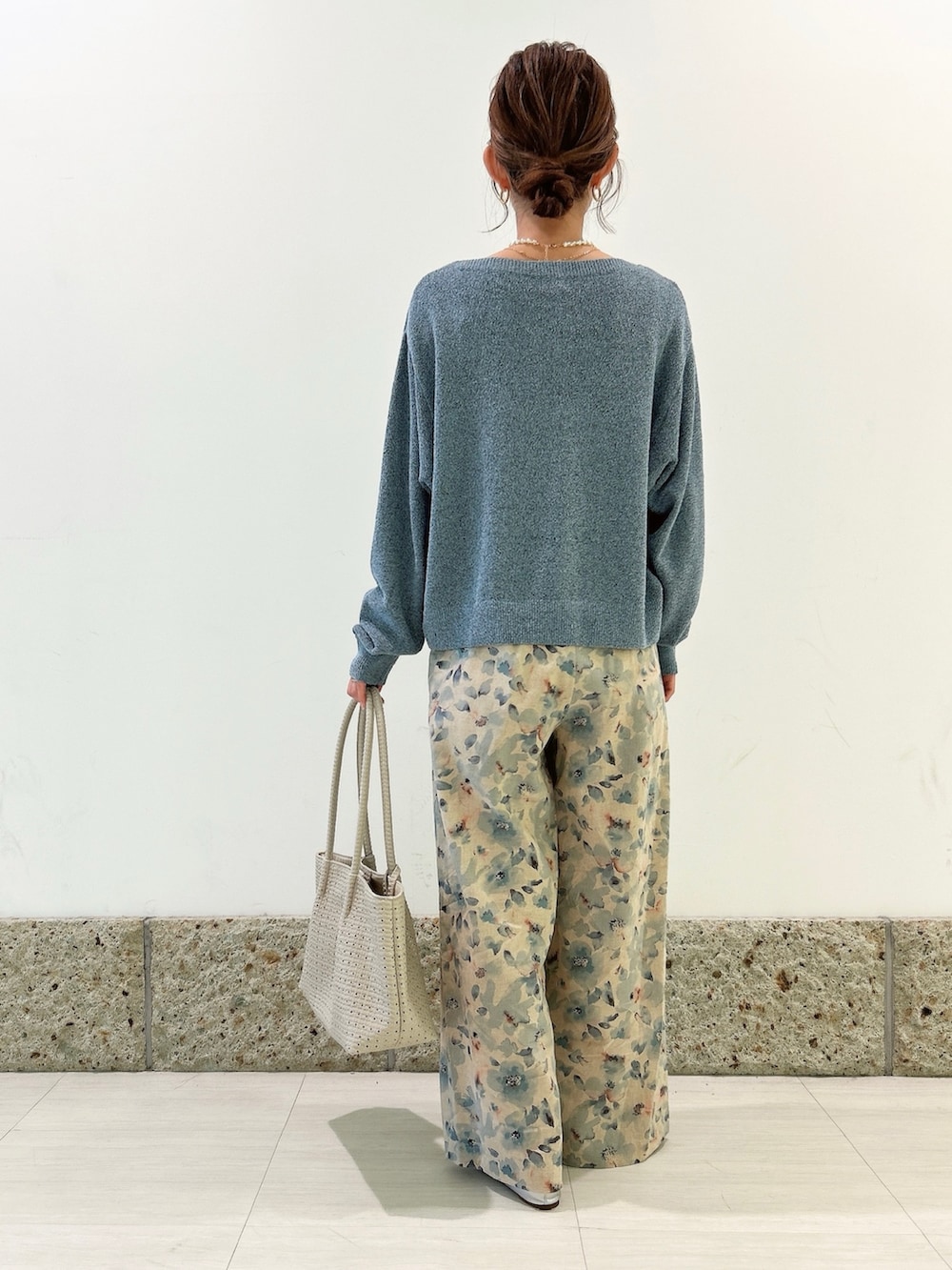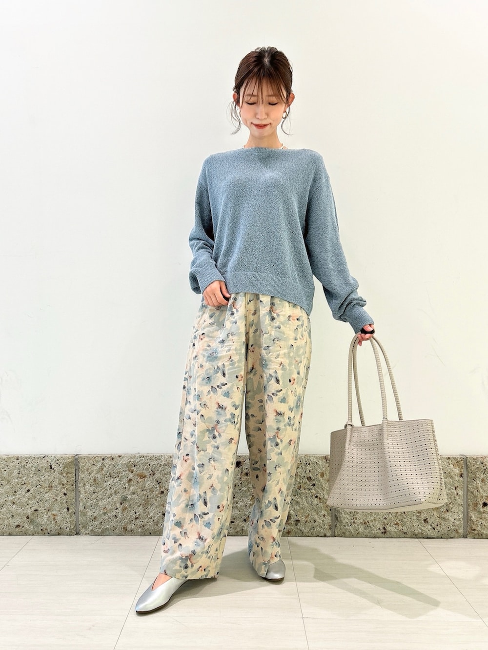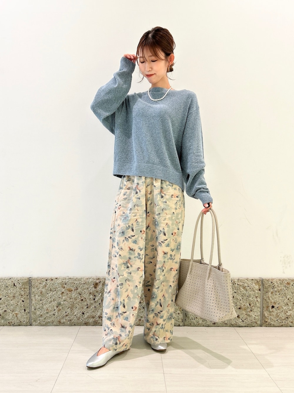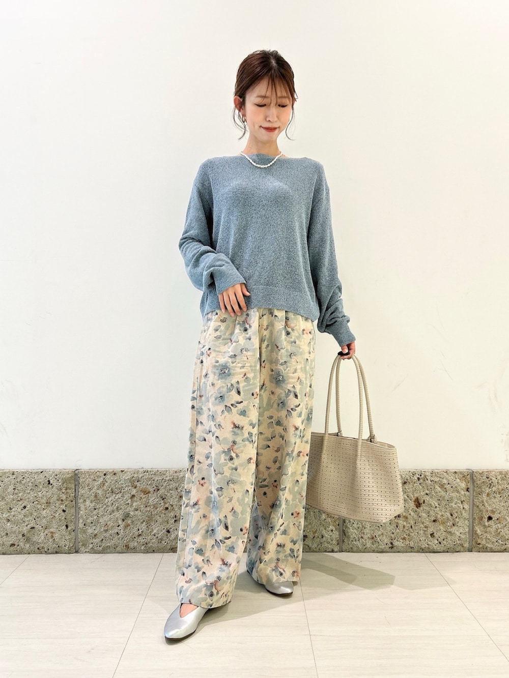 トップスはくすみライトブルーにブラック系も混ざっている
