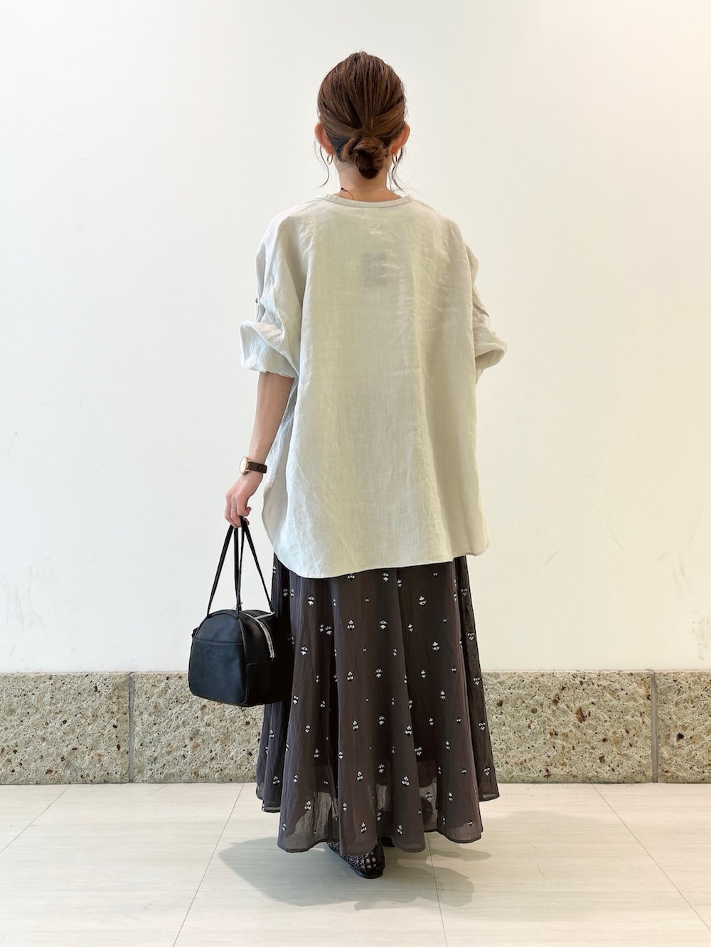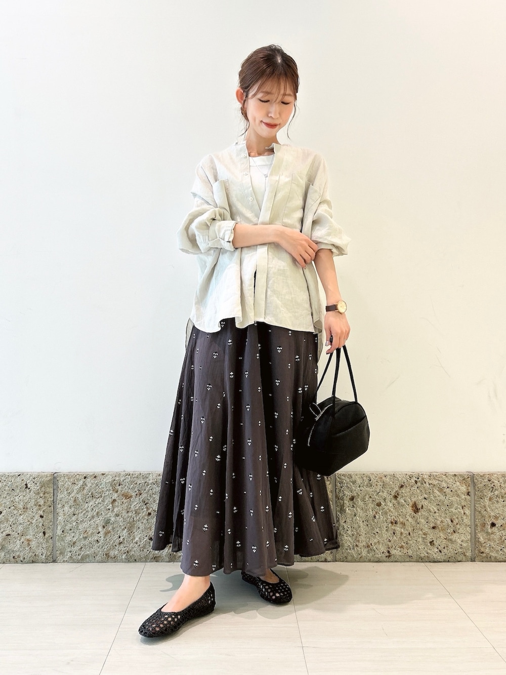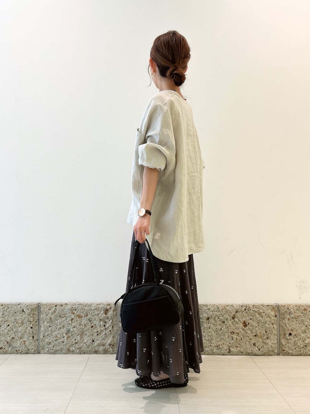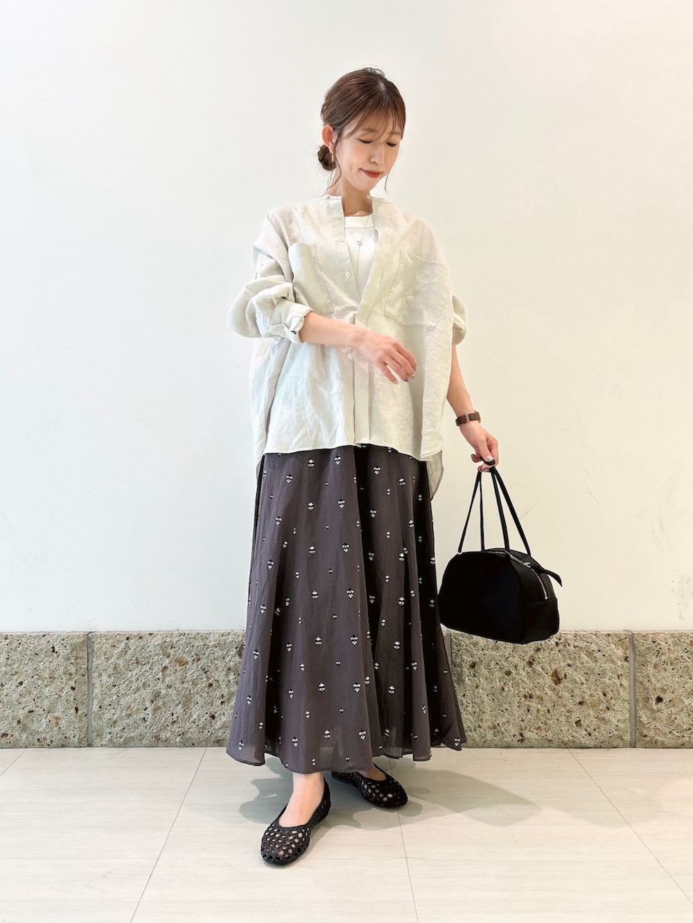 トップスは淡いグレーカラーのリネンシャツ。