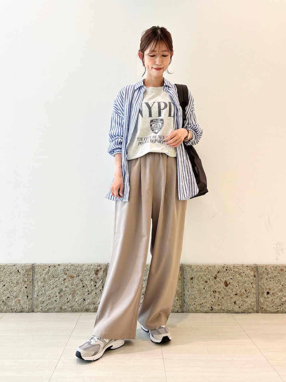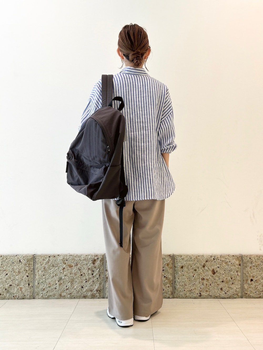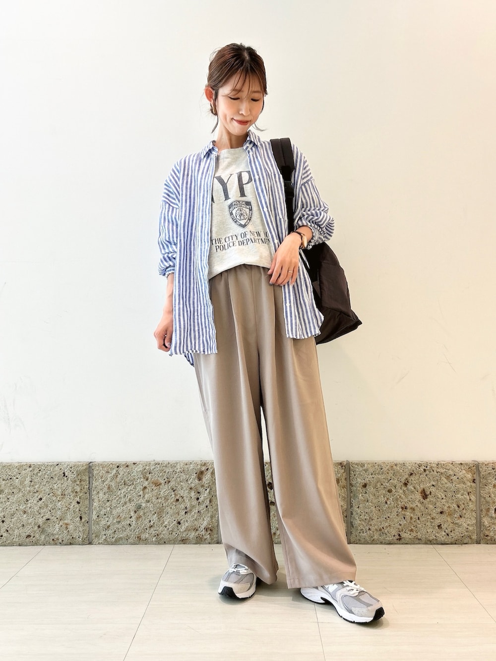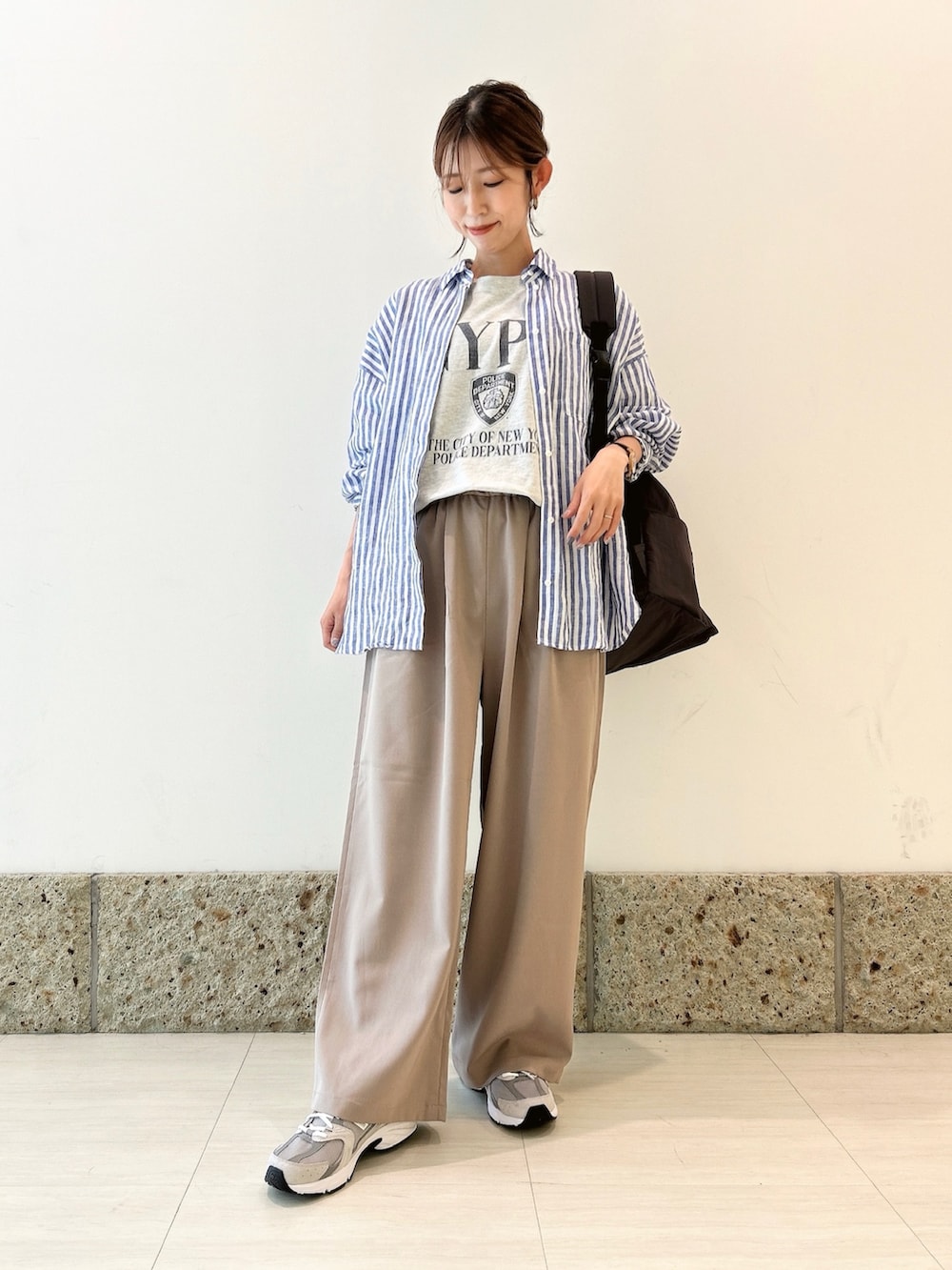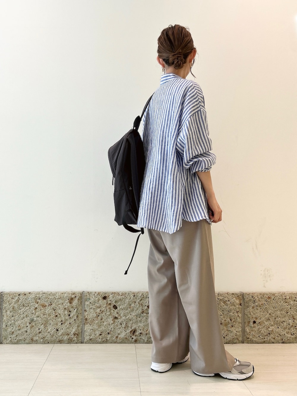 羽織りのシャツはリネン素材で肌離れ良くサラッと着られる一着。