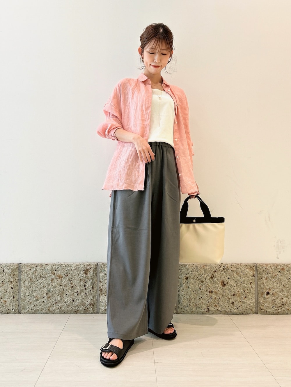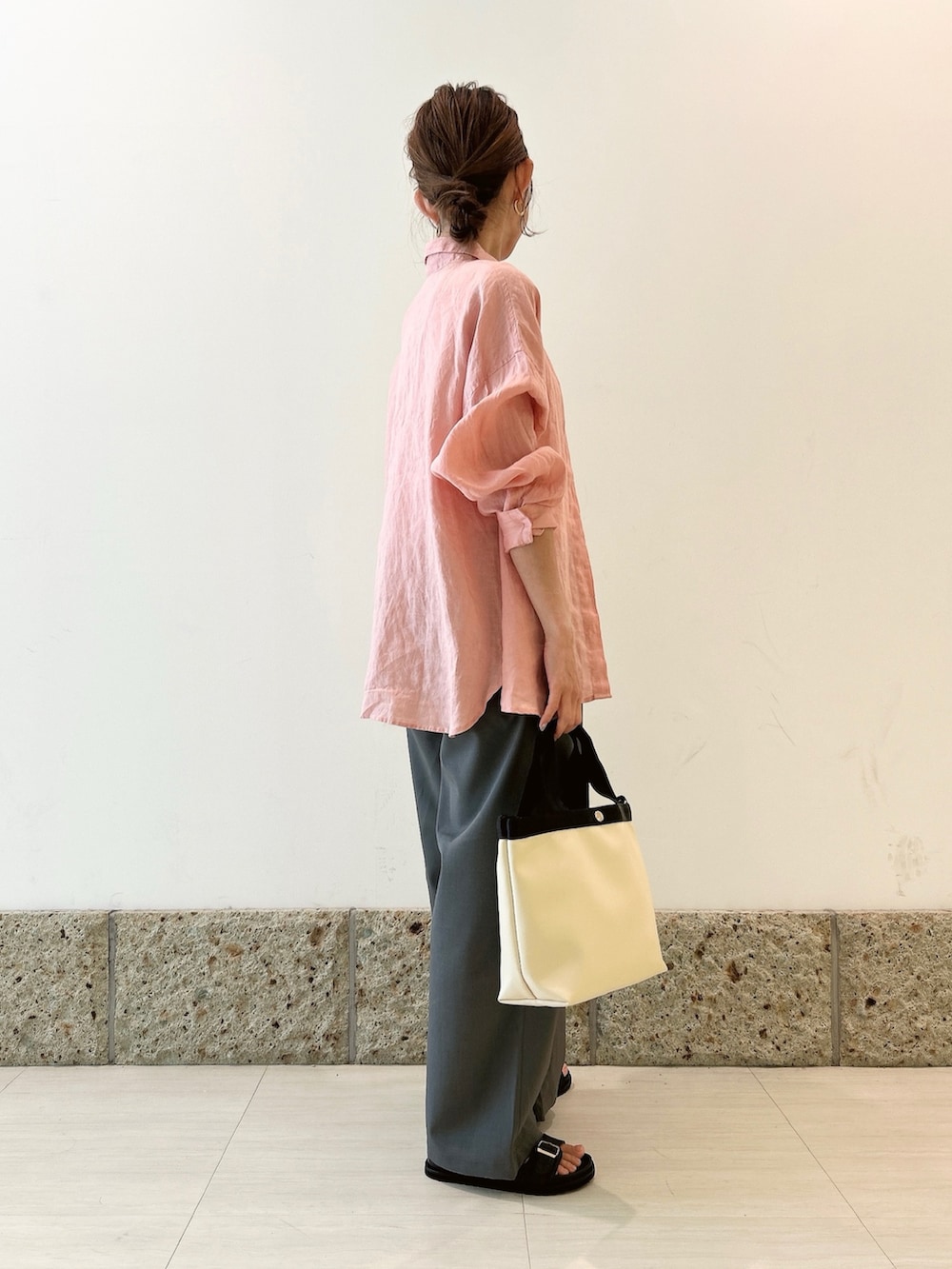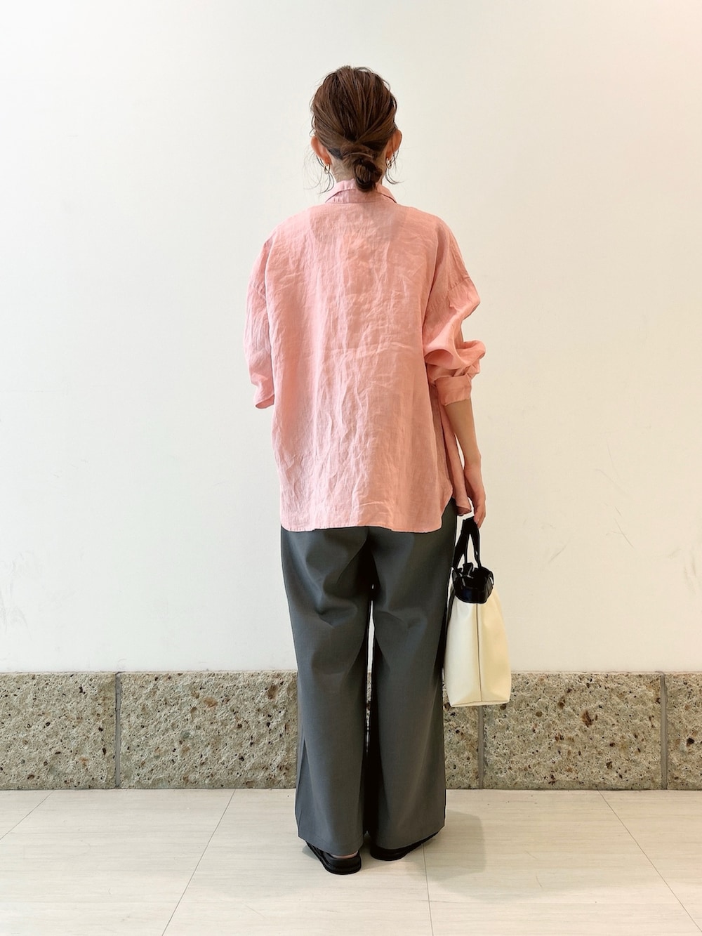 羽織りのシャツはコーラルピンクのような明るさと柔らかさを