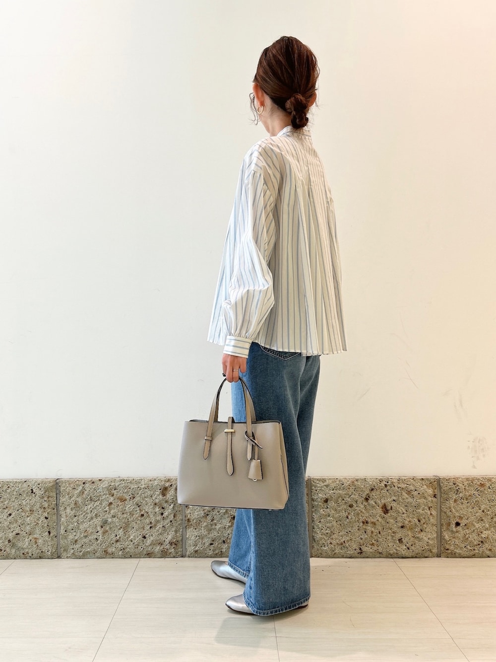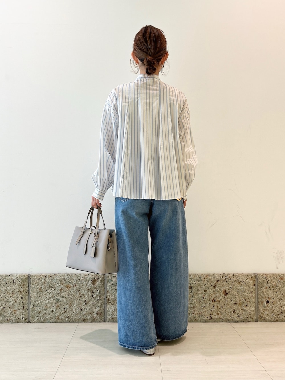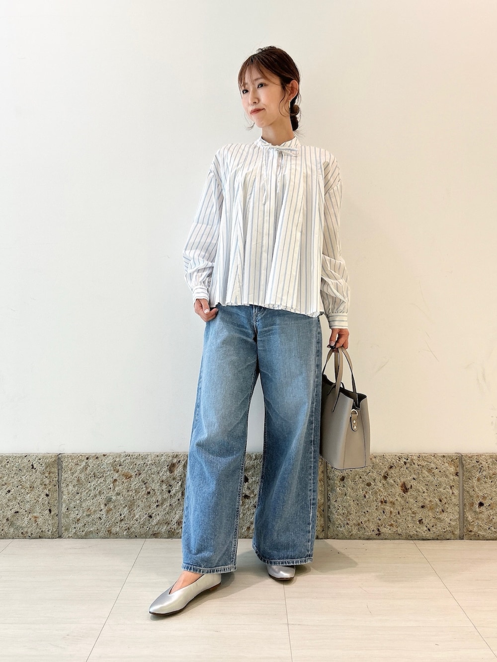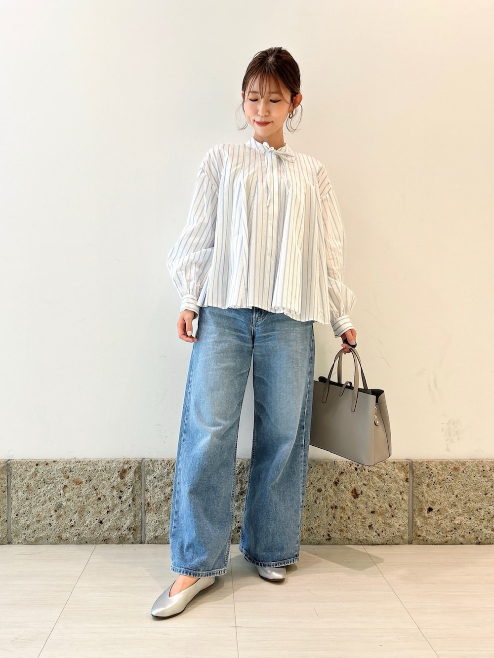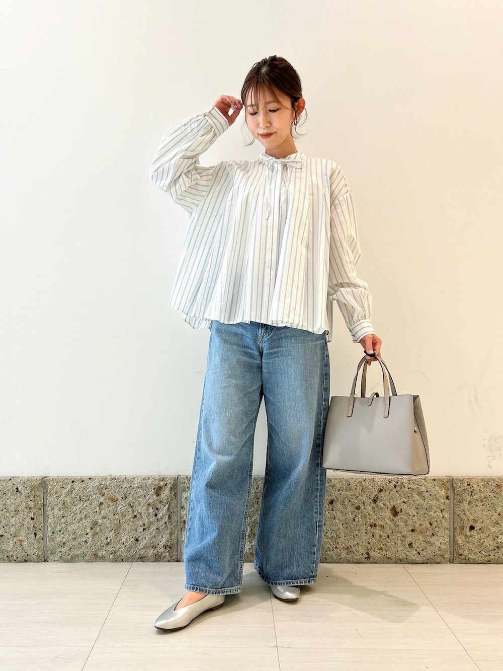 トップスはホワイト×ライトブルーのストライプ柄の