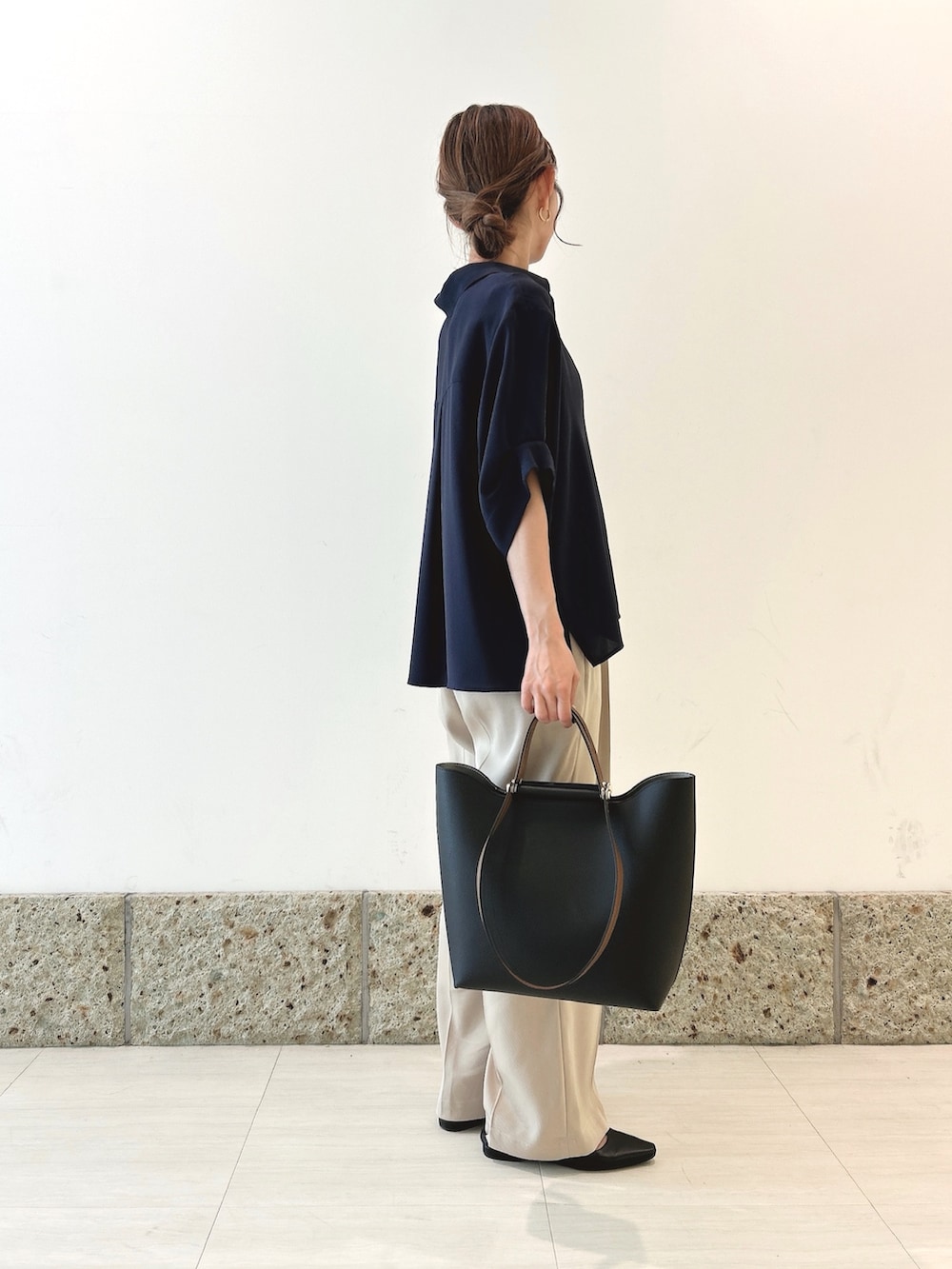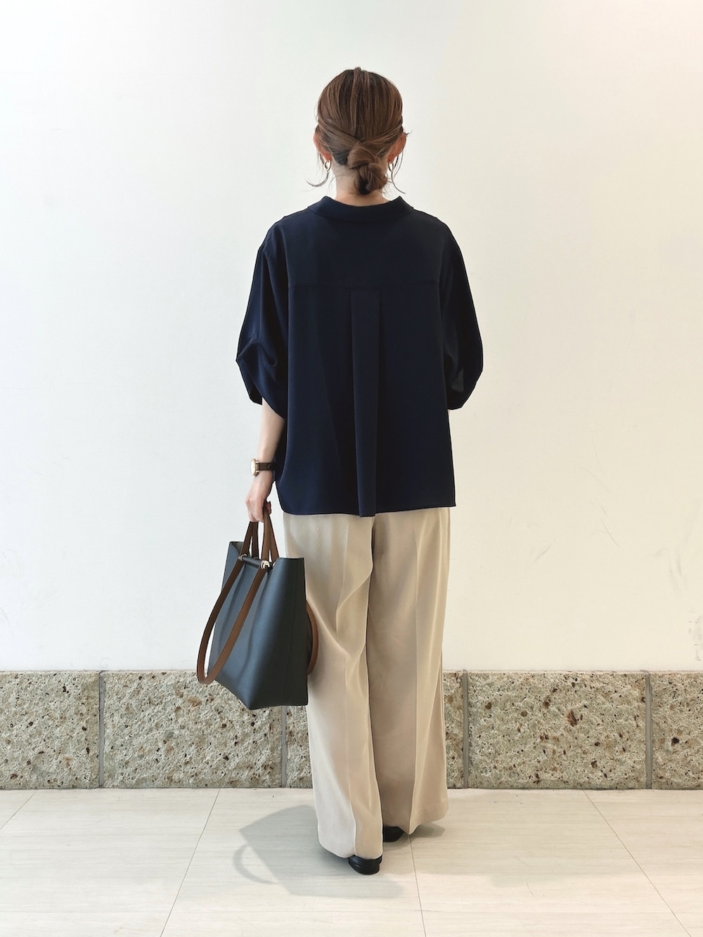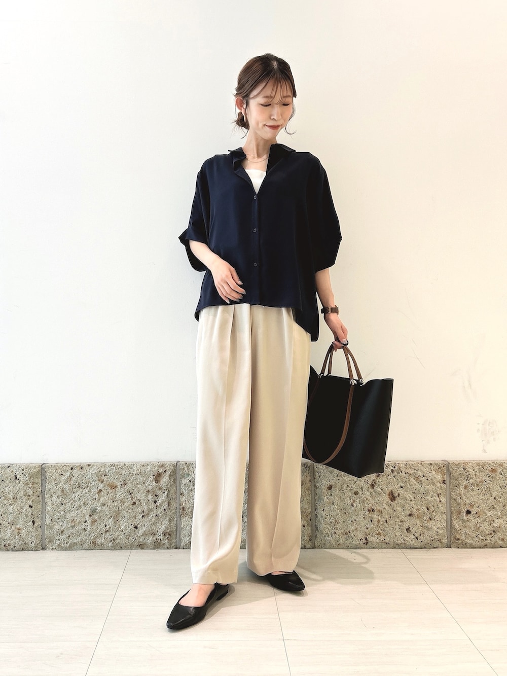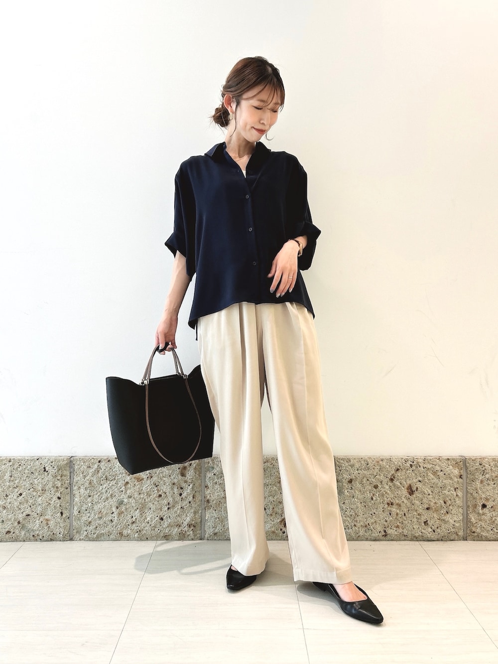 トップスはサラッとしつつもとろみ感のあるシャツブラウス。
