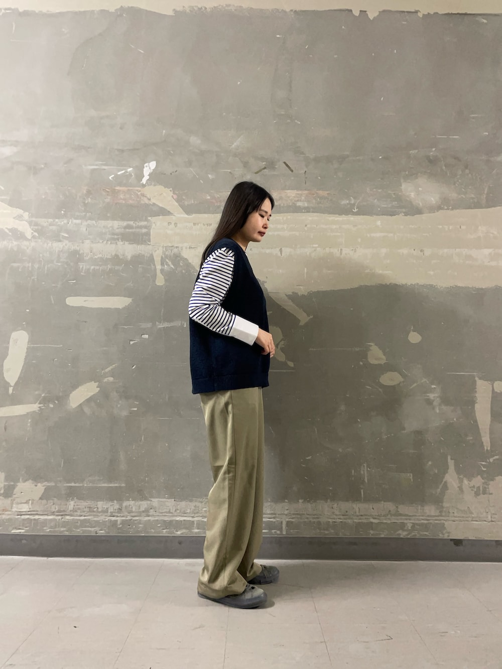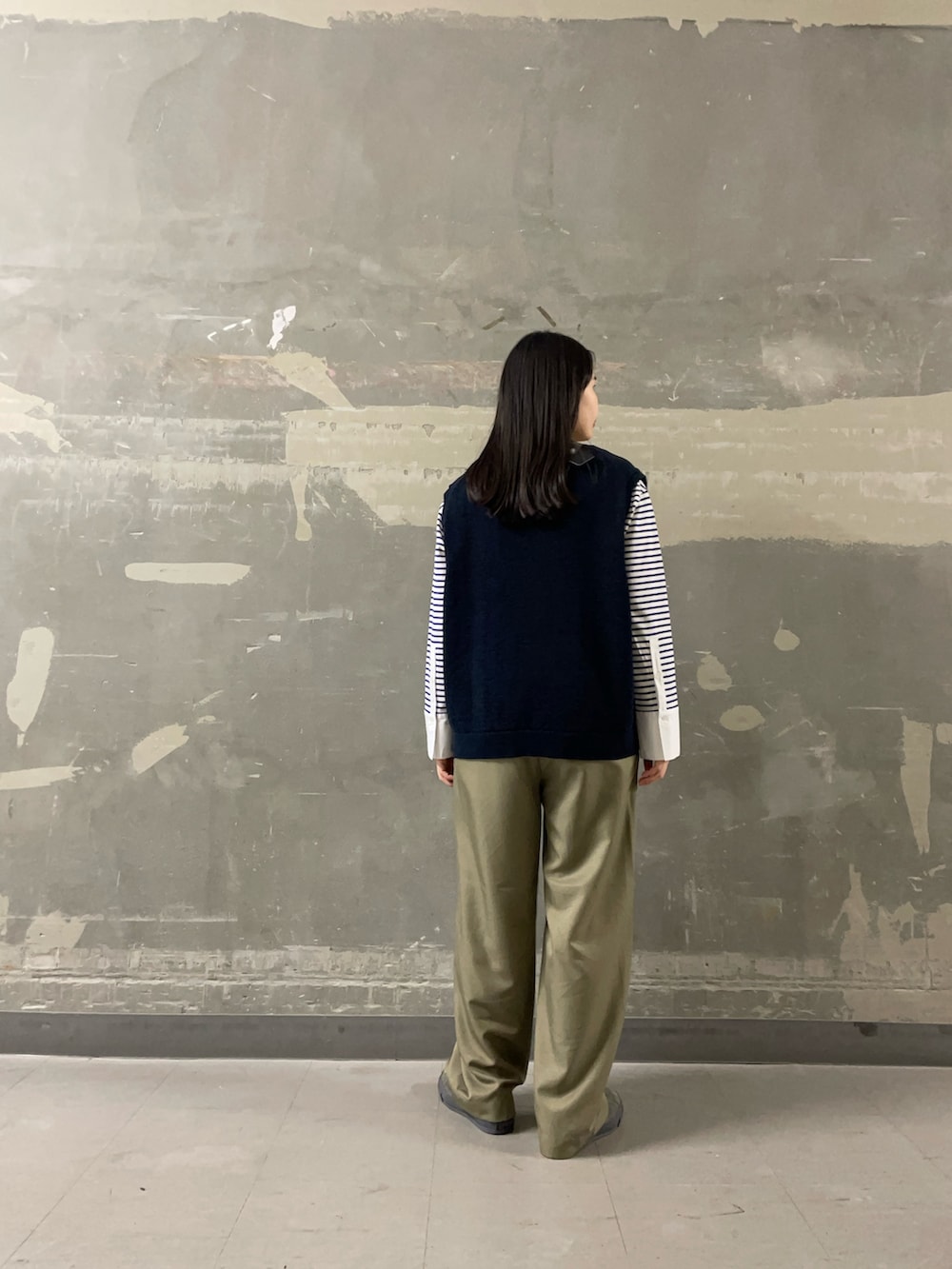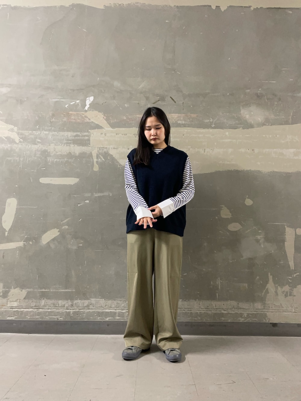 ニットベストを重ねることで、袖のボーダーがアクセントになりシンプルながらも表情のあるスタイリングに。