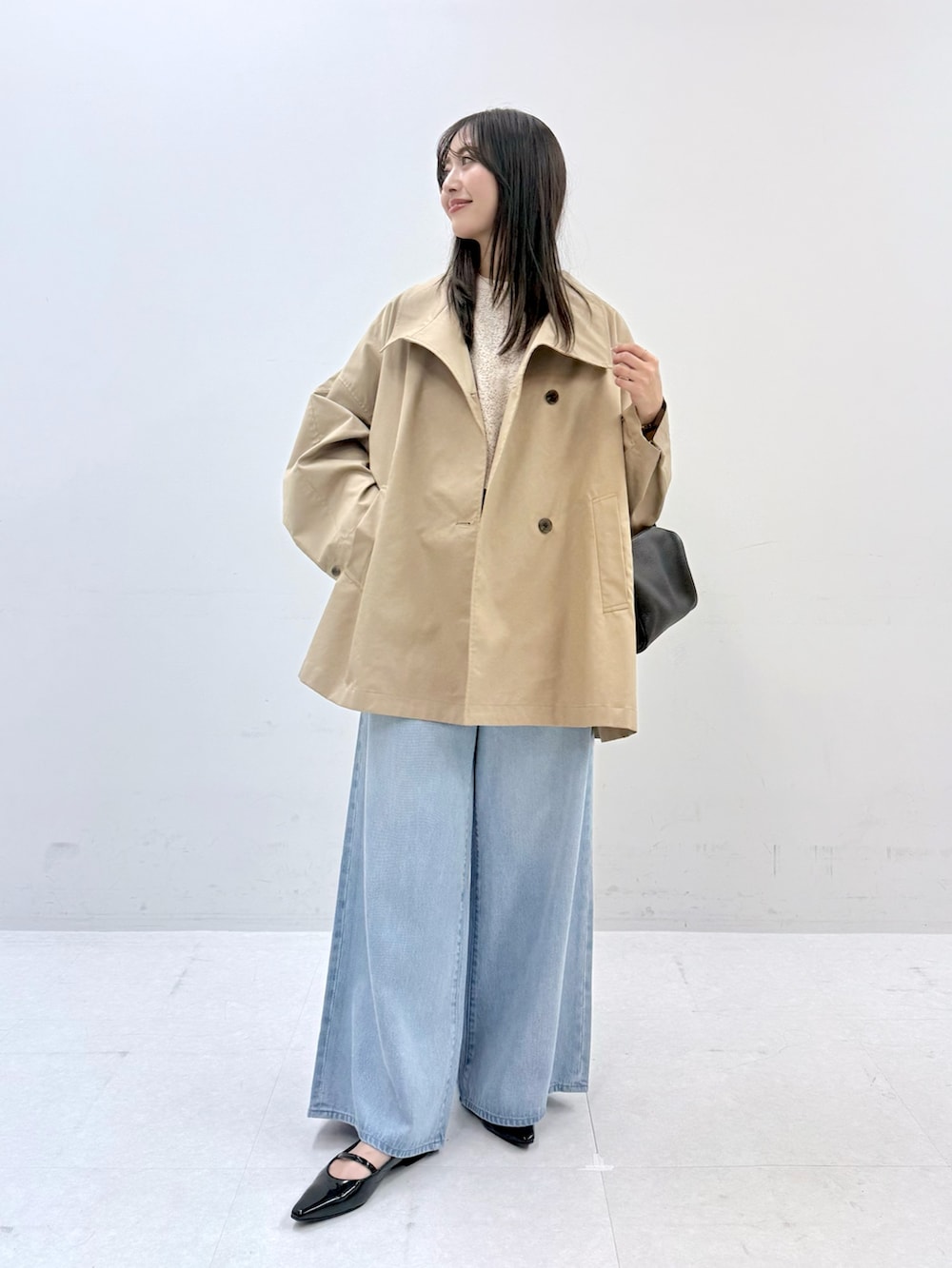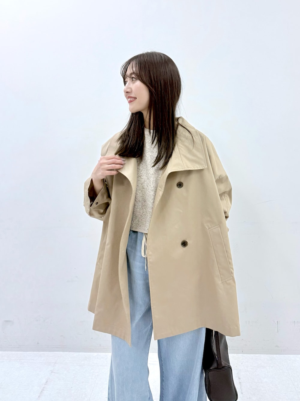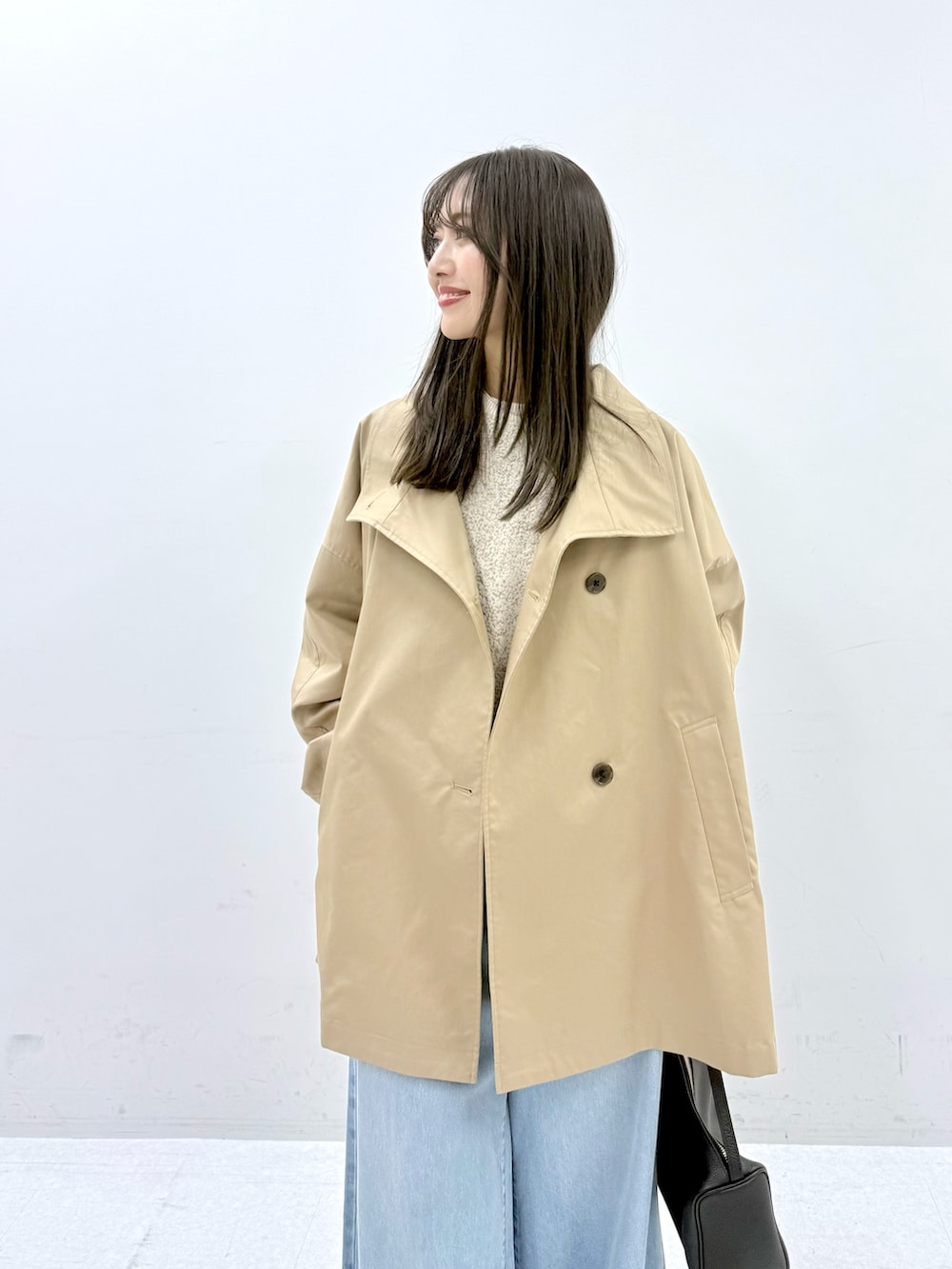 コートは見た目以上に軽くさらっと羽織りやすいです。首元のボタンを留めて着てもシルエットが可愛くてお気に入りです。