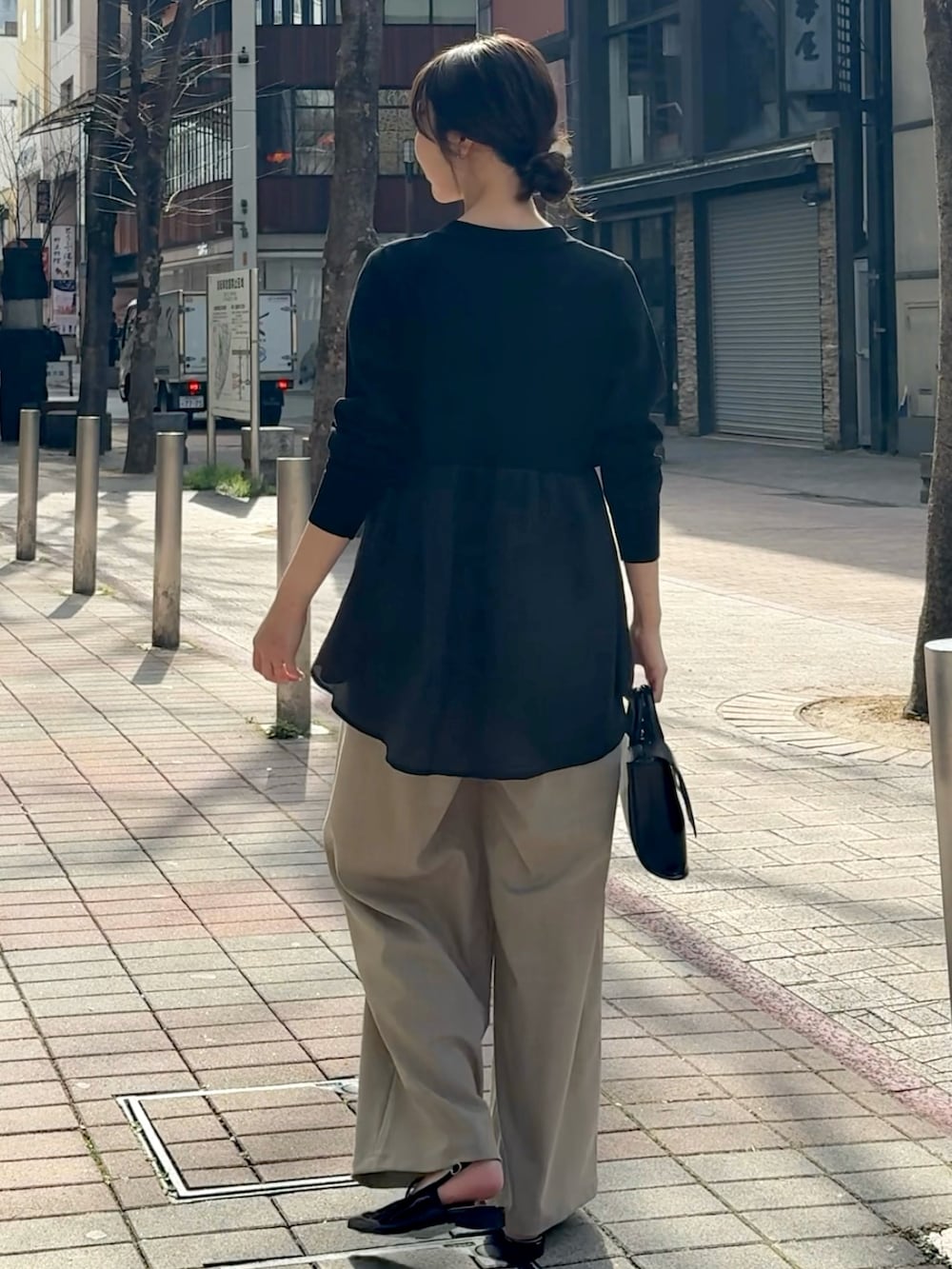 ニットとシアー素材を贅沢に使用した異素材デザインで着痩せ効果抜群のペプラムシルエットになっています。