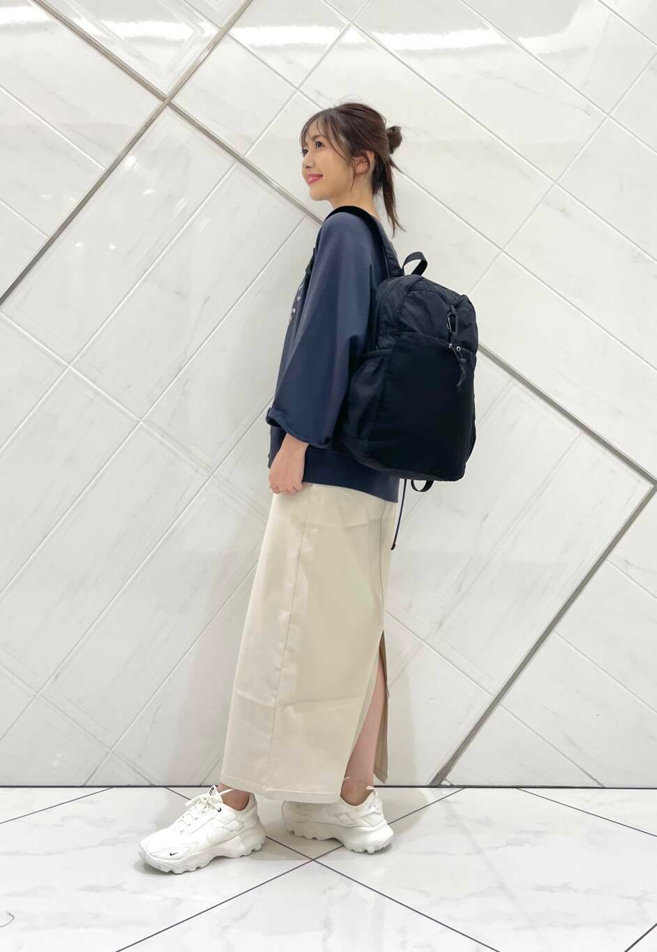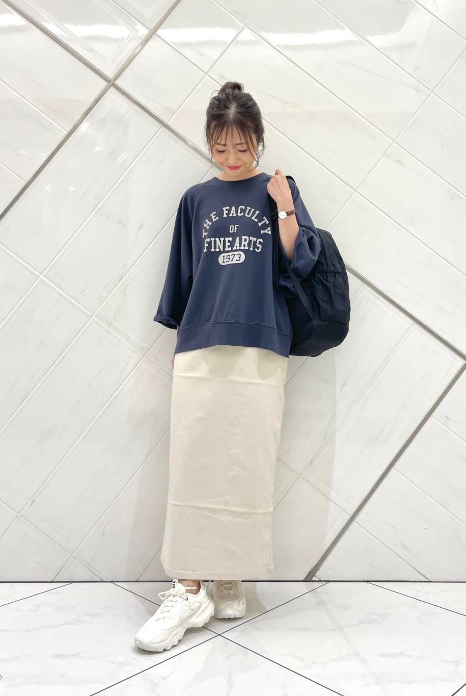スカートはSENSE OF PLACEのアイテムでストレッチがかなり効いており、シーズン問わず着用ふることができ、洗濯もガンガンできるのも嬉しいポイントです!