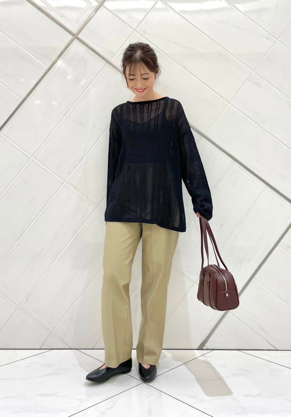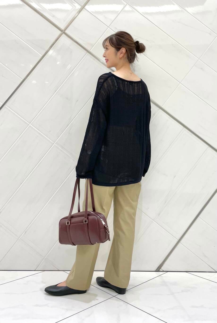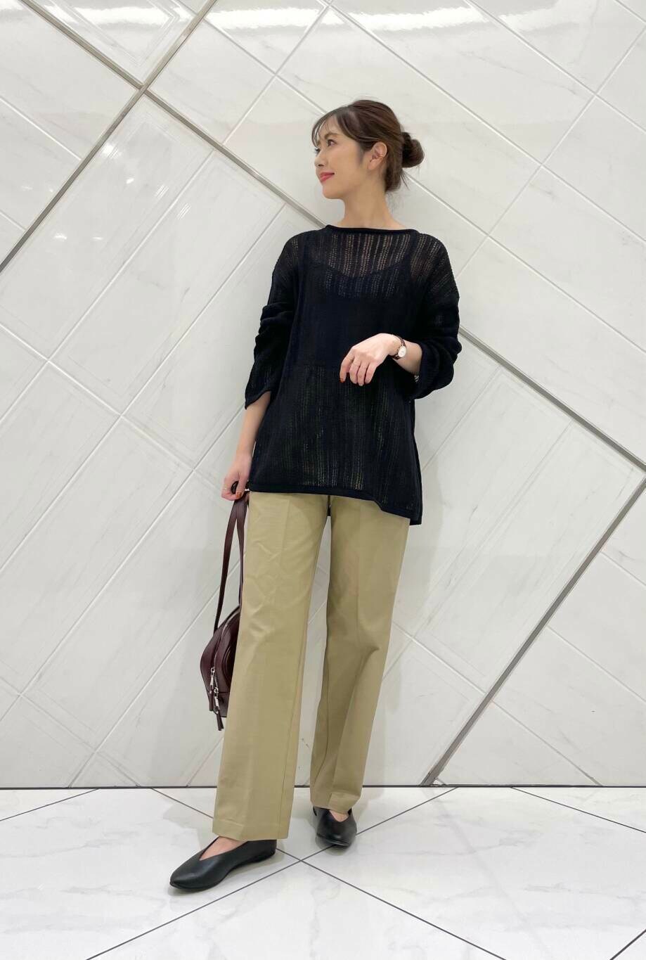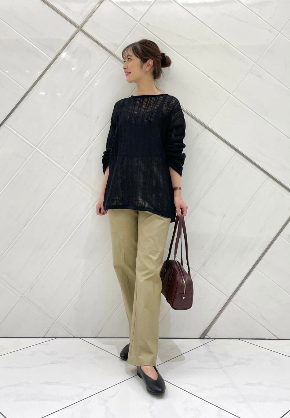 ニットはしっかりめの生地でドライタッチな肌触りです。透け感があるのでインナー次第でも雰囲気を変えていただけます。