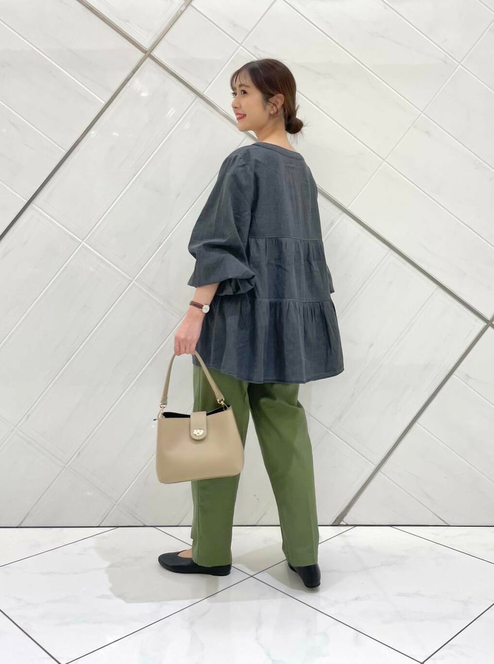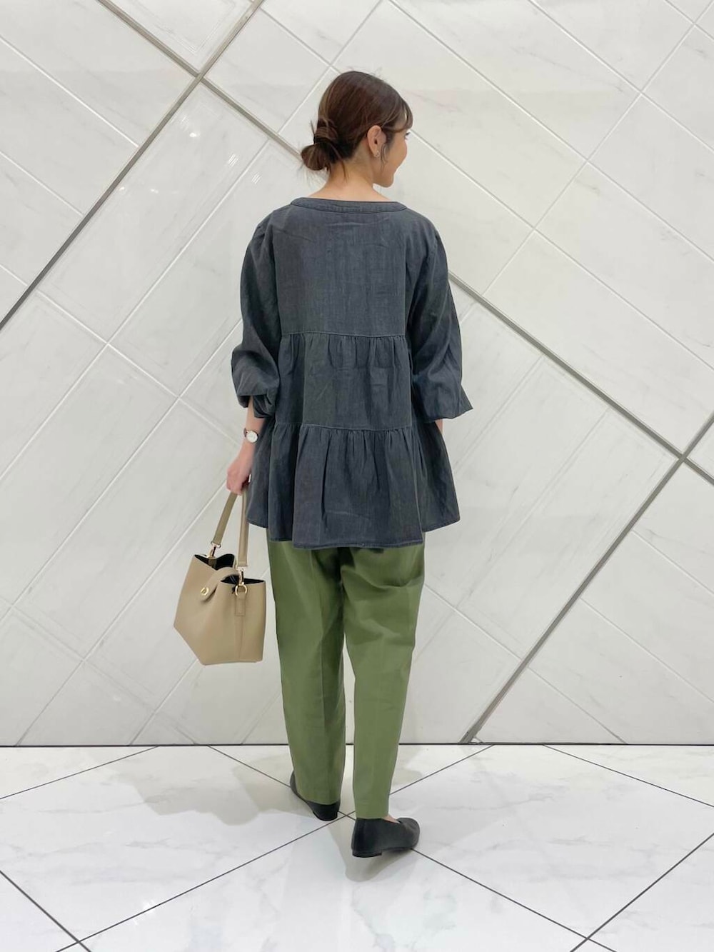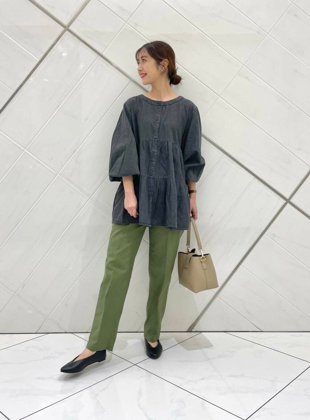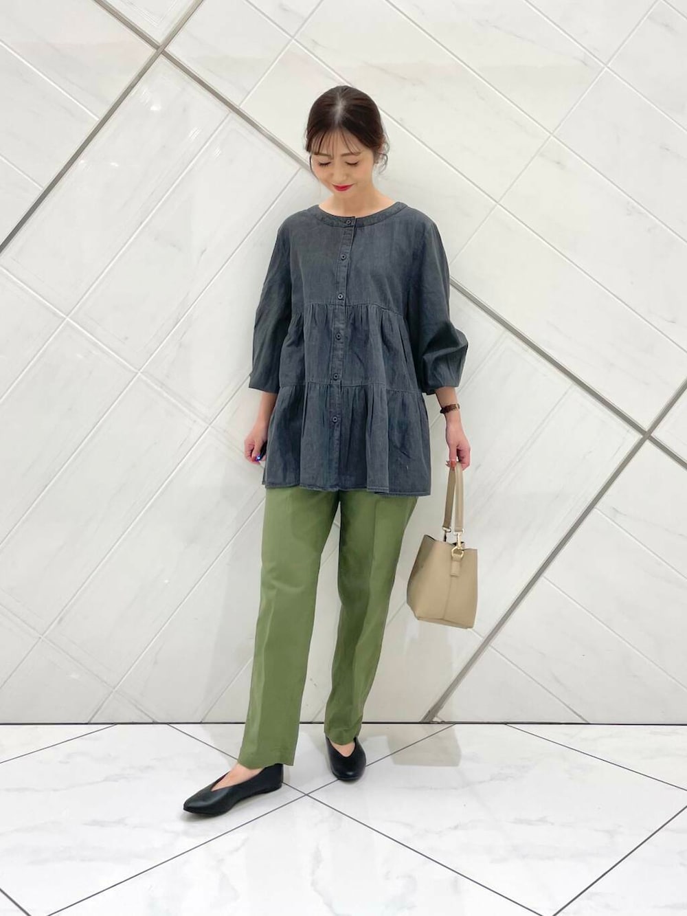 ブラウスは薄手でさらっとした柔らかな肌触りなので着心地も良く、チュニック丈なので腰回りもカバーできます。