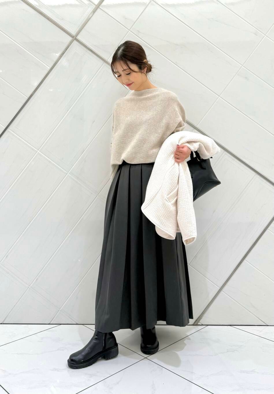 首周りはすっきりとしたボトルネックで袖はドルマンスリーブになっているのでまくった時のたるみが可愛らしいです。