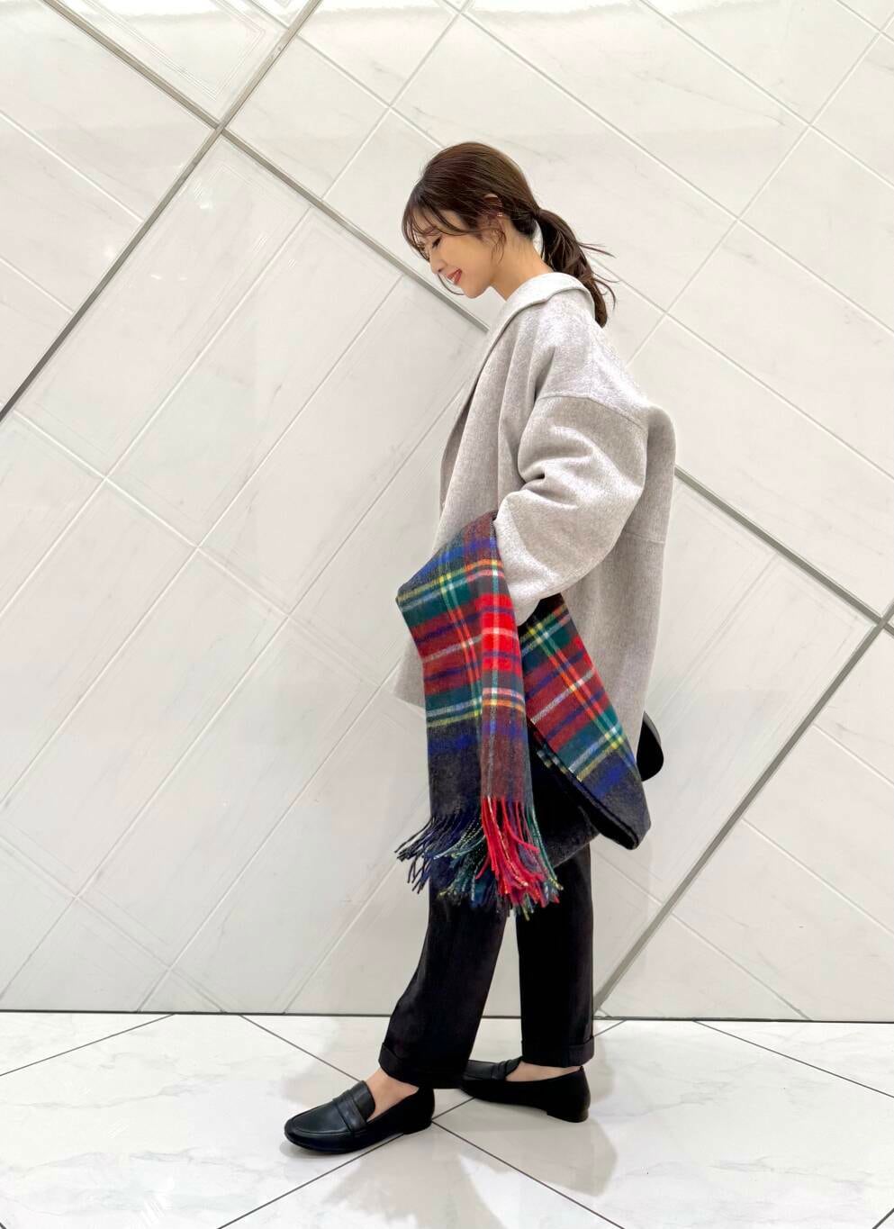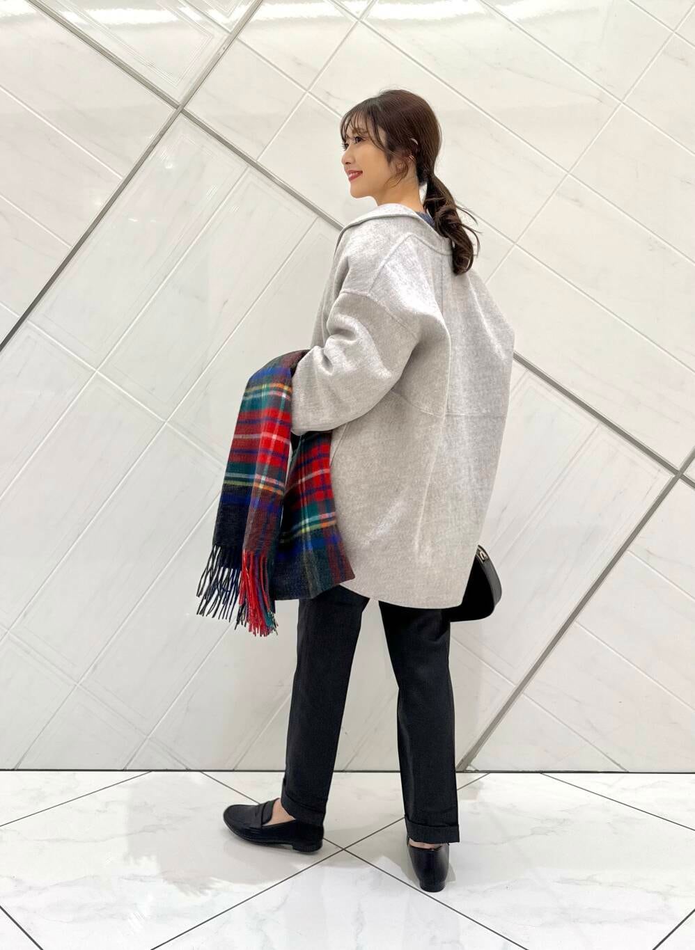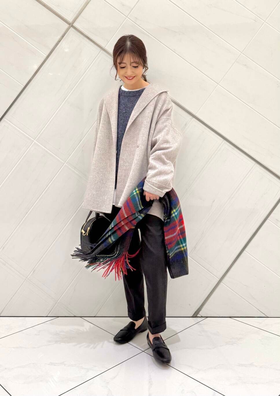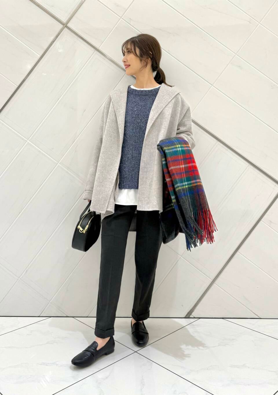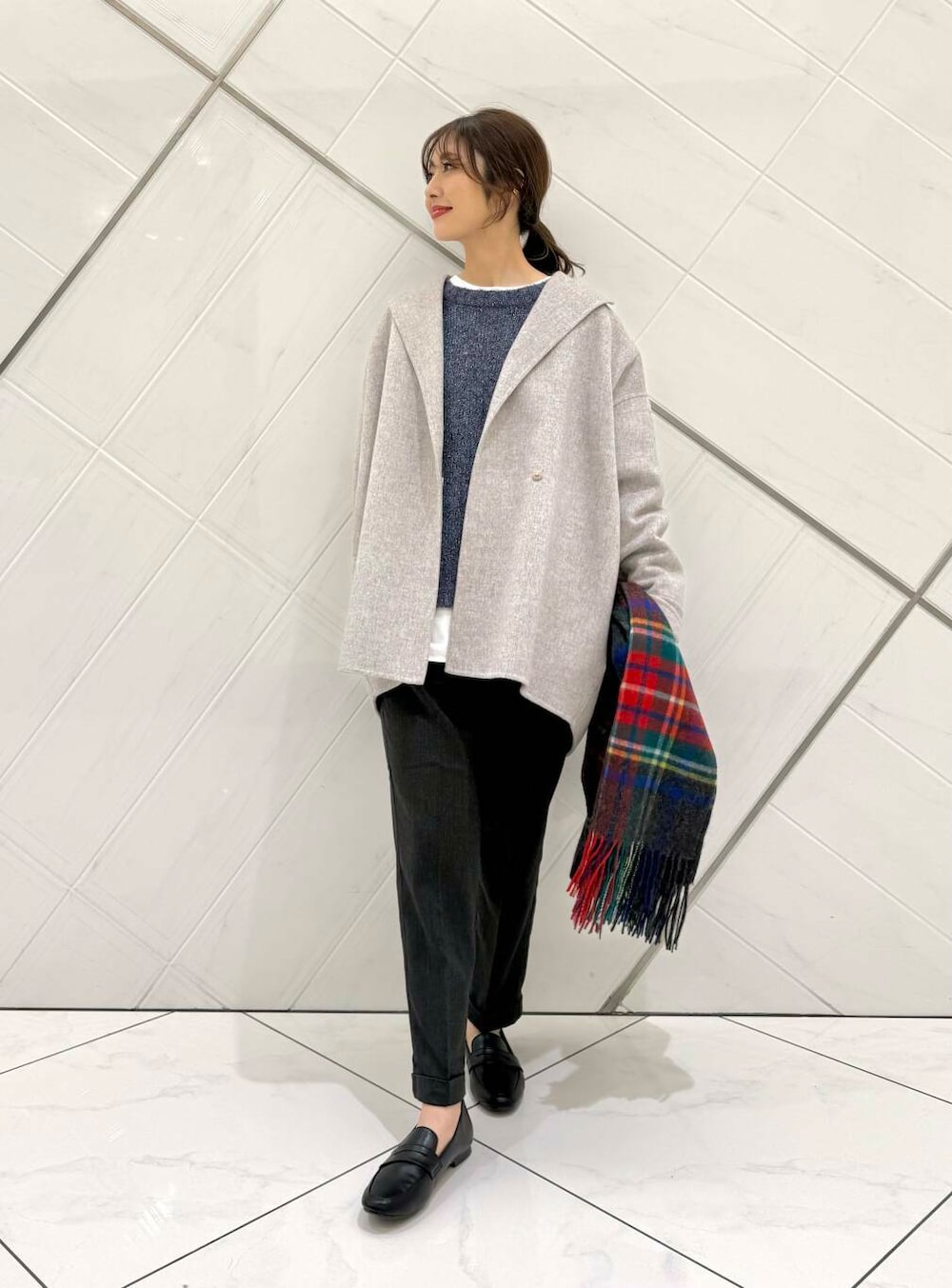 アウターは滑らかな肌触りのウール素材で裏地のない1枚仕立てなので軽くて楽に羽織れます。