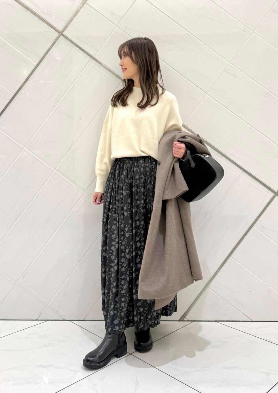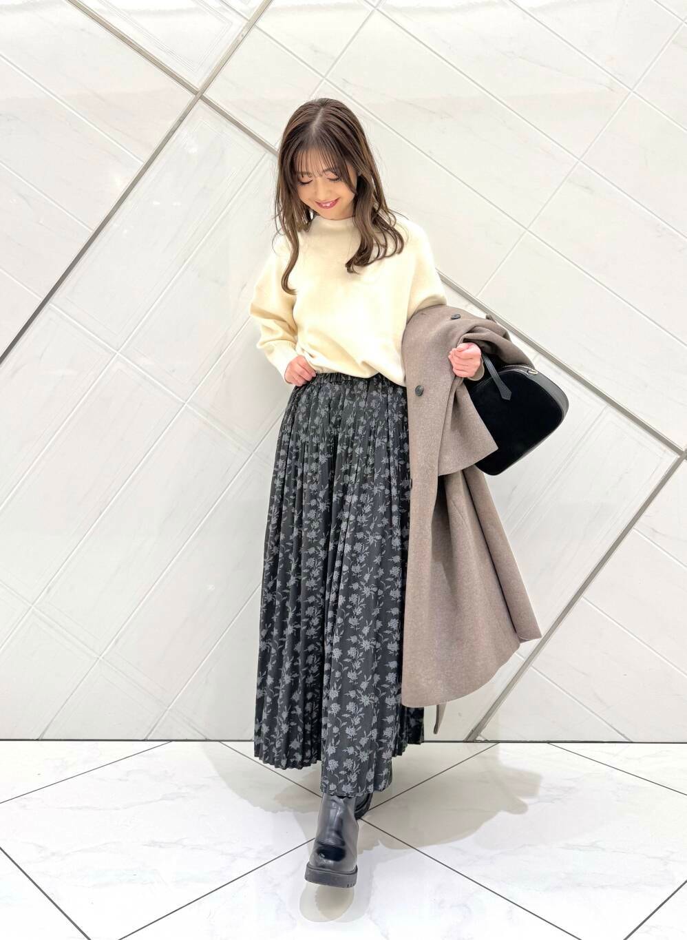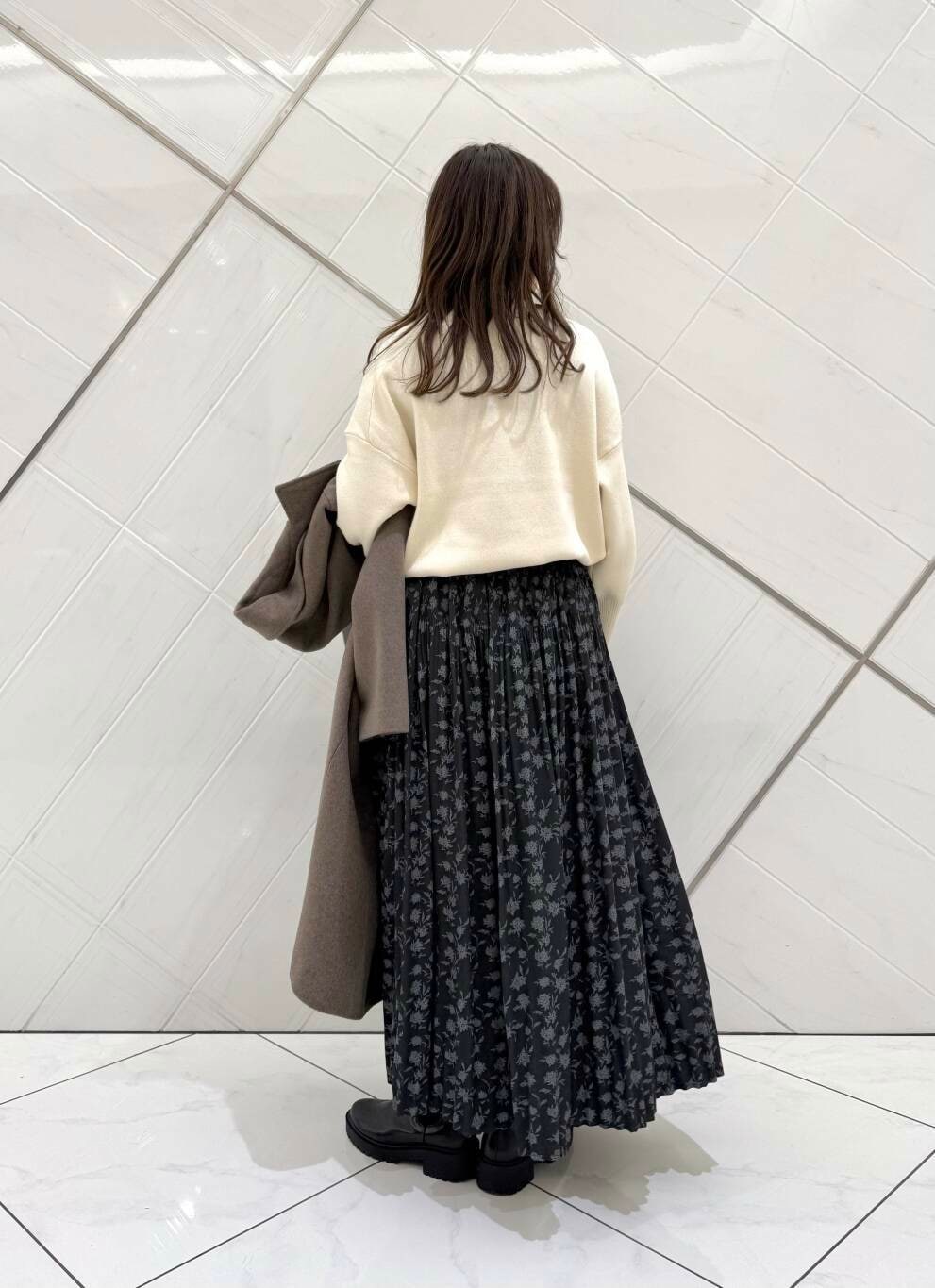スカートはウエストが総ゴムになっており、リボン調整ができます。細かなプリーツで主張しすぎない花柄がコーディネートにさりげなくアクセントになります。