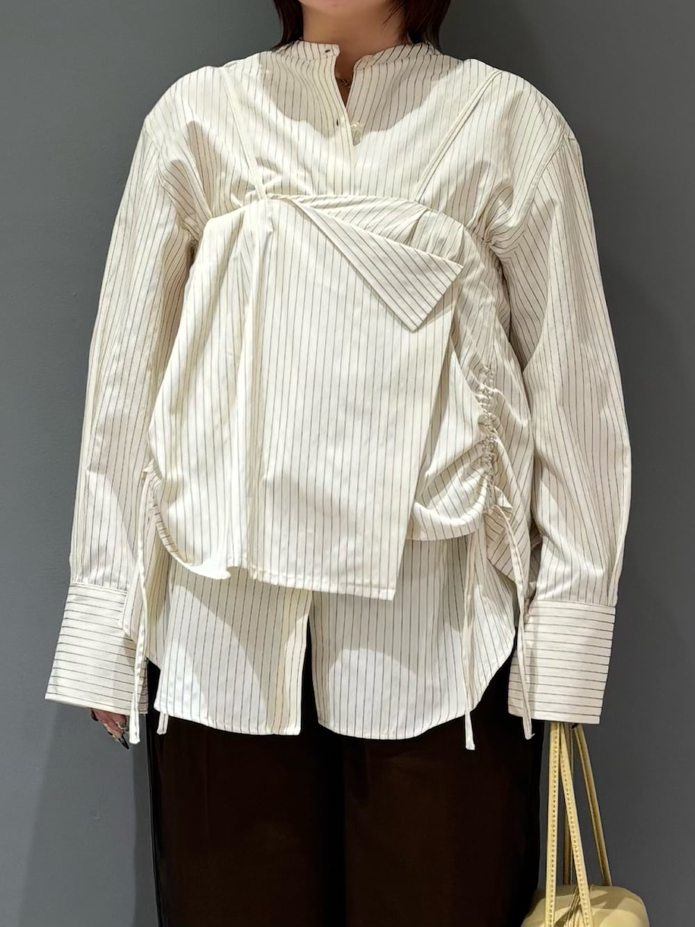 ストライプ柄のバンドカラーのシャツは使いやすいカラーとシンプルなデザインなので、パンツやスカート問わず使っていただけます!