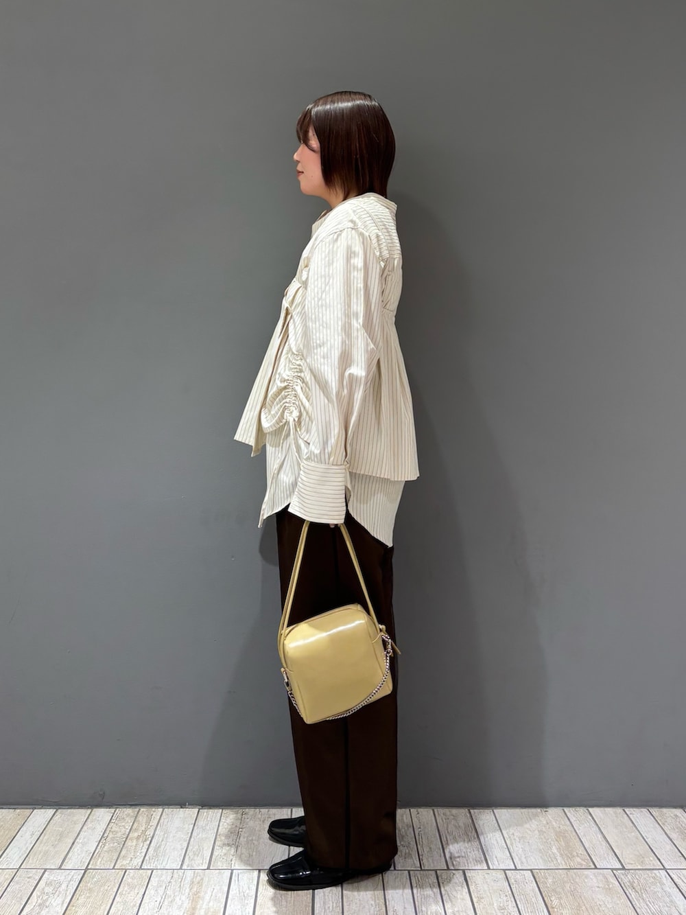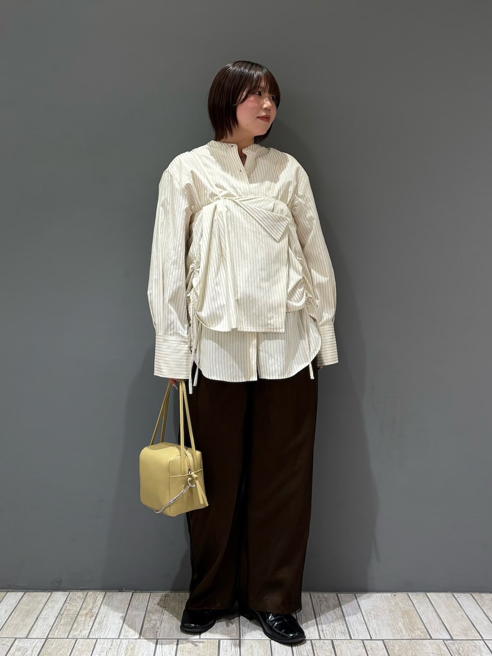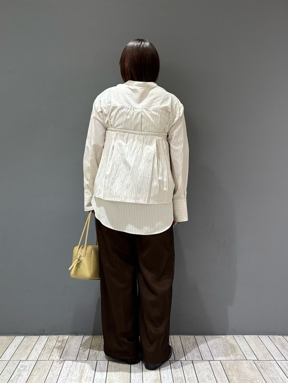 着てみた感じ、シャツはジャストサイズより少し大きめのサイズ感でした!バンドカラーなのでボタンを一番上まで閉めると首が詰まって見えるので、骨格ストレートさんはボタンを開けるとスッキリして見えますദ്ദി ῀ᢦ῀ )