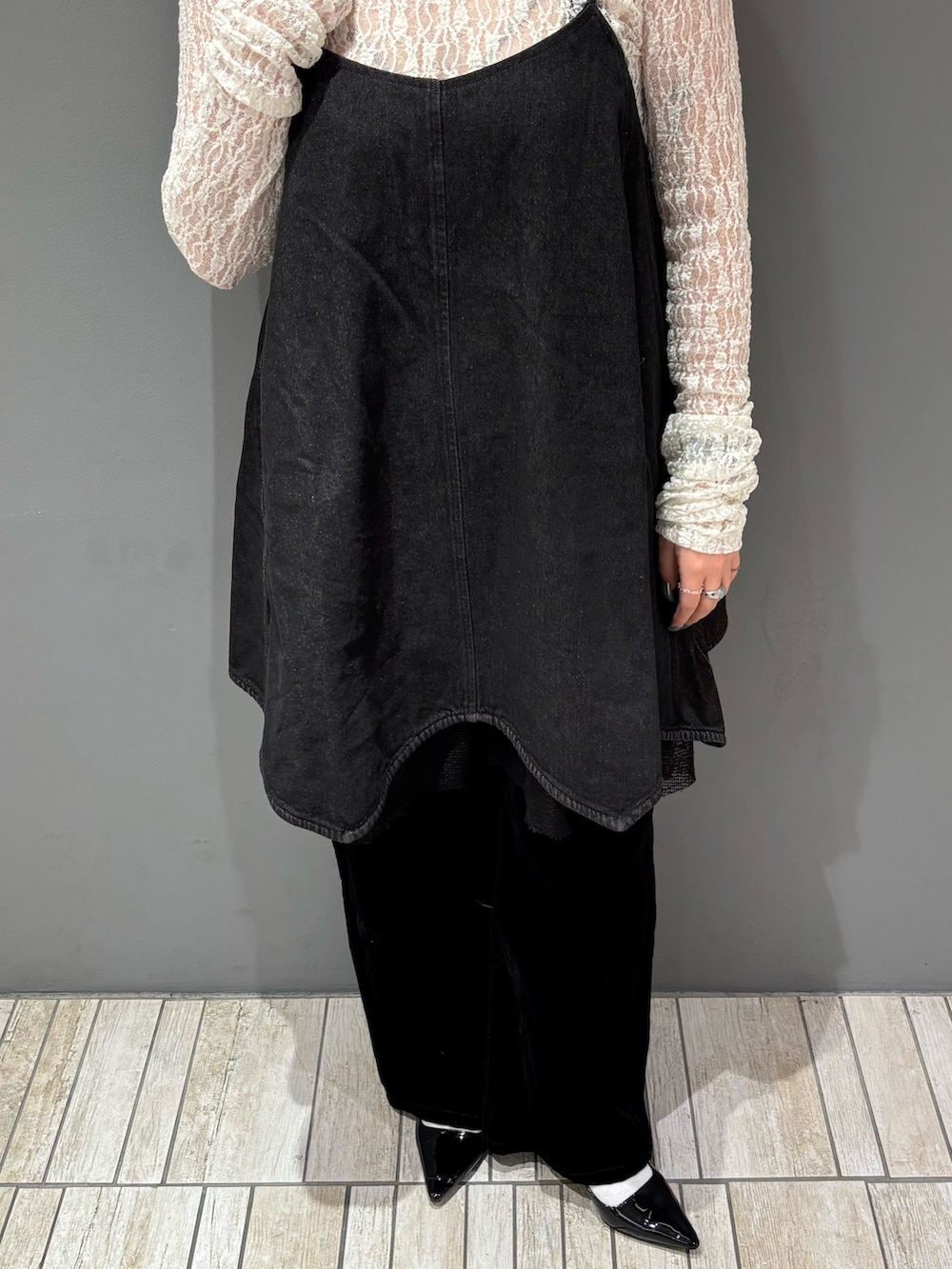 デニムのキャミワンピースにメッシュ素材がレイヤードされたKBFらしいデザインに✌🏻シルエットがAラインなので下半身カバーにも🙆🏻♀️
