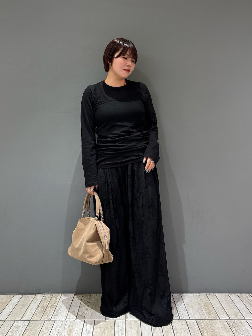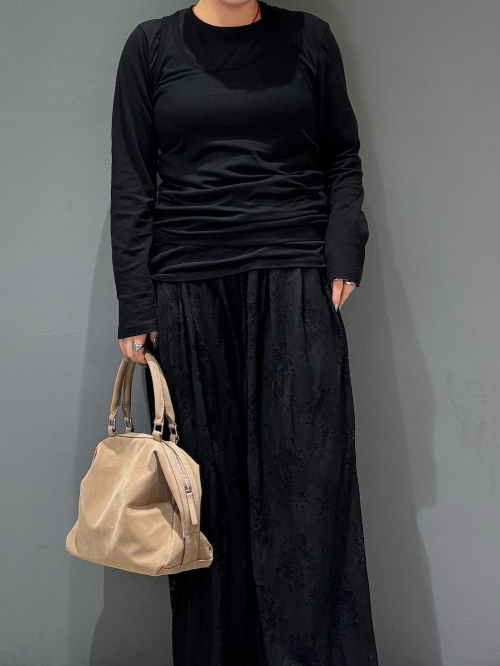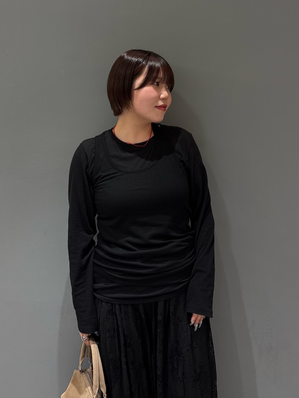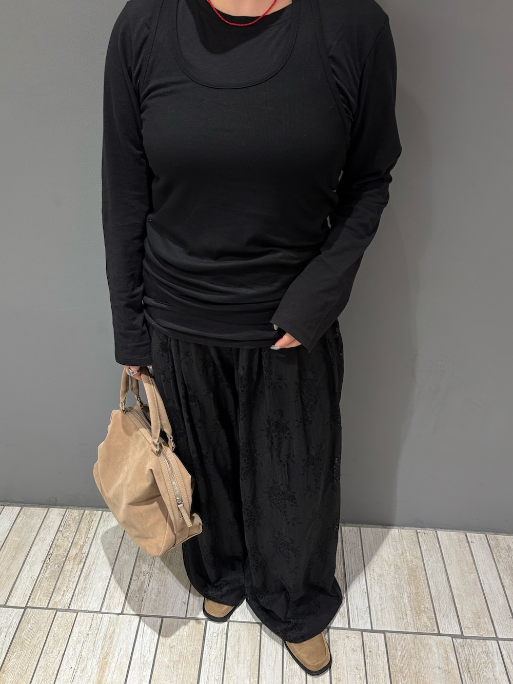 ・コーデの差し色にネックレスの赤、シューズとバッグのベージュを入れてオールブラックが重くなりすぎないようにしてみました.ᐟ.ᐟ.ᐟ